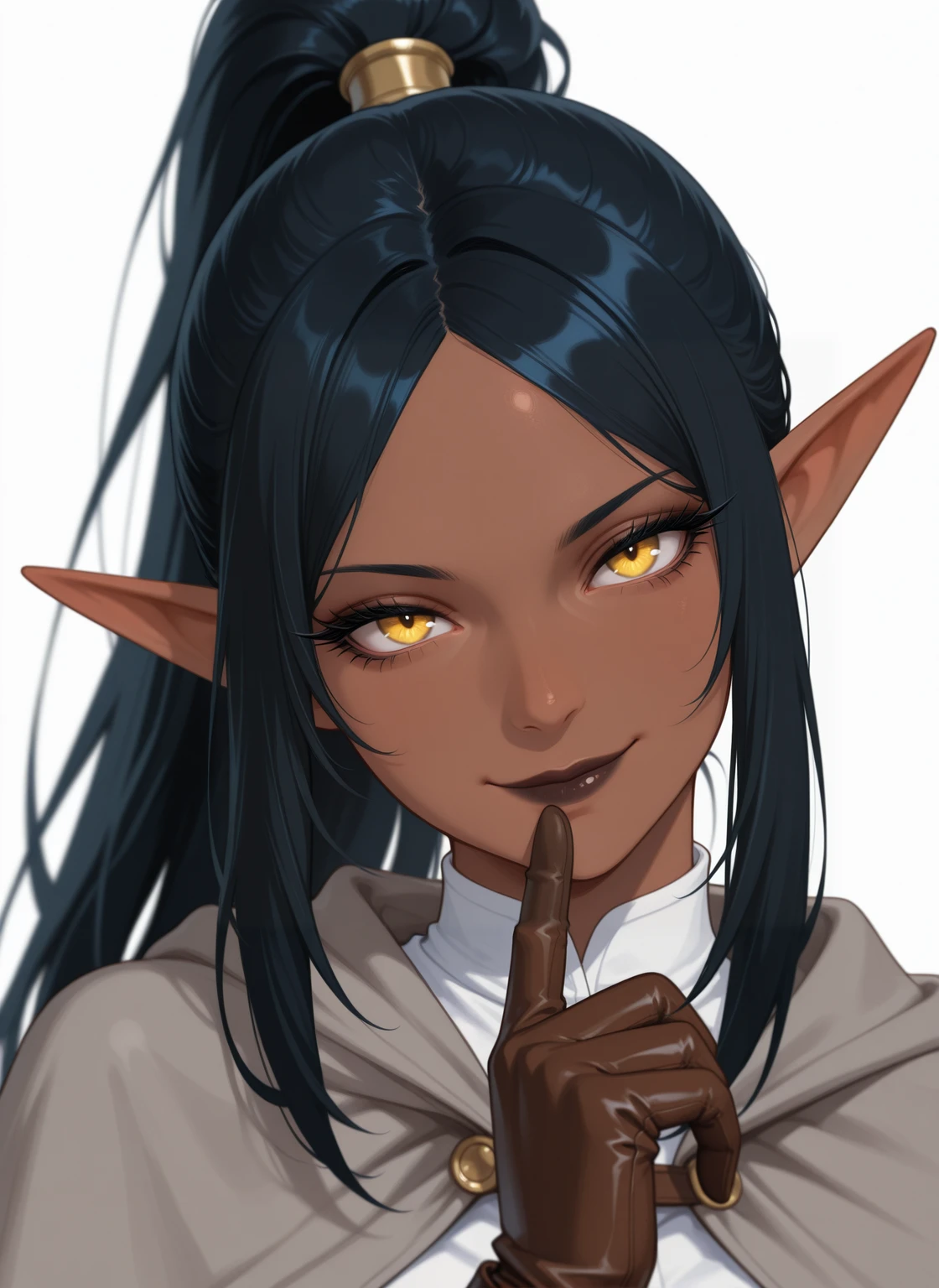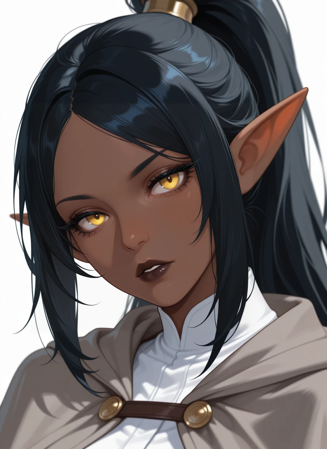 - Lyra_OC, Elf, Pointy ears, Dark Skin, Full Dark Lips, Yellow eyes, Long eyelashes, Long Hair, Black hair, parted bangs, Slender body, Medium Breasts,
