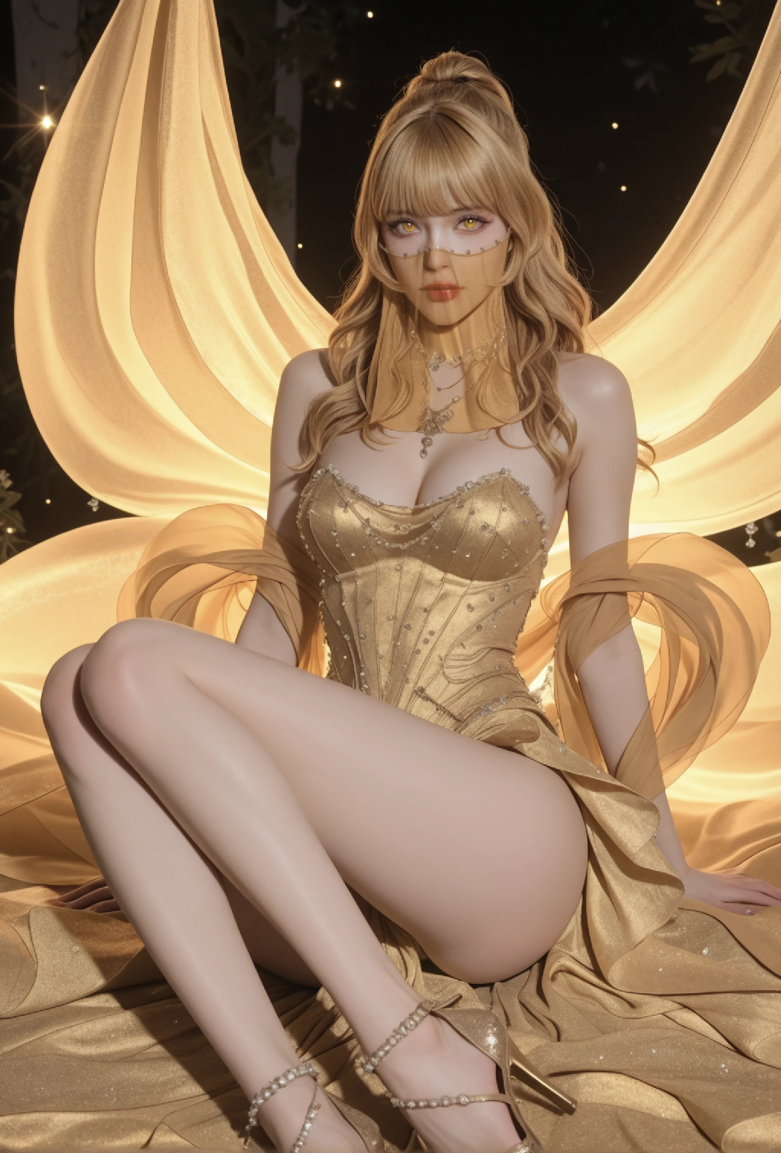 Character: 1girl, Jin geum yong, solo, eyelashes, glowing_eyes, yellow_eyes, red lipstick, long_hair, wavy_hair, blonde_hair, high_ponytail, half_updo, hime_cut, blunt bangs, hair_over_one_eye, hair_ornament, hair_flower, veil, face_veil, jewelry, earrings, necklace, ornate_necklace, gemstone, pendant, bare_shoulders, large_breasts, narrow_waist, wide_hips, strapless_dress, golden_dress, elegant_dress, floating_ribbons flowing_fabric, floating jewelry, around arms, around waist,