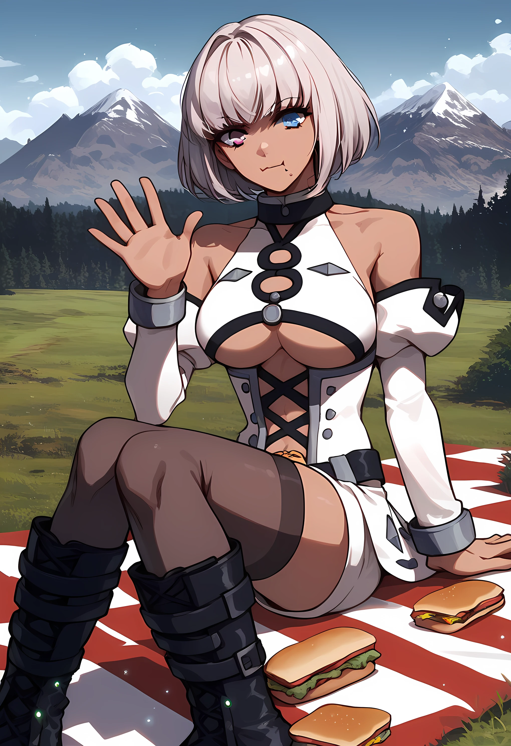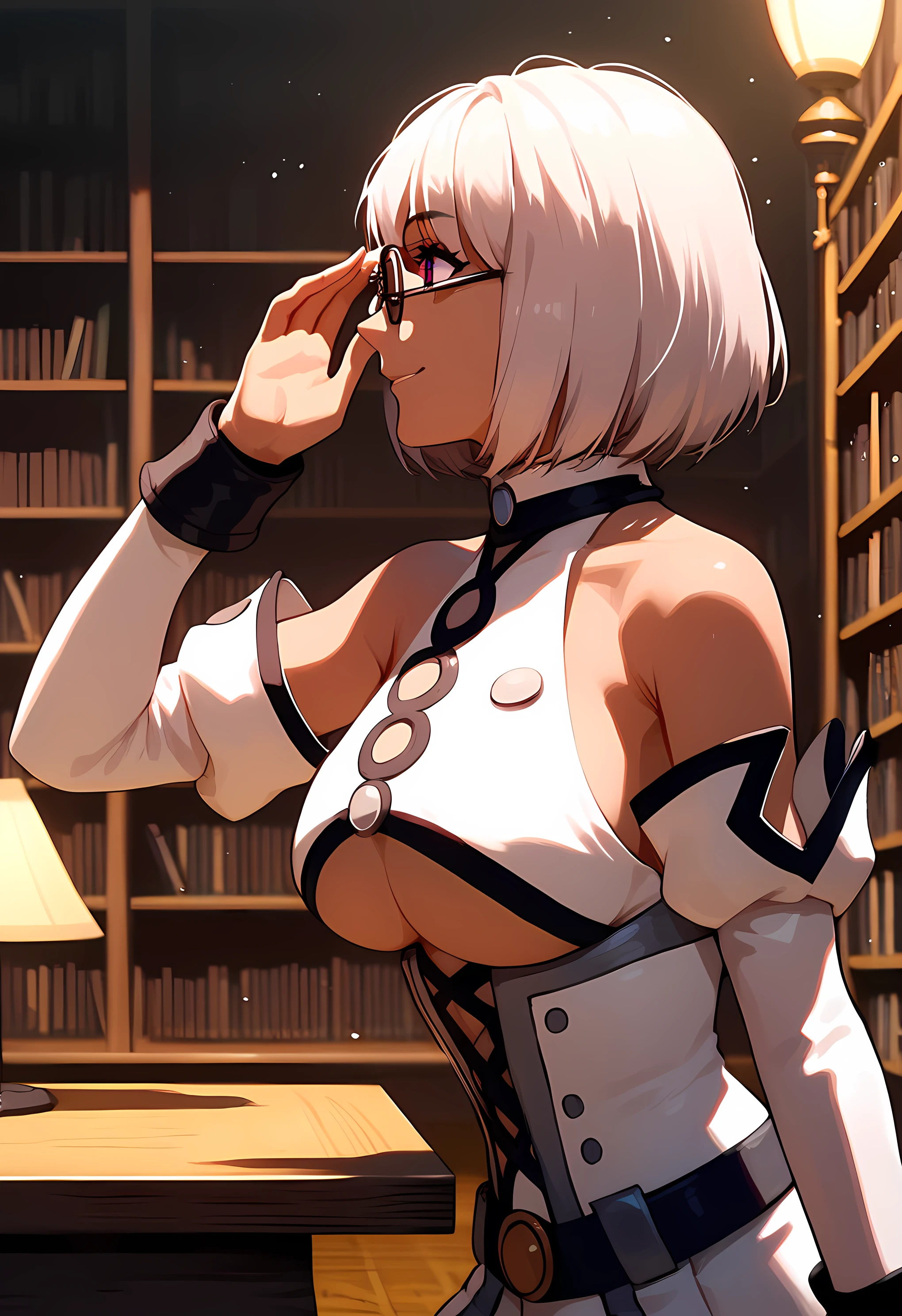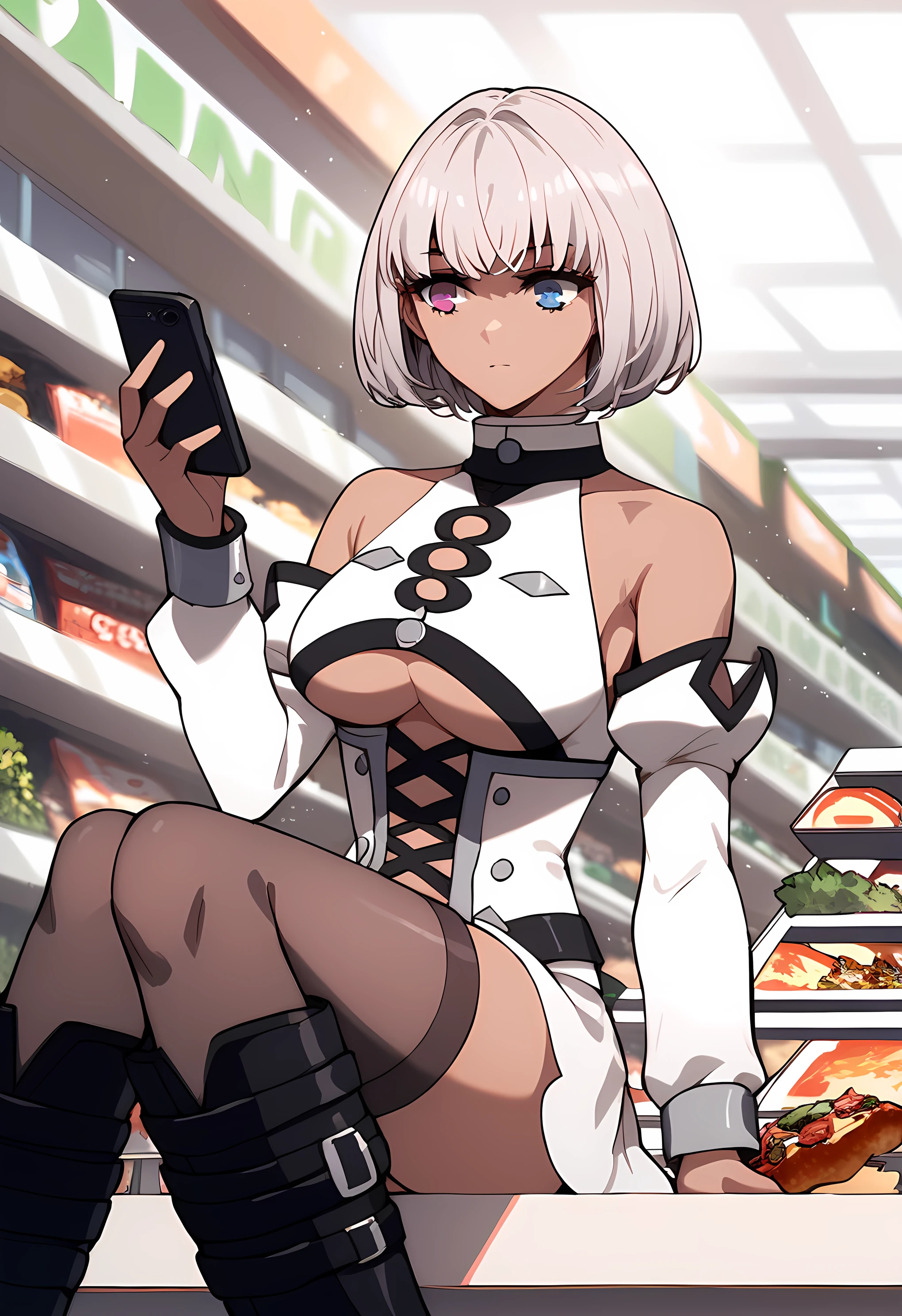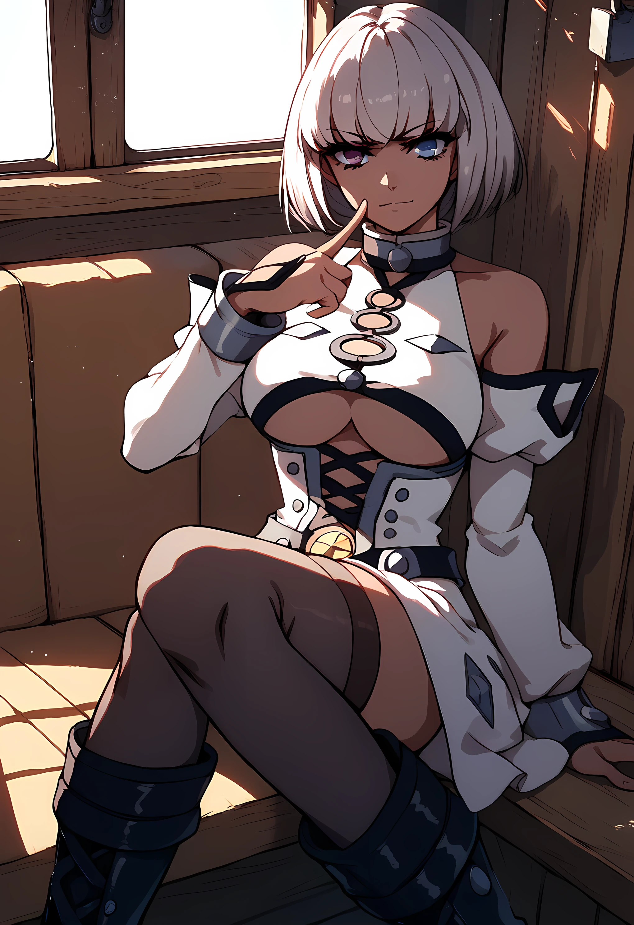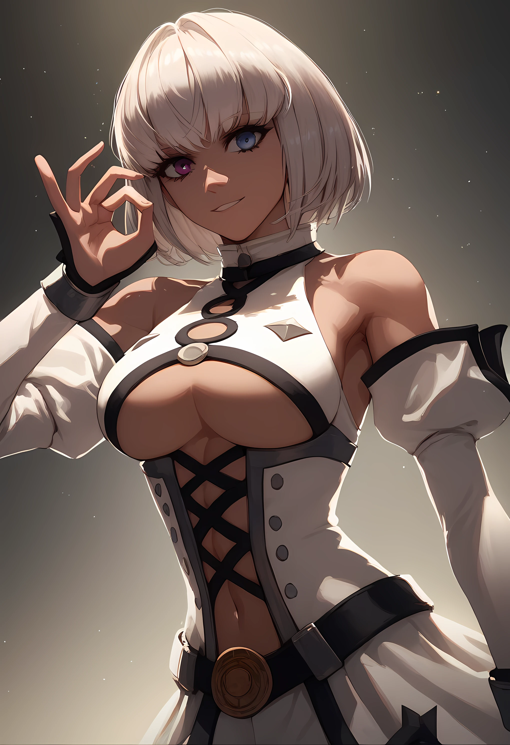 almaj_c111, 1girl, short hair, grey hair, dark-skinned female, heterochromia, large breasts, bare shoulders, underboob, detached sleeves