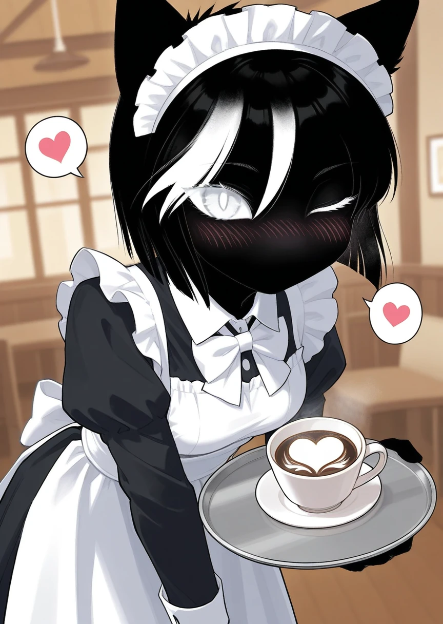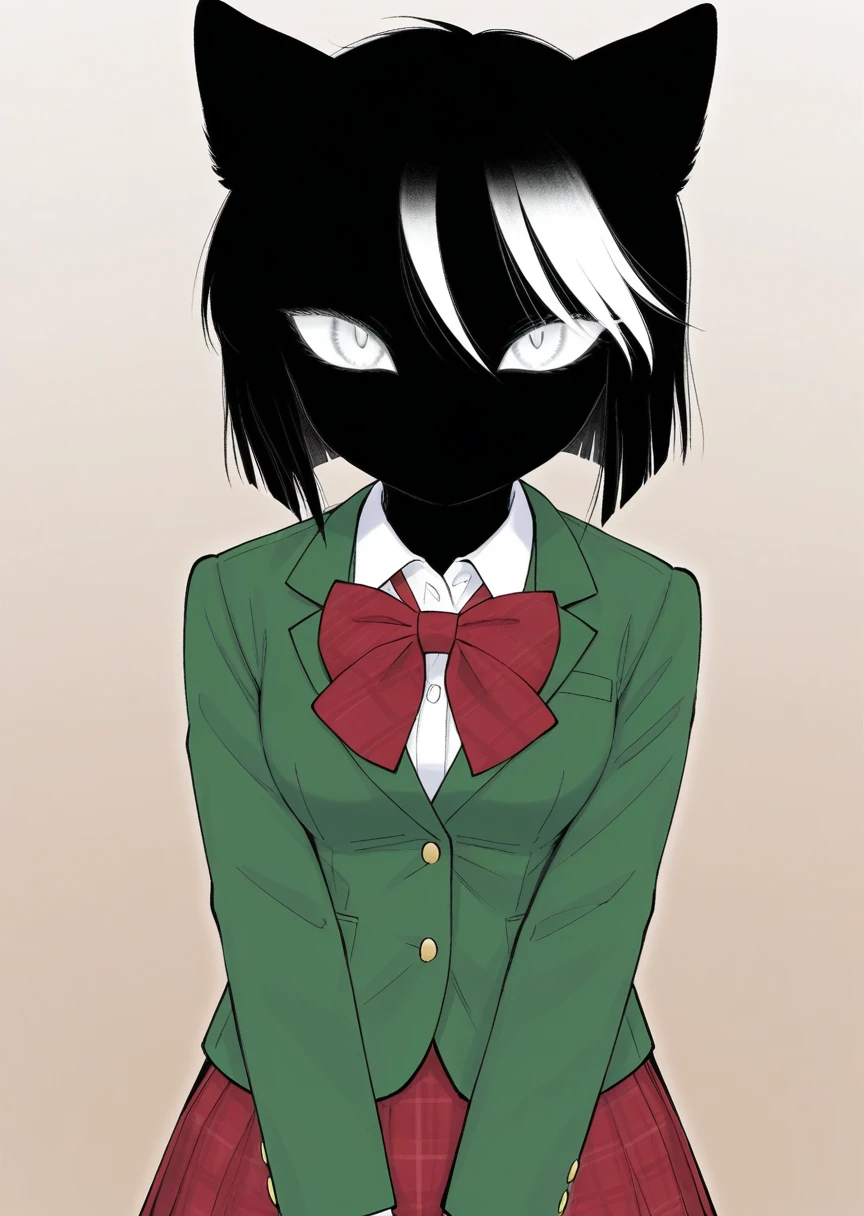 prompts: kuroi kuroneko, furry, pitch black fur, animal ears, short hair,white highlights, white eyes, no mouth, no nose, green school uniform, red skirt, white undershirt, red neck accessory,