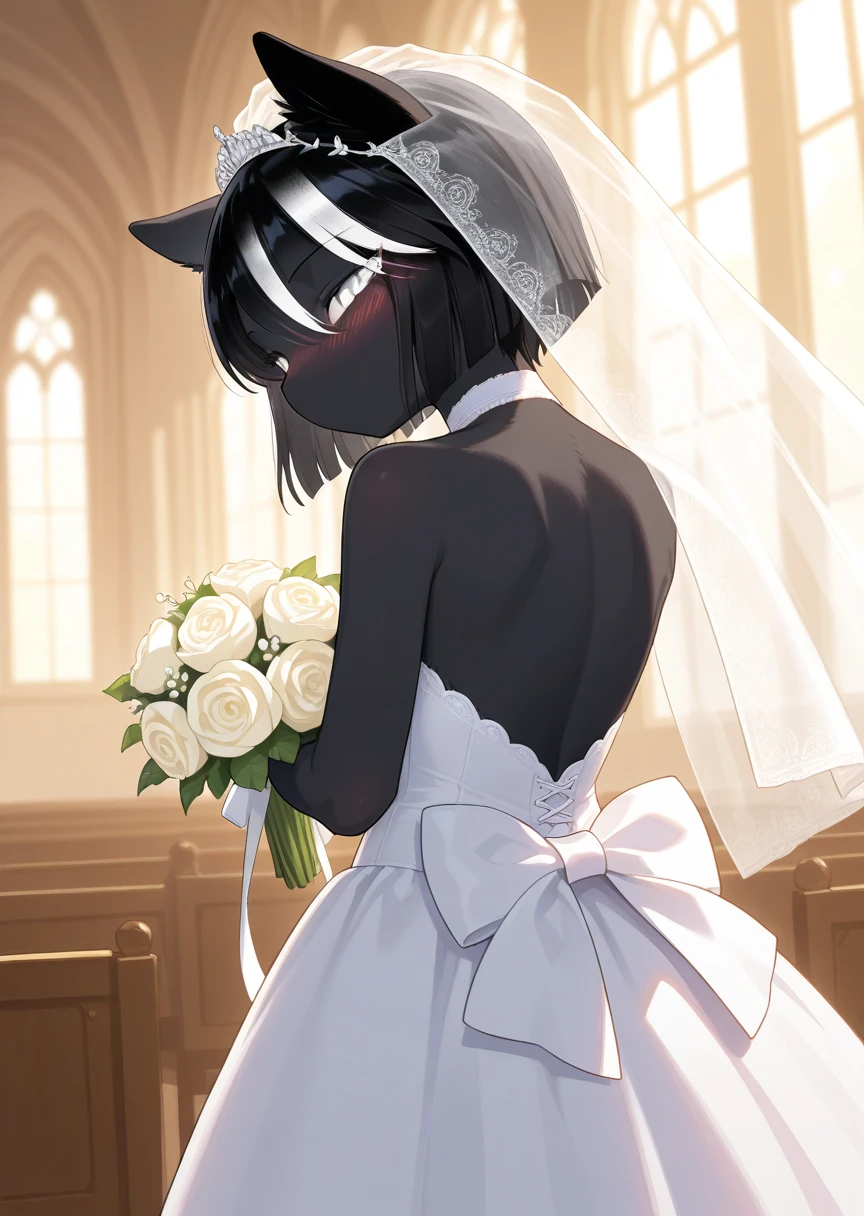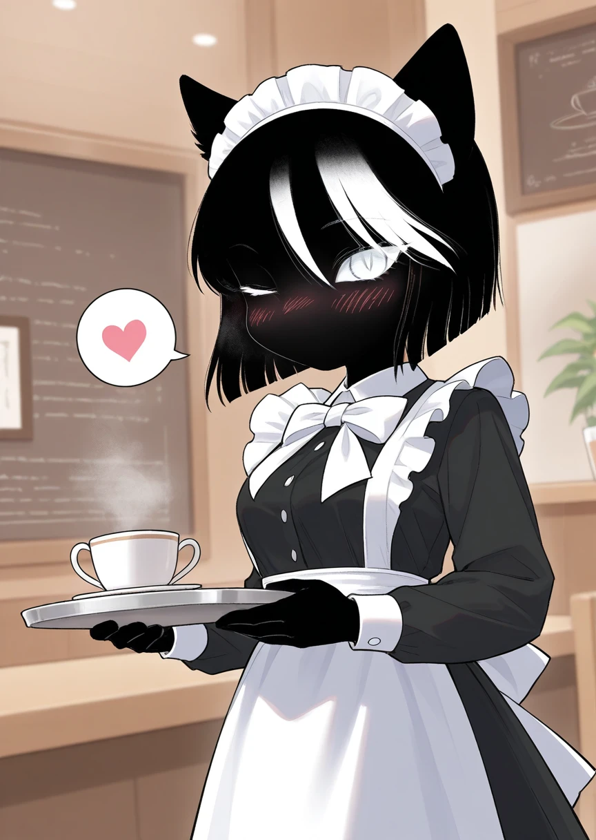 kuroi kuroneko, furry, pitch black fur, animal ears, short hair,white highlights, white eyes, no mouth, no nose, green school uniform, red skirt, white undershirt, red neck accessory,