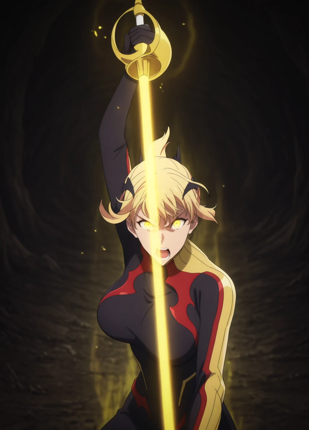 haein2, 1girl, solo, blonde hair, purple eyes, short hair, bodysuit, open mouth, looking at viewer, hair ornament, breasts, bat hair ornament, black bodysuit,large breasts, rapier,