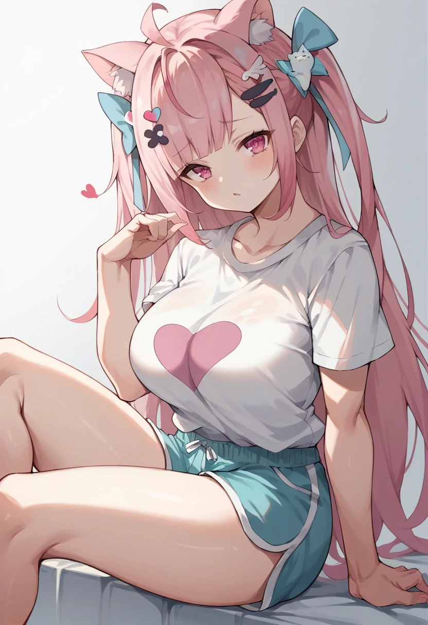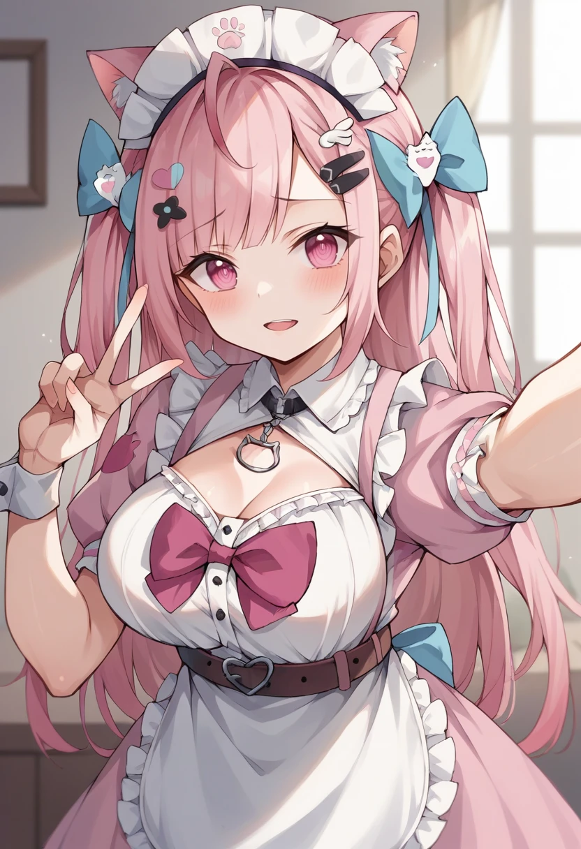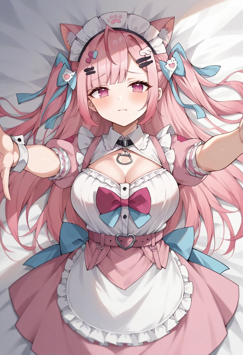 pink dress, apron, white apron, frills, hair bow, blue bow, maid apron, maid headdress, hair ornament, bandaid hair ornament, ghost hair ornament, heart hair ornament, paw print pattern, wing hair ornament, x hair ornament, choker, chest bow, pink bow, wrist cuffs, cat print, belt, back bow, cat ears