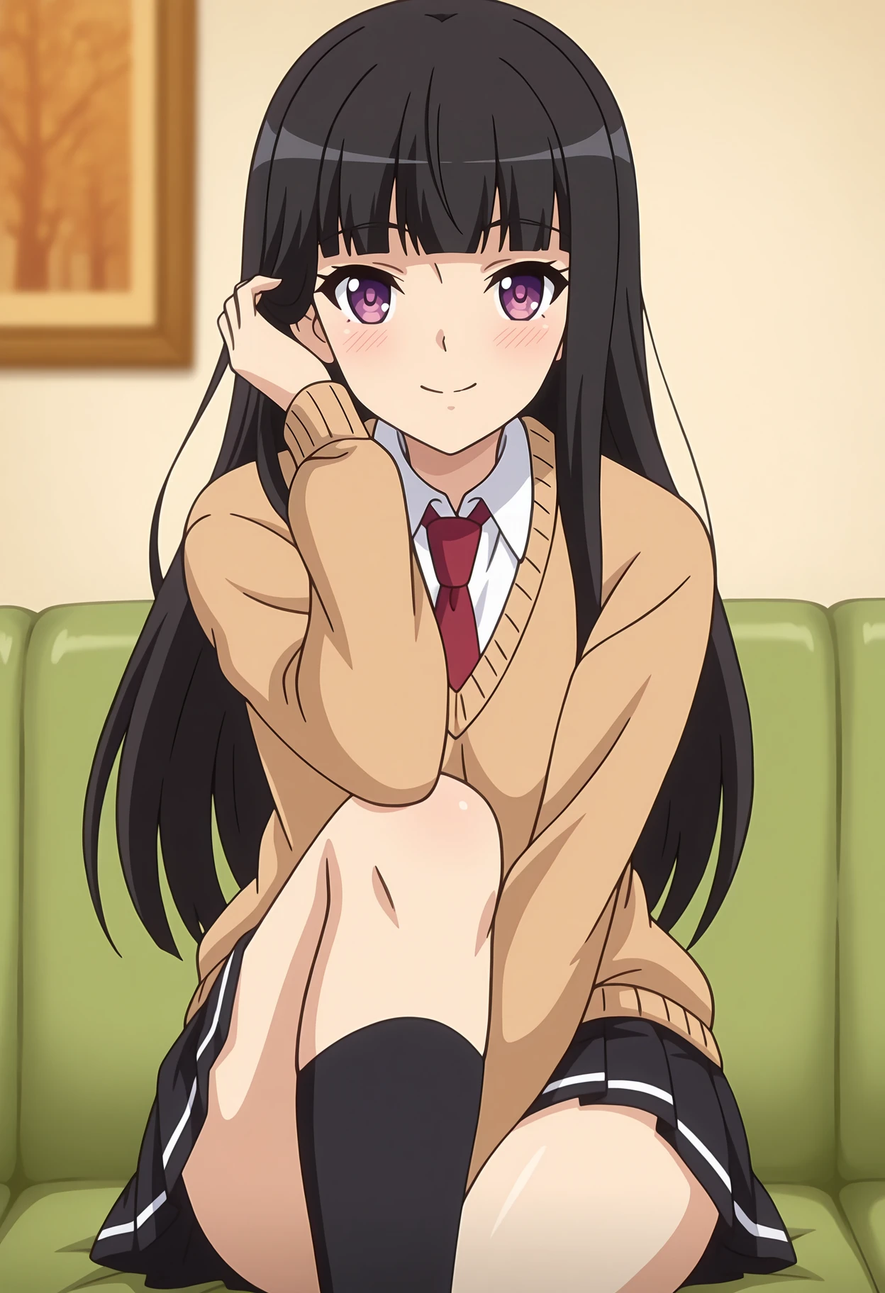 brown sweater, white shirt, red necktie, long sleeves, pleated skirt, black skirt, black socks