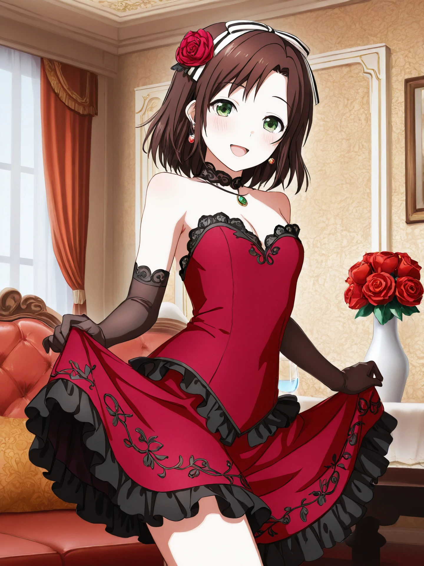 Prompts:saegusaizumi, brown hair, medium hair, green eyes, hair ribbonfirst high school uniform, green jacket, white dress, black necktie, long sleeves, long skirt, black thighhighs, black boots