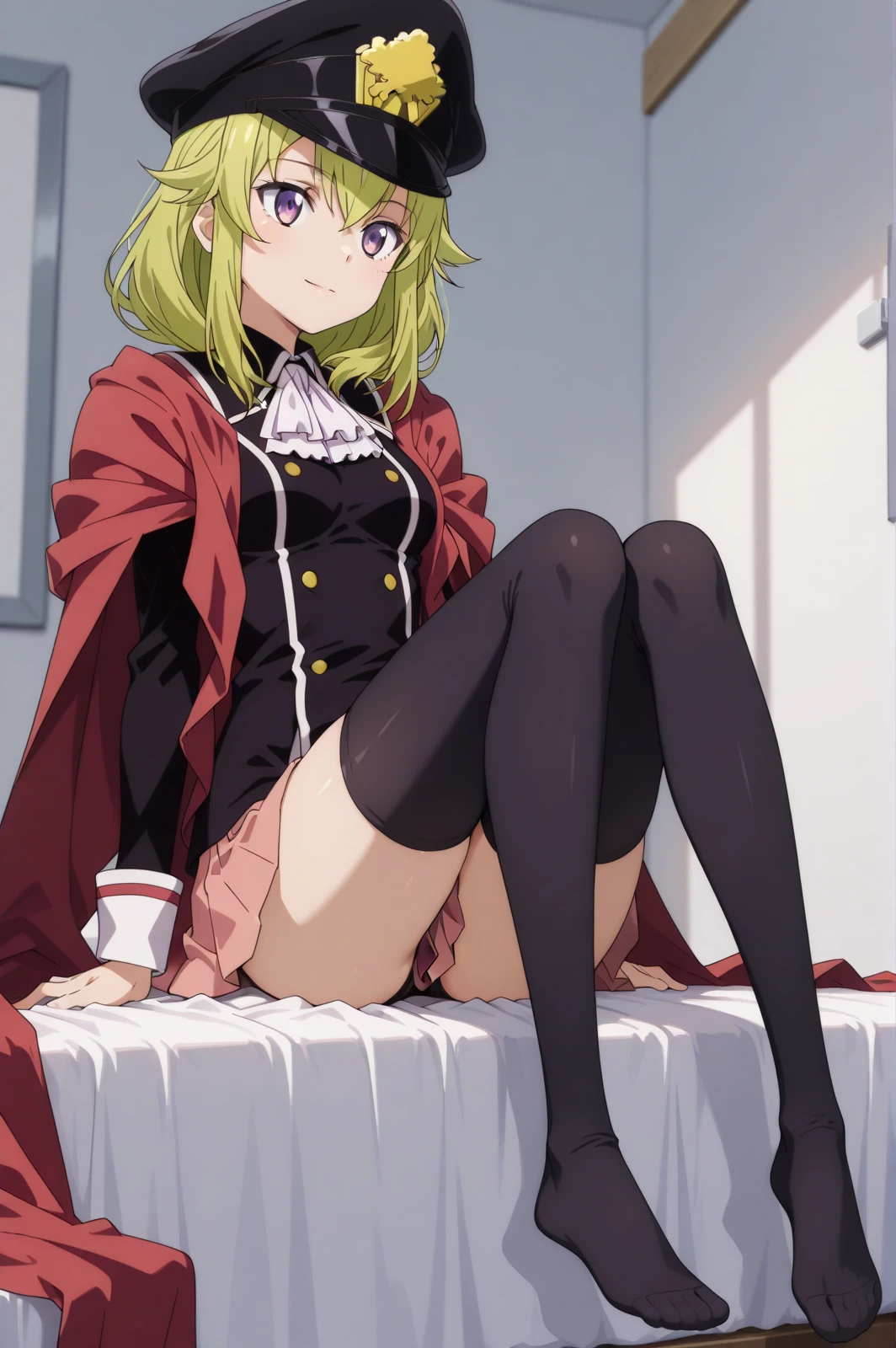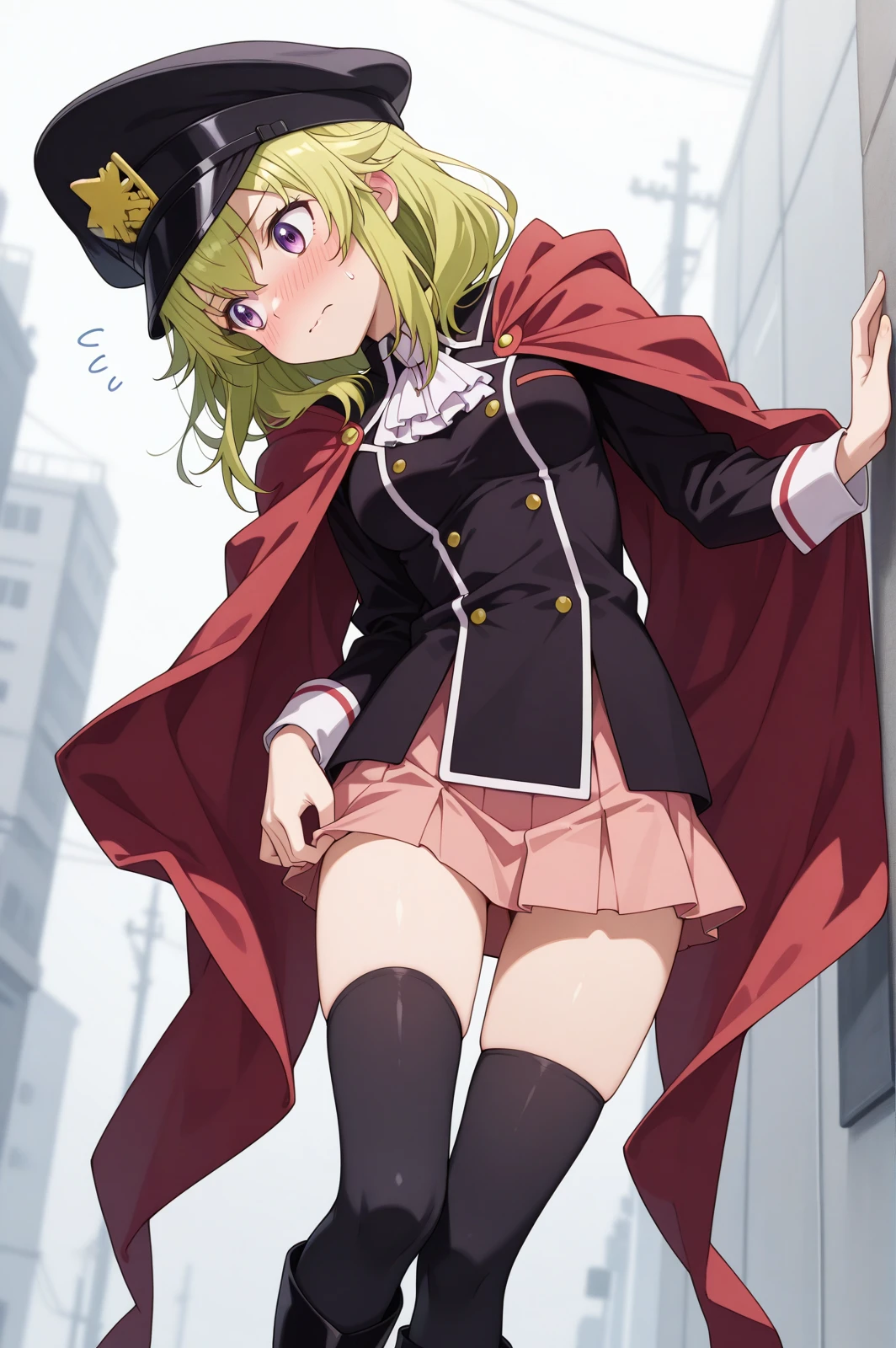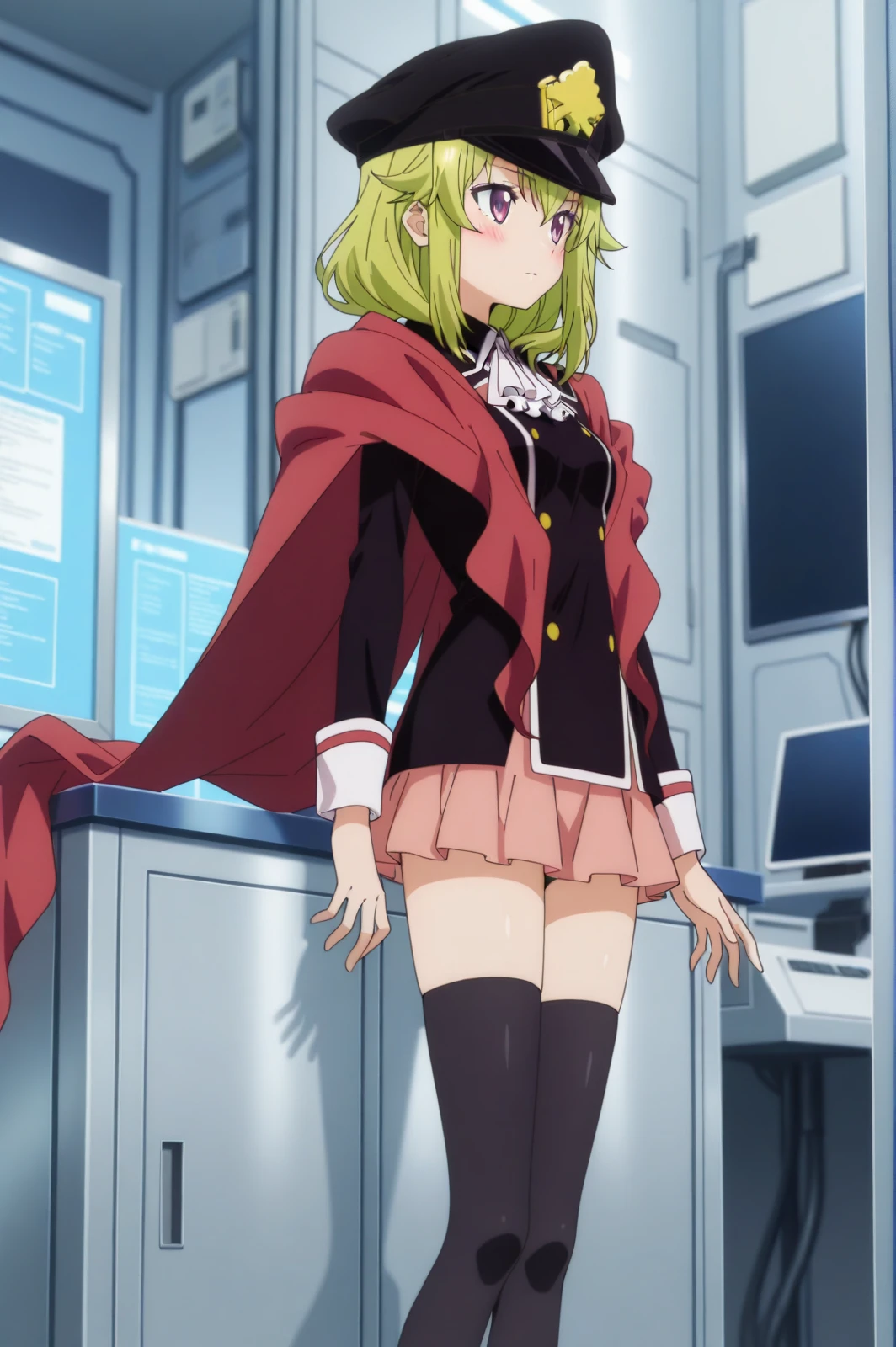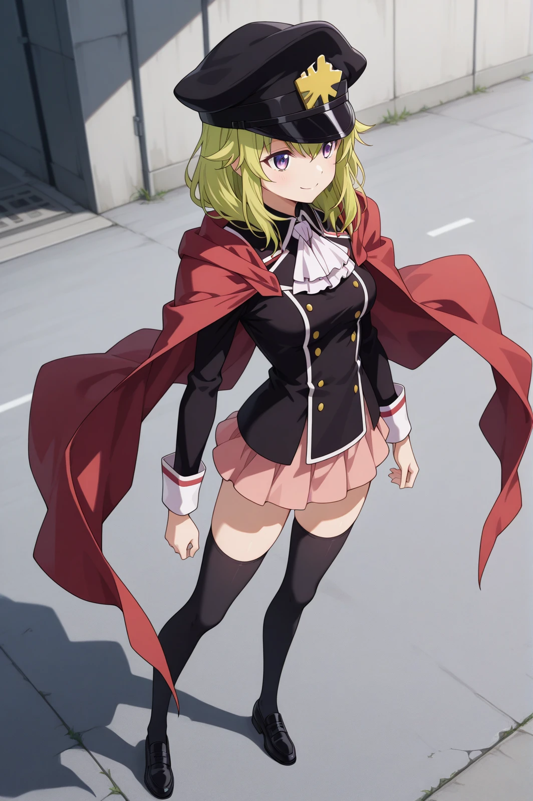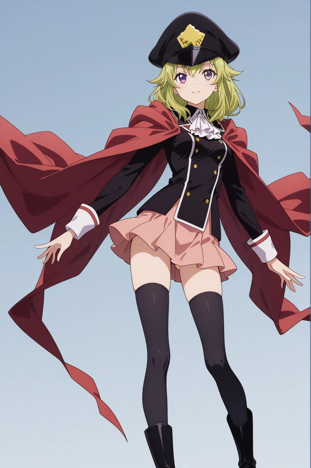 uniform, pink skirt, peaked cap, scarf, black thighhighs, black boots