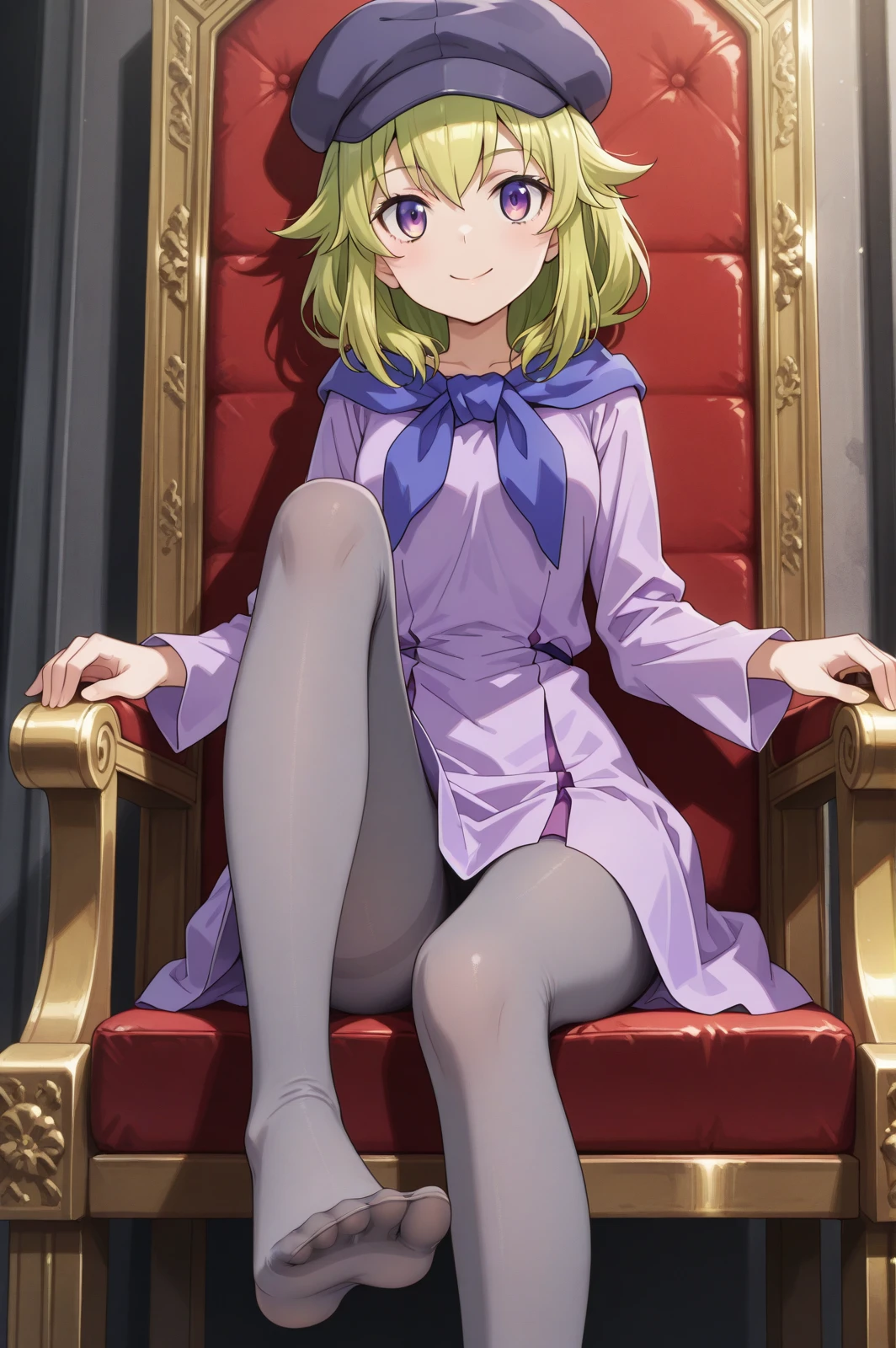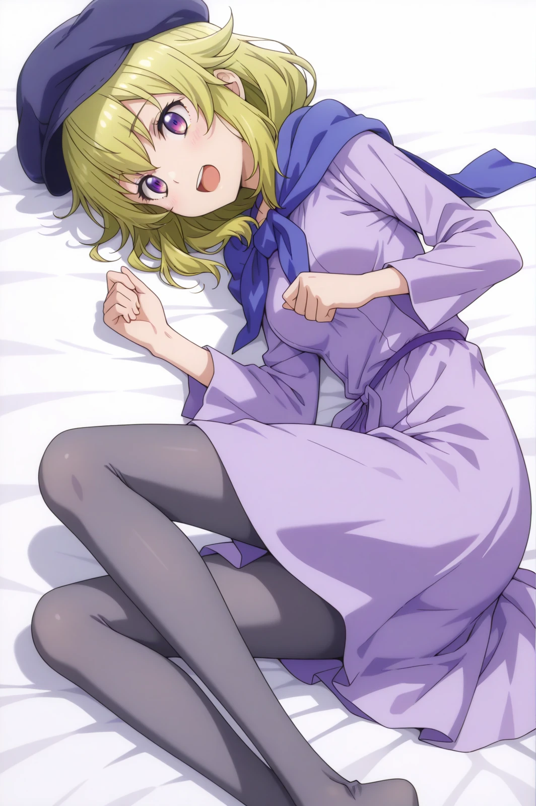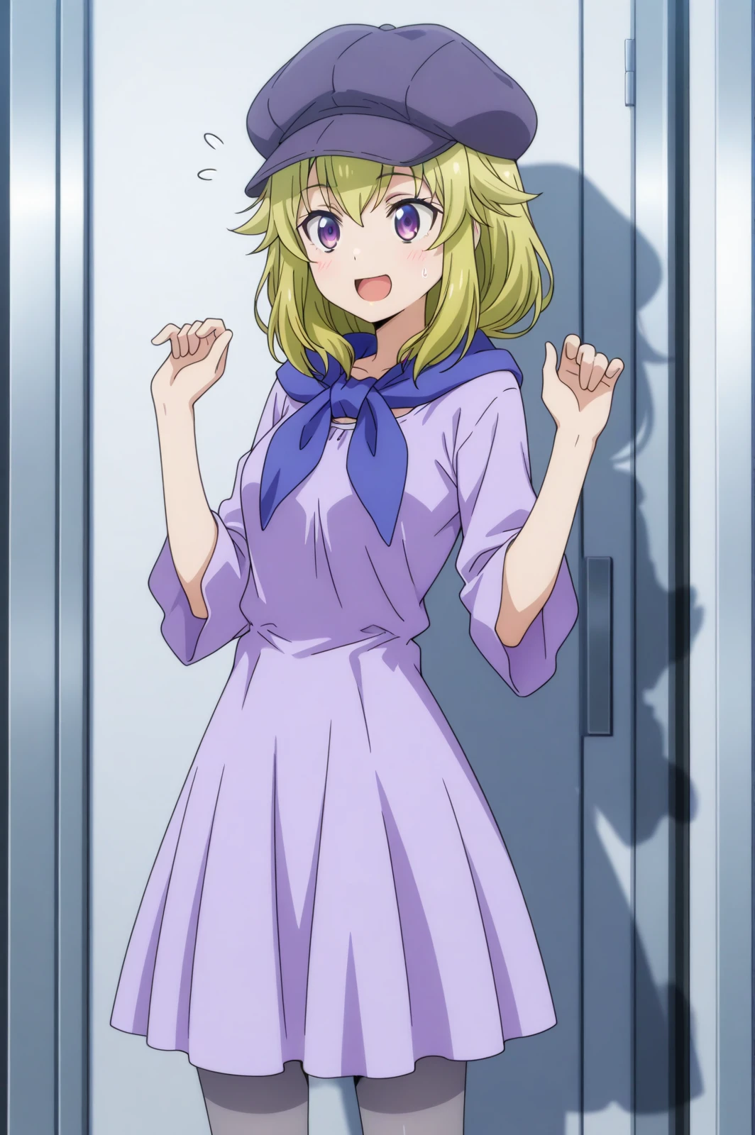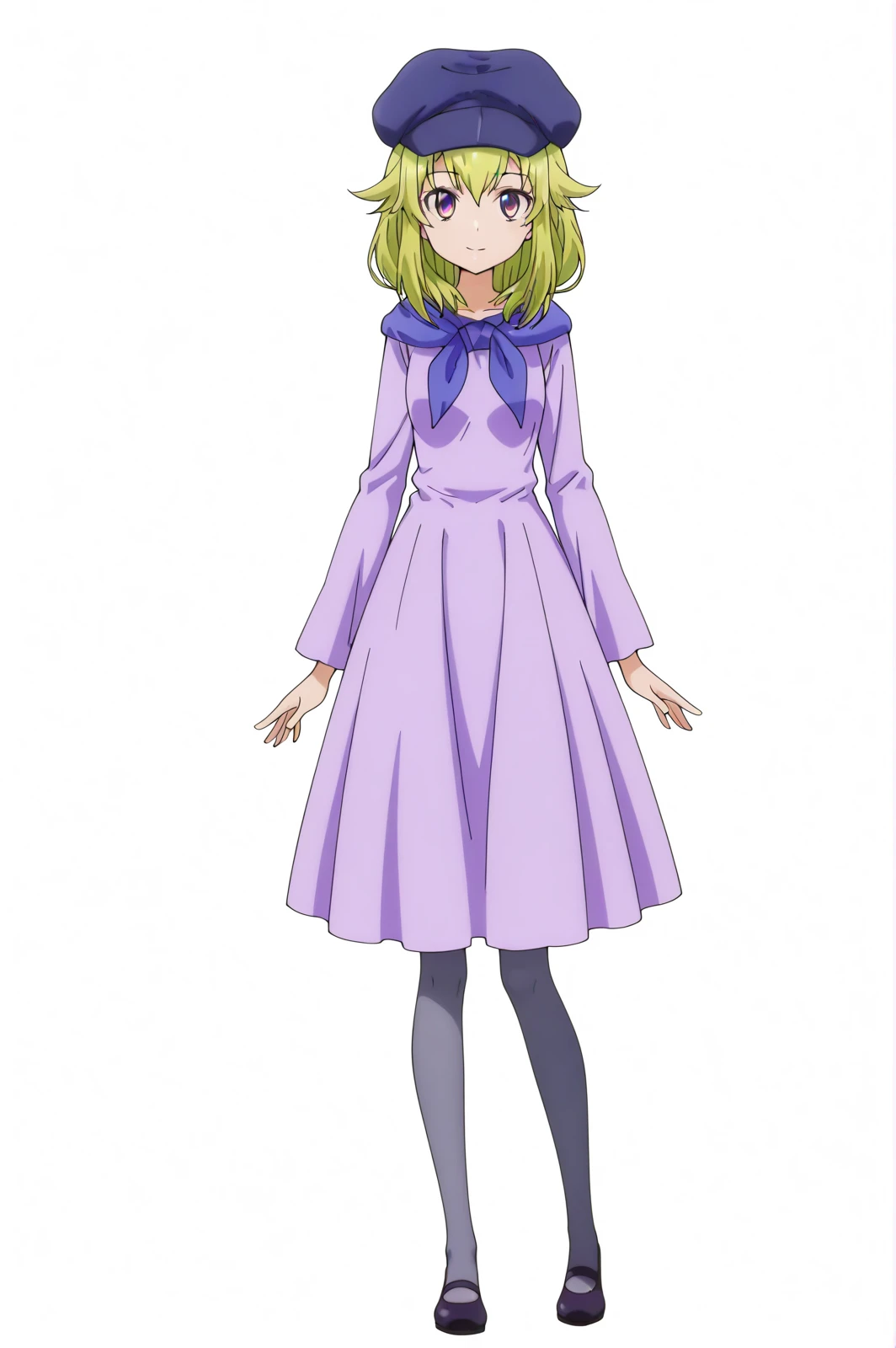 purple dress, pantyhose, cabbie hat