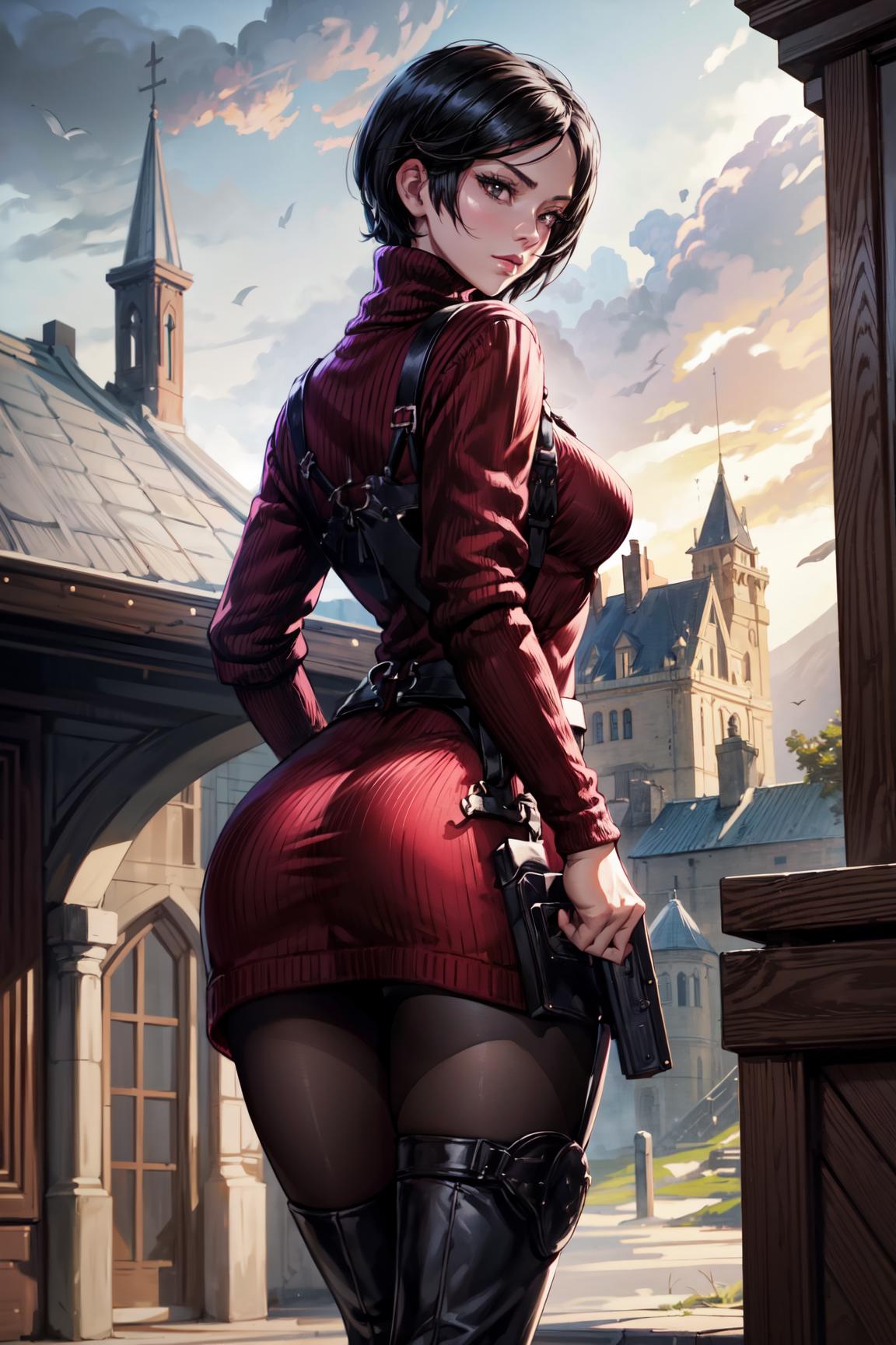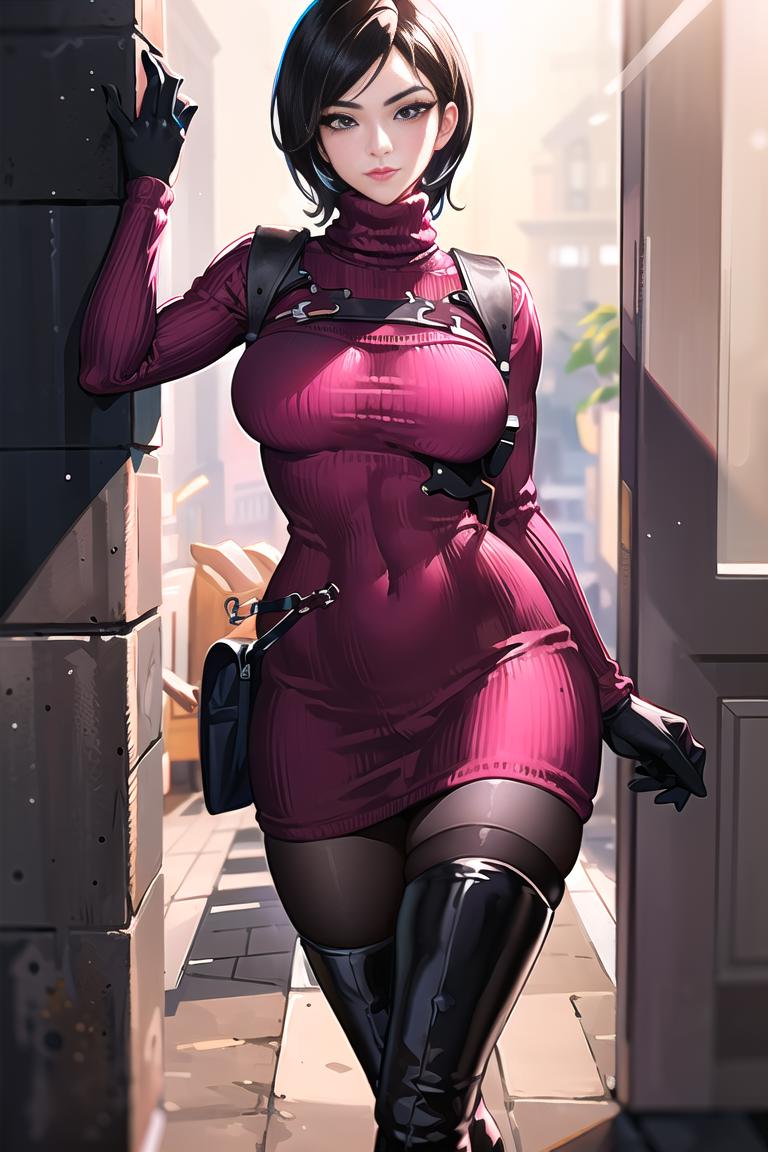 RE4, sweater dress, turtleneck, ribbed sweater, thigh high boots, pantyhose, harness - For the sweater vest look.