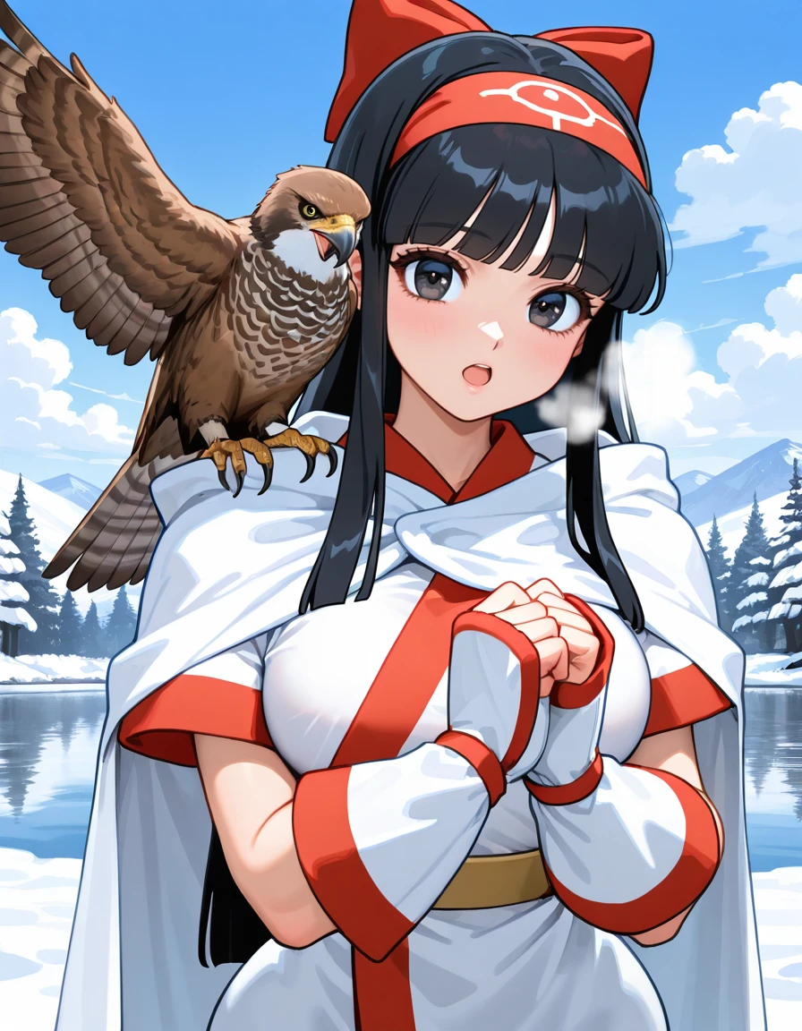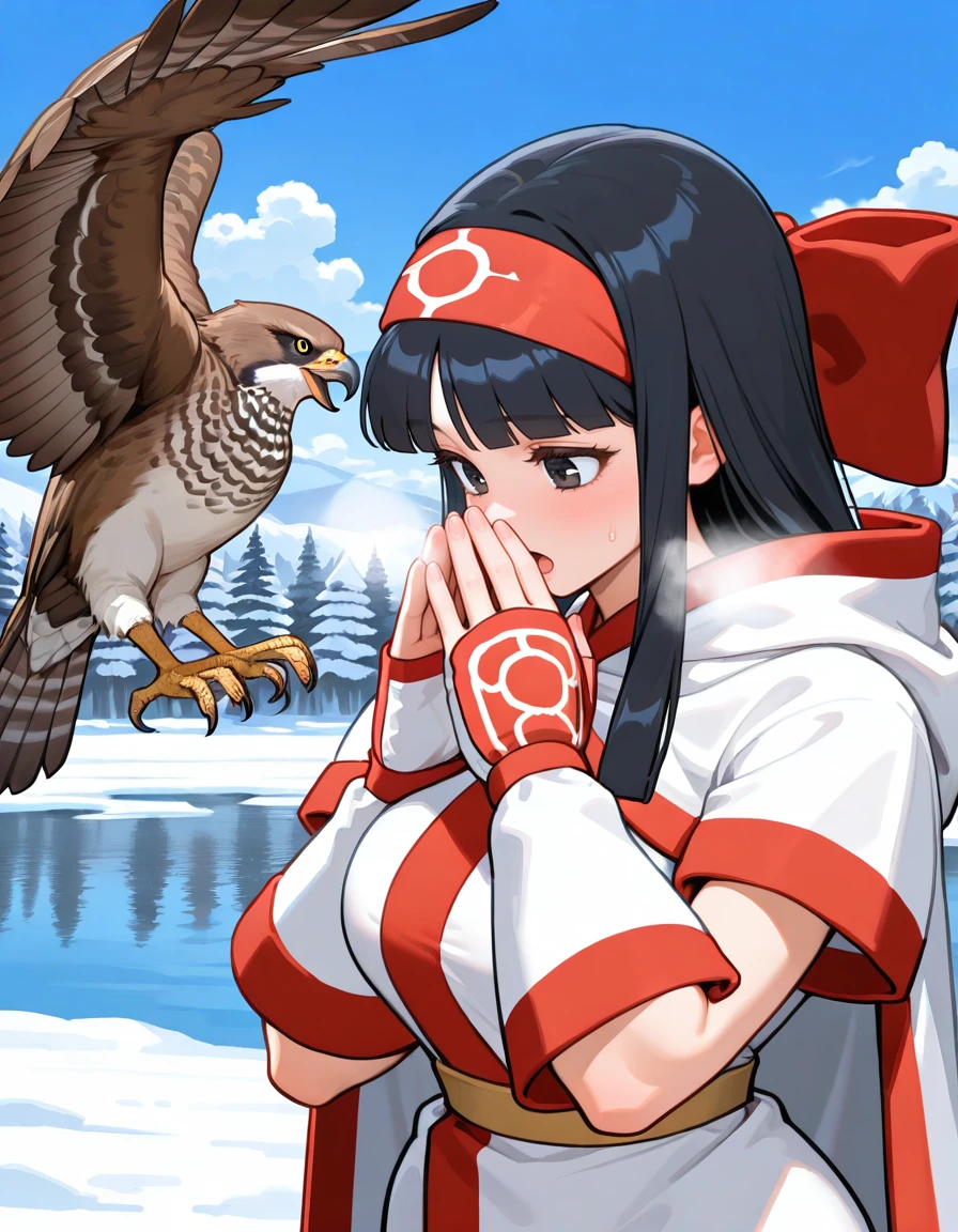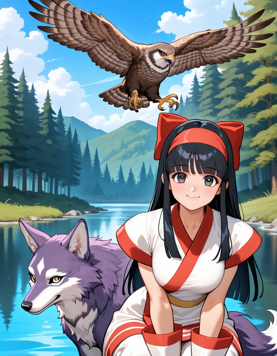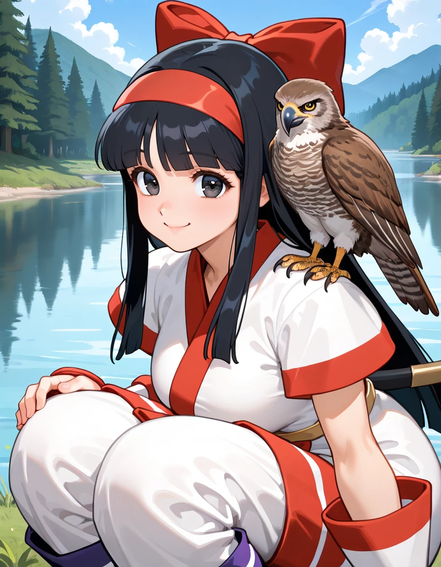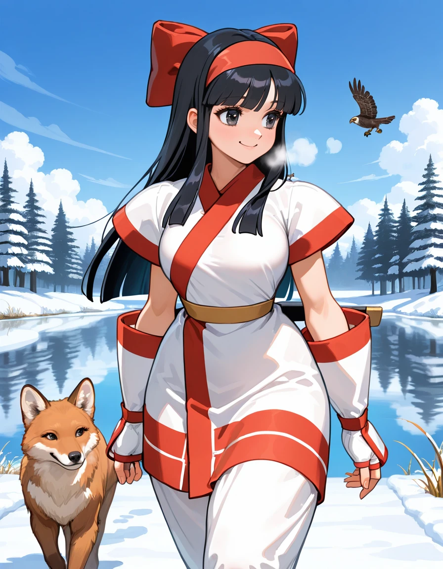 (retro artstyle:0.8), (cvs2-nakoruru, ainu clothes, black eyes, tareme, eyelashes, black hair, blunt bangs, long hair, hairband, large breasts, wide hips), (hair bow, puffy short sleeves), (short kimono, elbow gloves, yellow sash, capri pants, brown fur shoes), (sheathed)