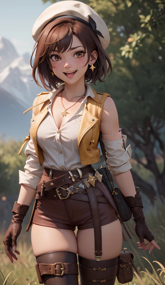 short hair, bangs, brown hair, shirt, hair ornament, thighhighs, cleavage, brown eyes, jewelry, collarbone, white shirt, thighs, boots, shorts, hairclip, belt, necklace, star \(symbol\), white thighhighs, short shorts, skindentation, beret, white headwear, thigh boots, brown gloves, single glove, brown belt, red shorts, leather, sleeveless yellow jacket, star necklace, thigh pouch, leather belt, leather gloves, round-bottom flask, bridal legwear
