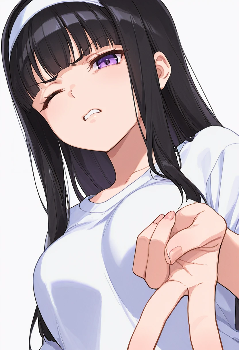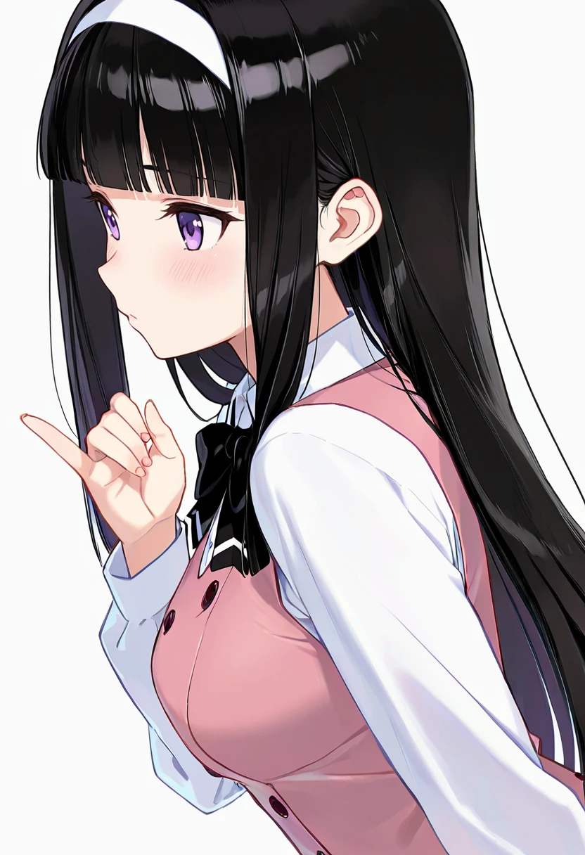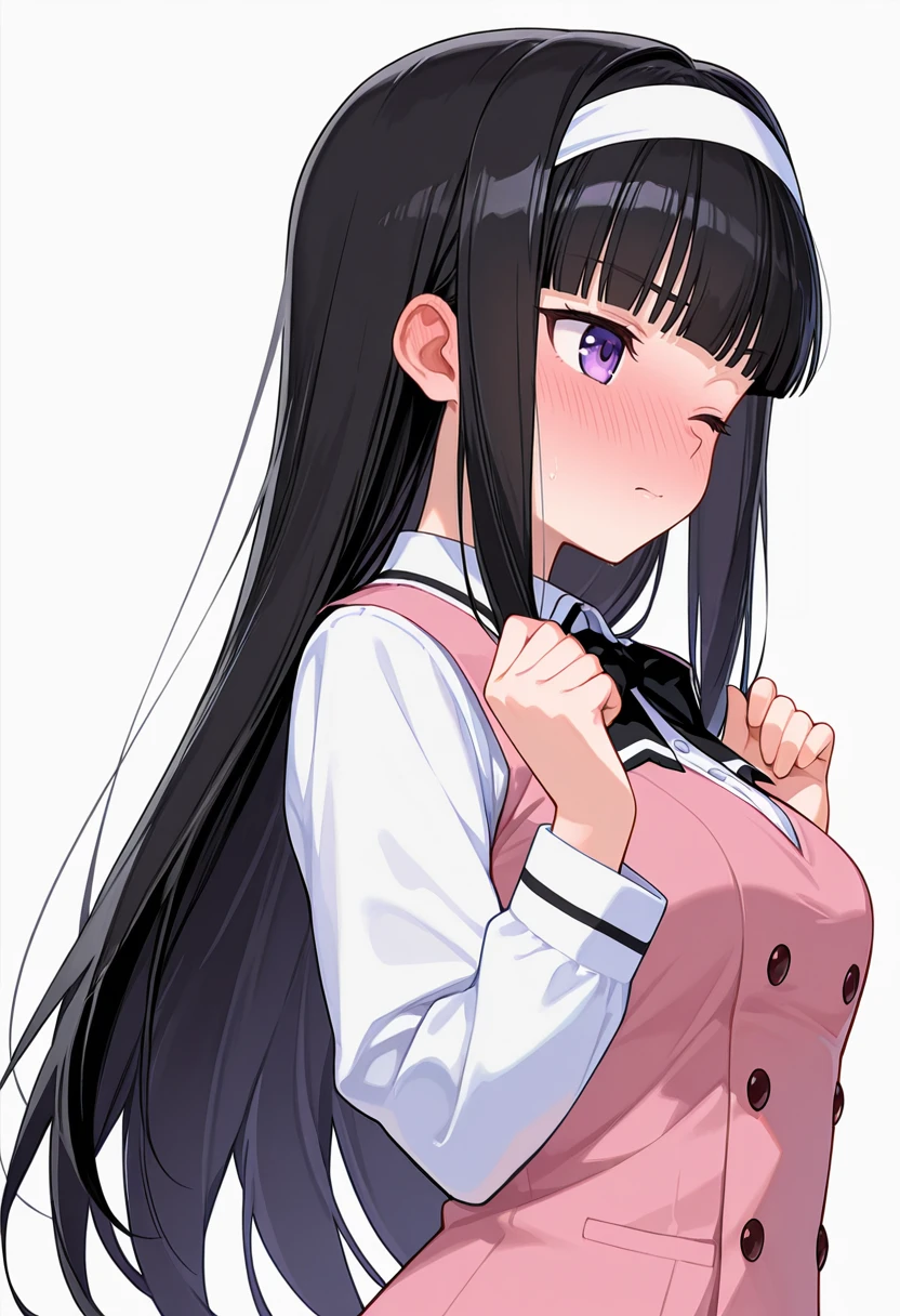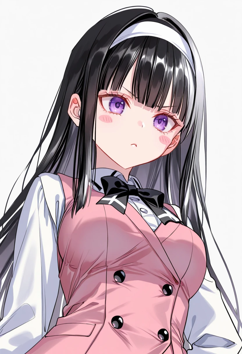 midori_cnr, 1girl, black hair, long hair, purple eyes, blunt bangs, sidelocks,medium breasts,white hairband,