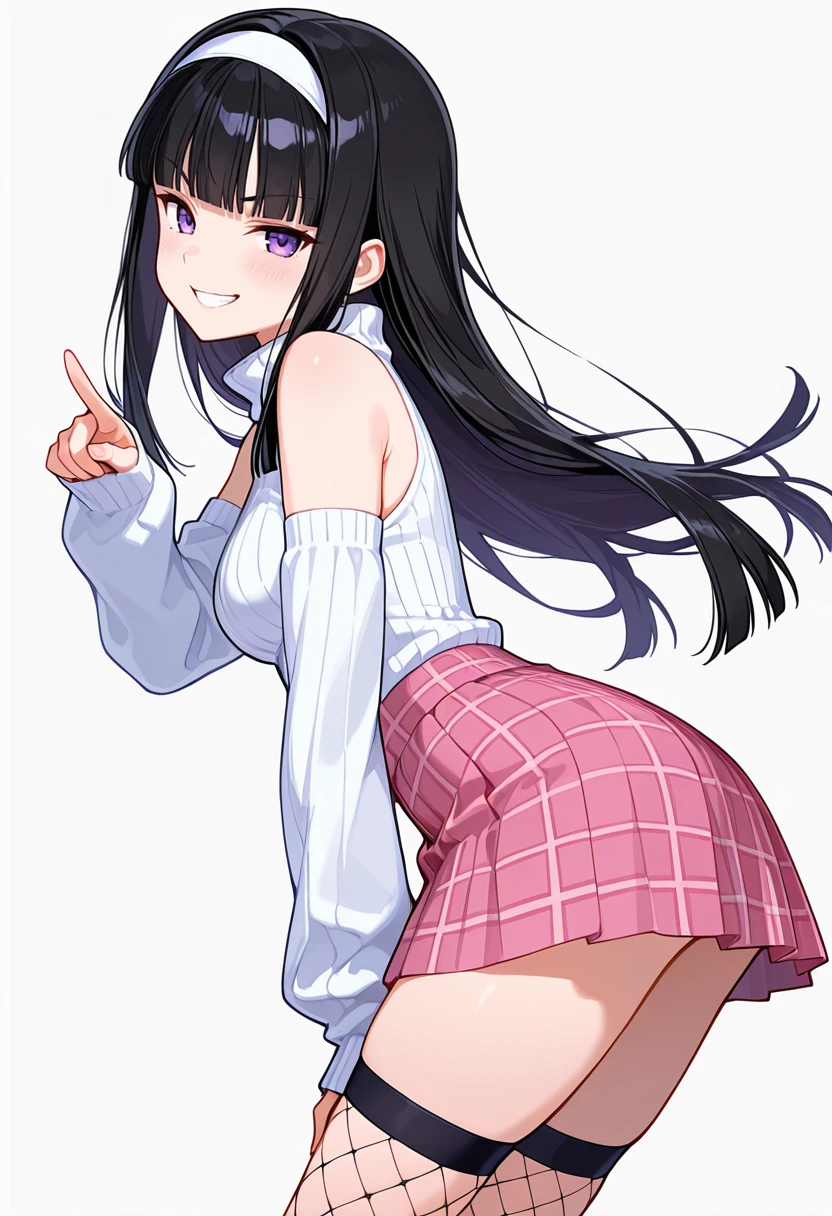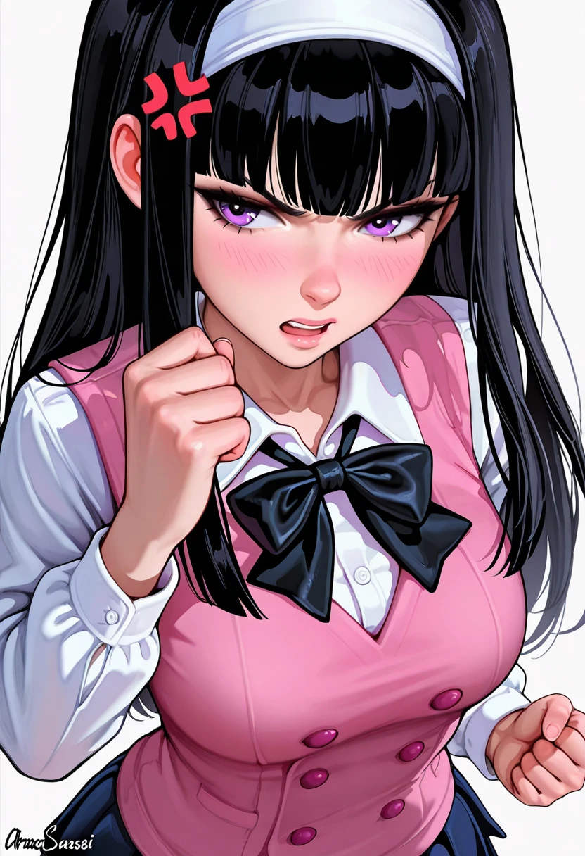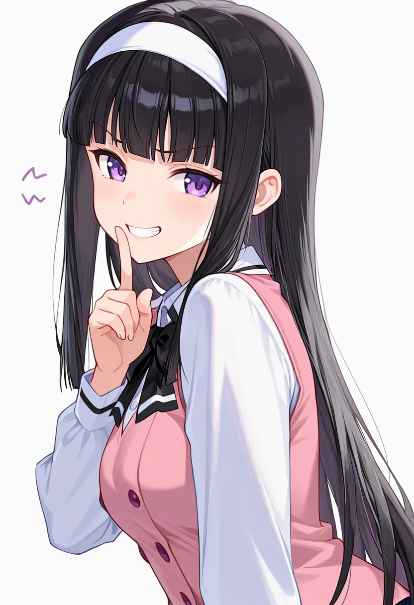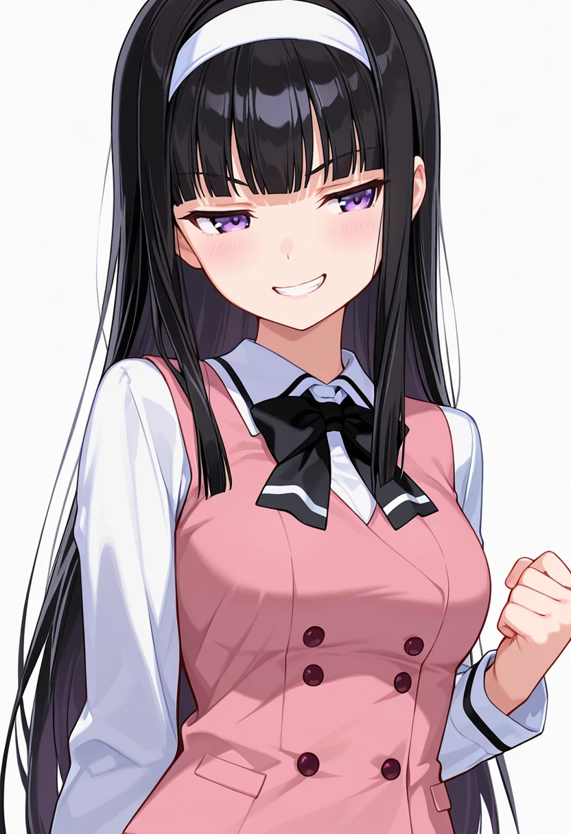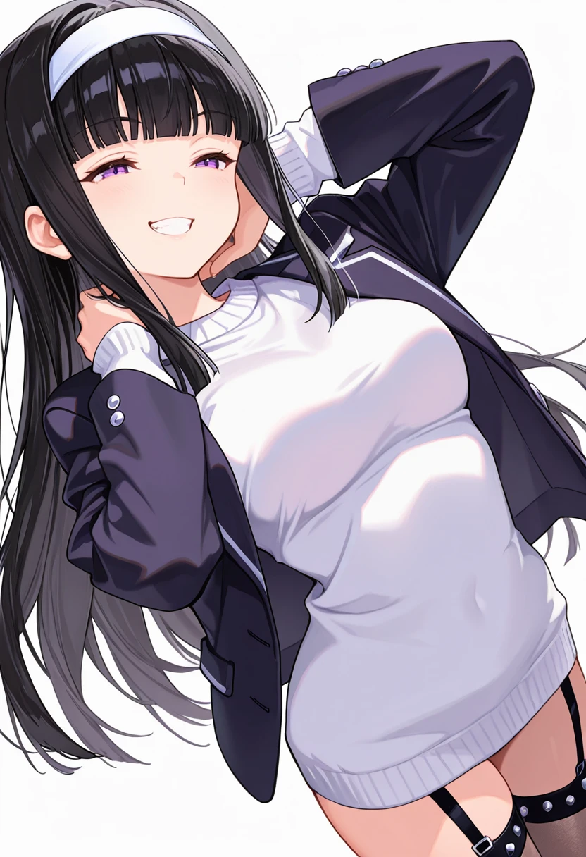 midori_cnr, 1girl, black hair, long hair, purple eyes, blunt bangs, sidelocks,medium breasts,white hairband,