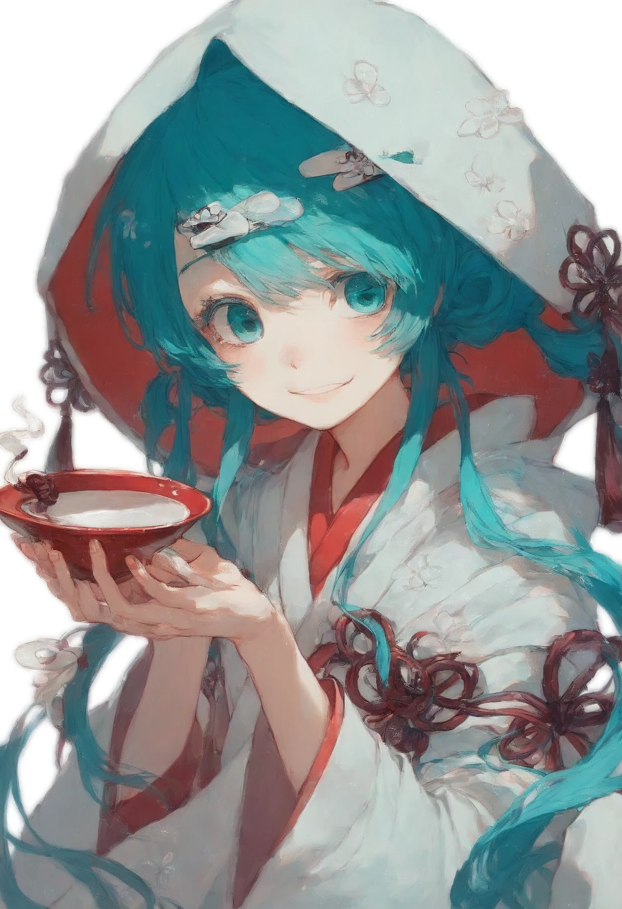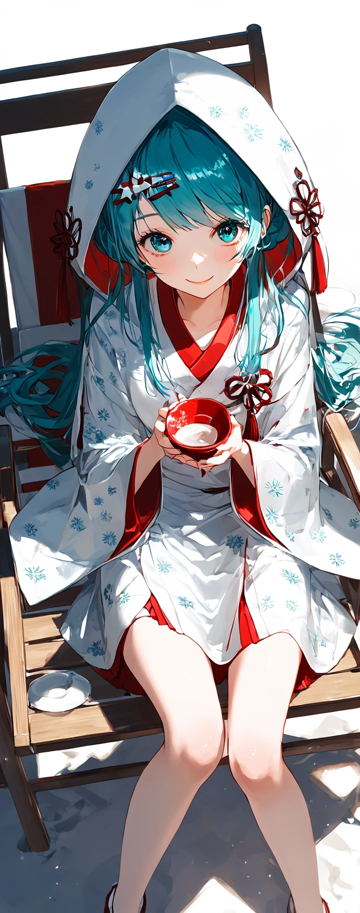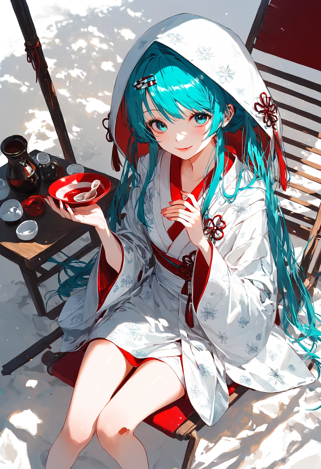 SHM13, hatsune miku, 1girl, wataboushi, uchikake, yuki miku, japanese clothes, kimono, hood, sakazuki, long hair, aqua hair