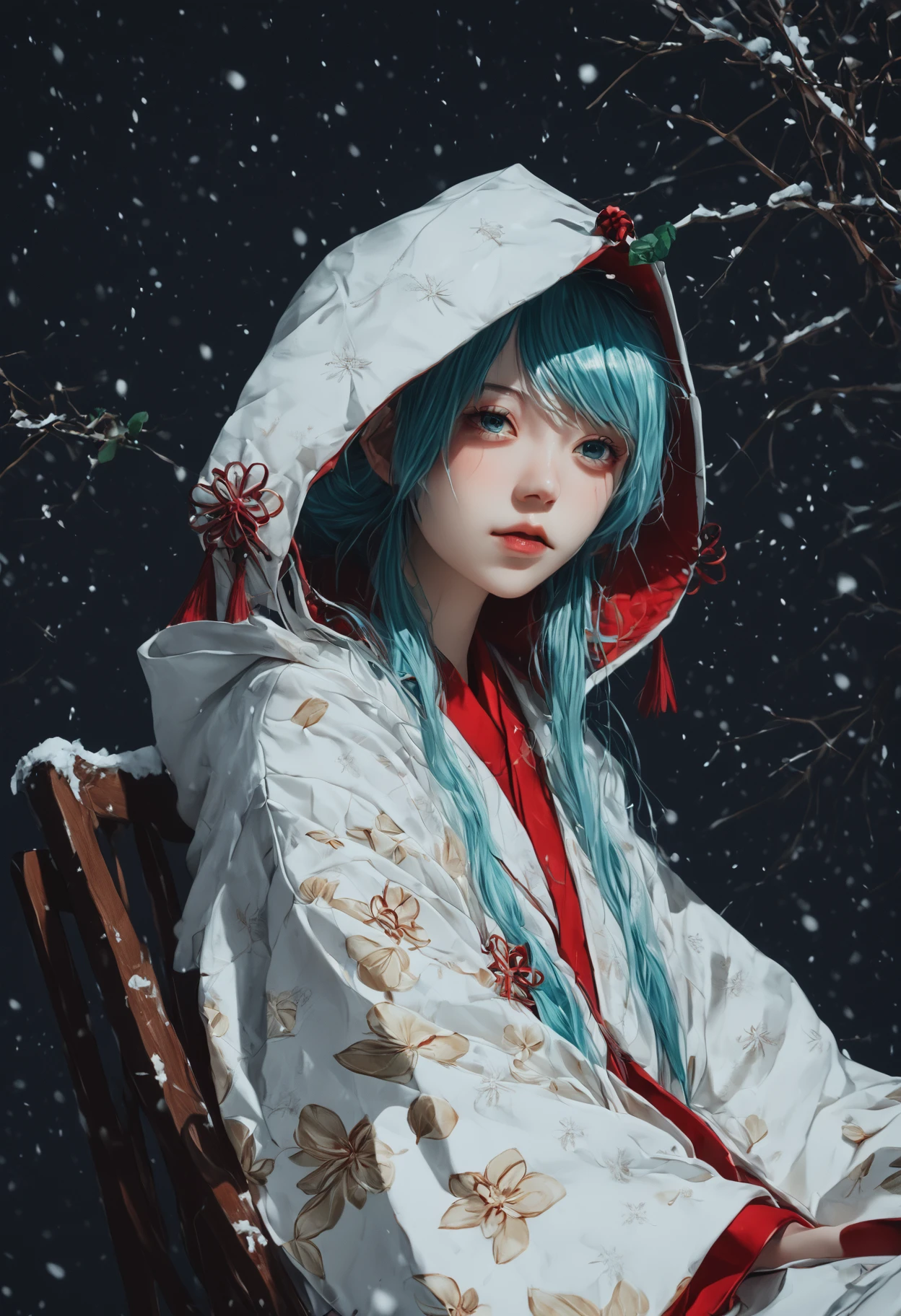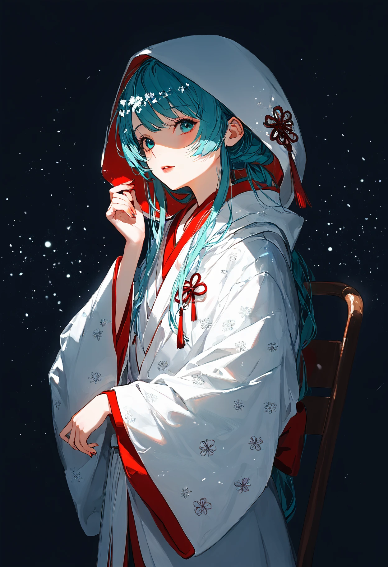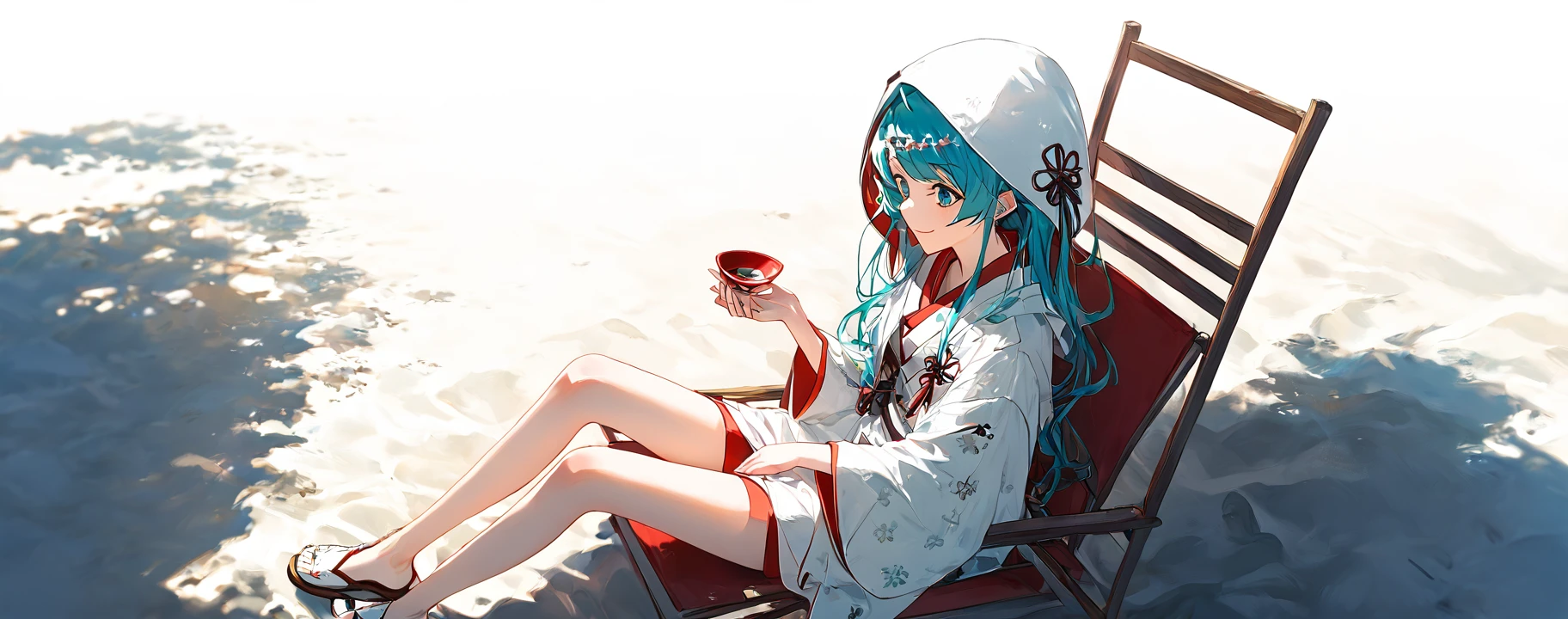 SHM13, hatsune miku, 1girl, wataboushi, uchikake, yuki miku, japanese clothes, kimono, hood, sakazuki, long hair, aqua hair