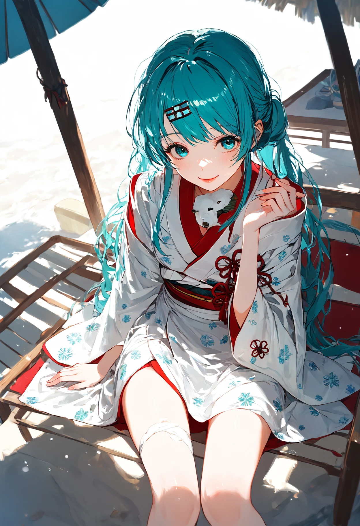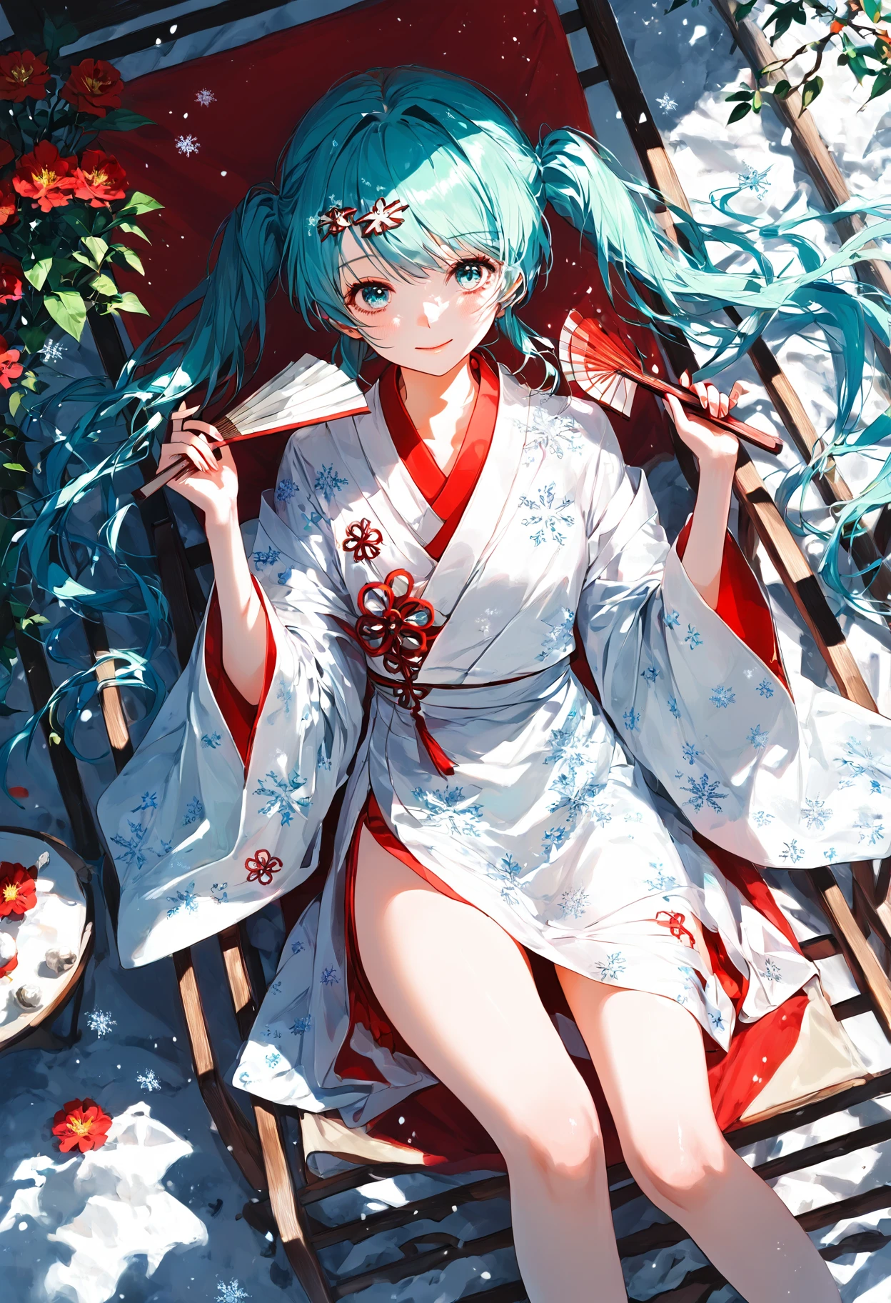 SHM13, hatsune miku, NOwataboushi, 1girl, japanese clothes, white kimono, hair ornament, aqua hair, long hair, twintails, aqua eyes, yuki miku, snowflake print, wide sleeves,