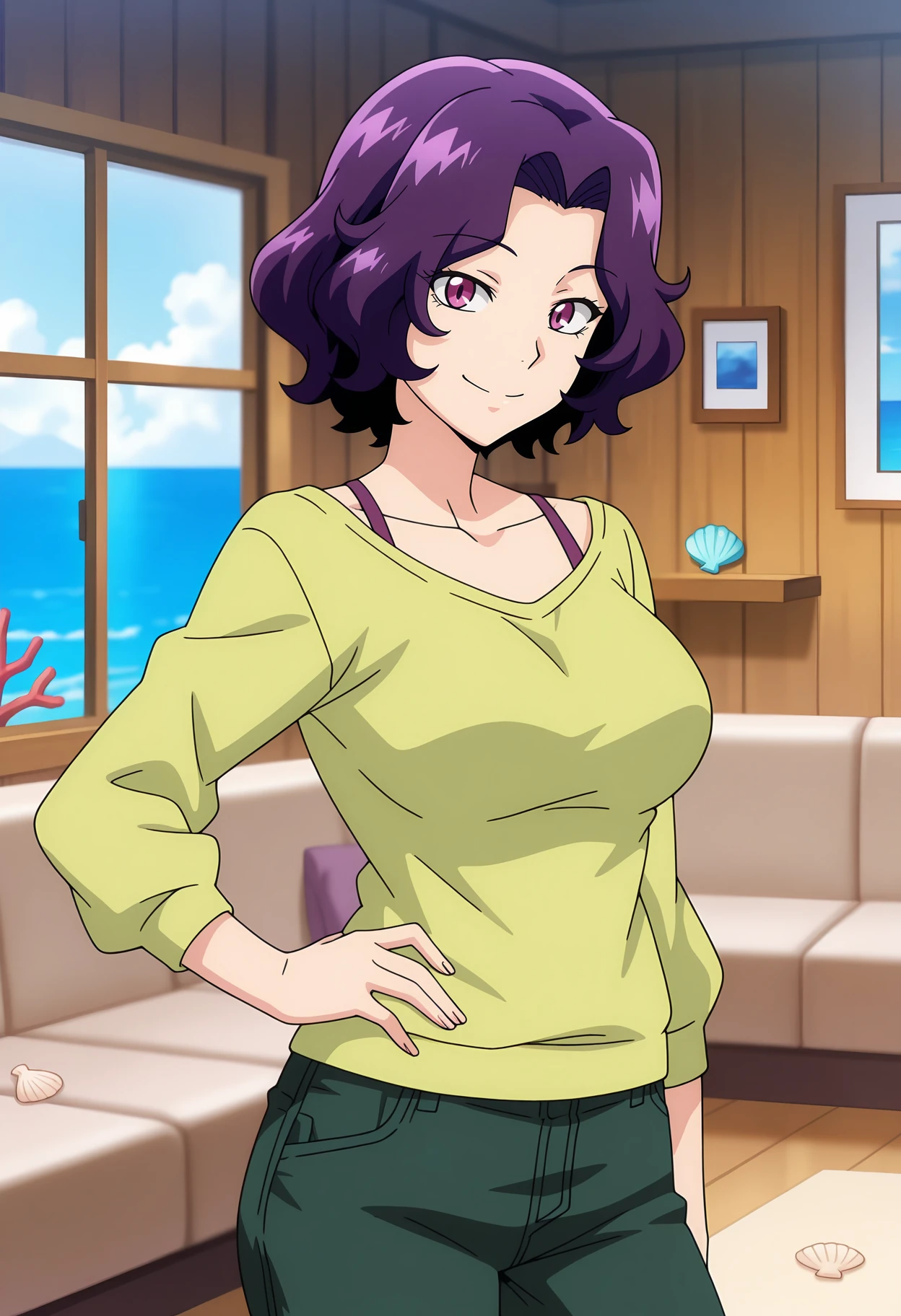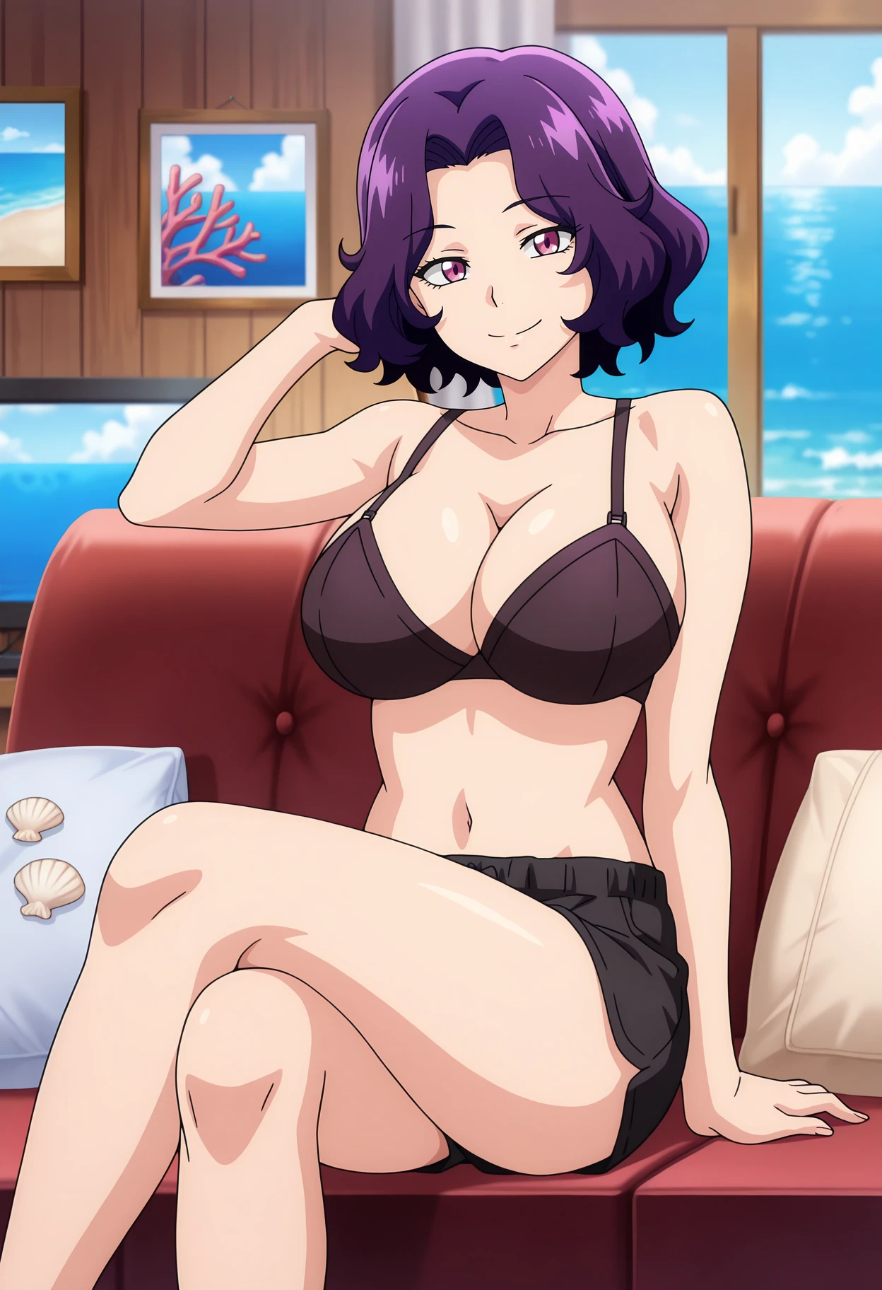 off-shoulder shirt, green shirt, red tank top, cleavage, short sleeves, short shorts, black shorts