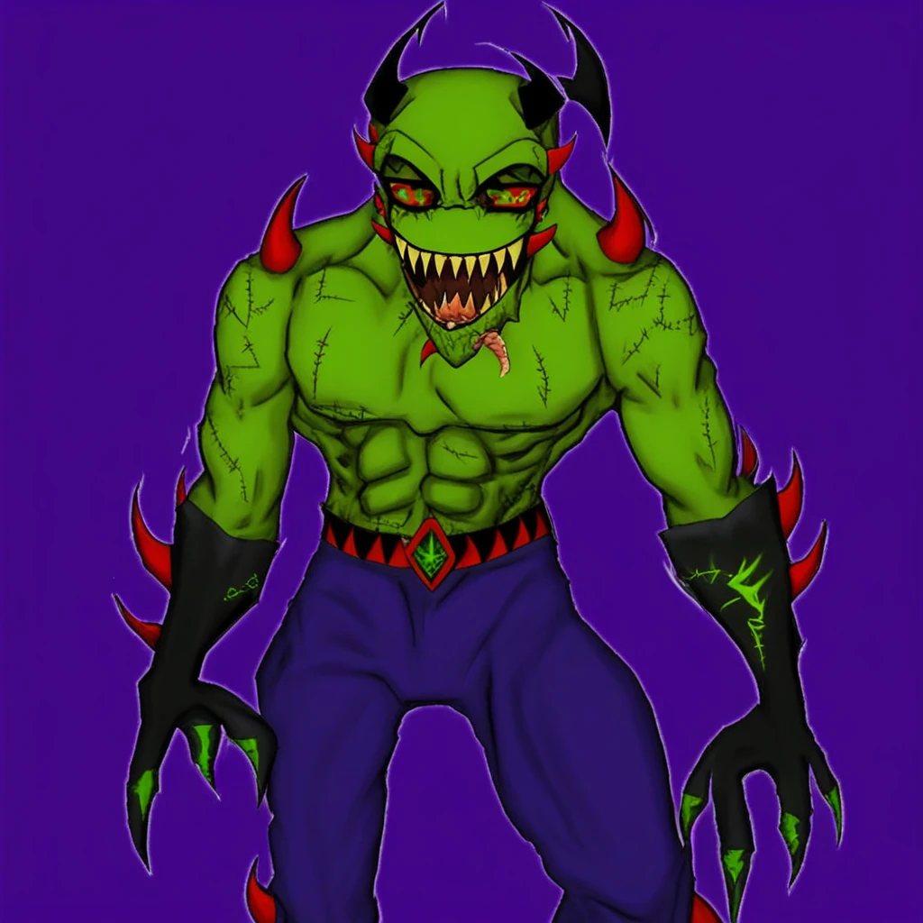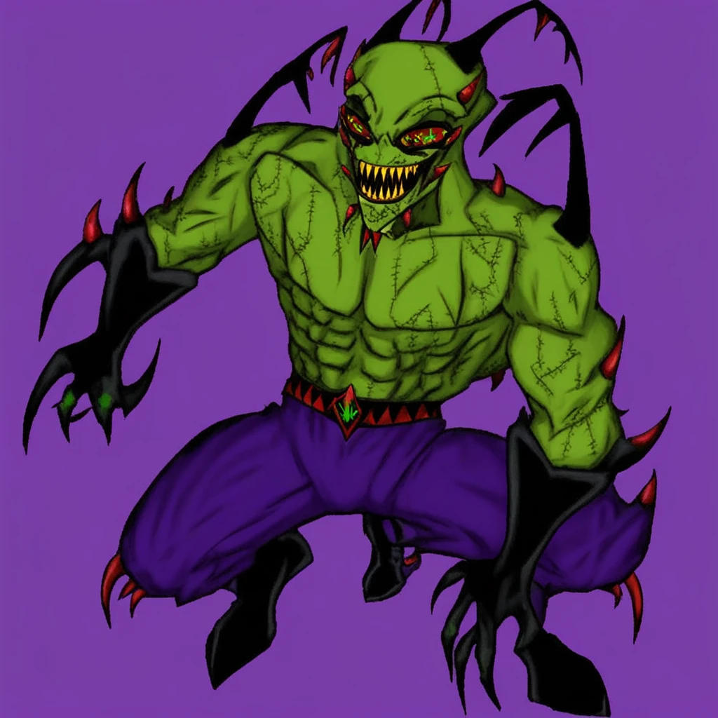 irken, red eyes, purple tongue, green skin, muscular, purple tight pants, red spikes, green saliva, snitches, scars, black gloves, black boots, two black antennas, three fingers, claws, yellow teeth, sharp teeth, alien,