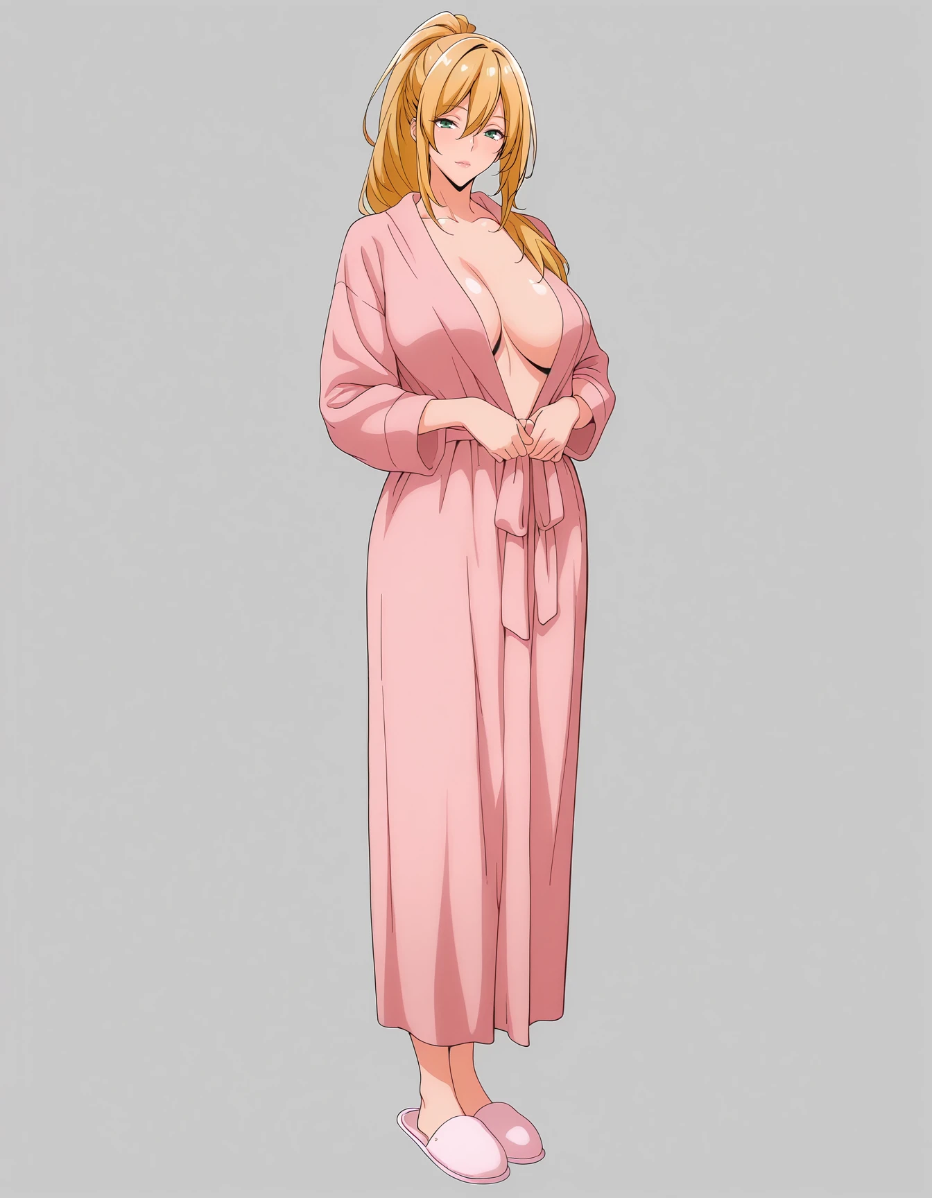 mai_fleur2,mai_yuukaf,mature_female,long_hair,high_ponytail,blonde_hair,green_eyes,large_breasts,pink_bathrobe,no_bra,slippers