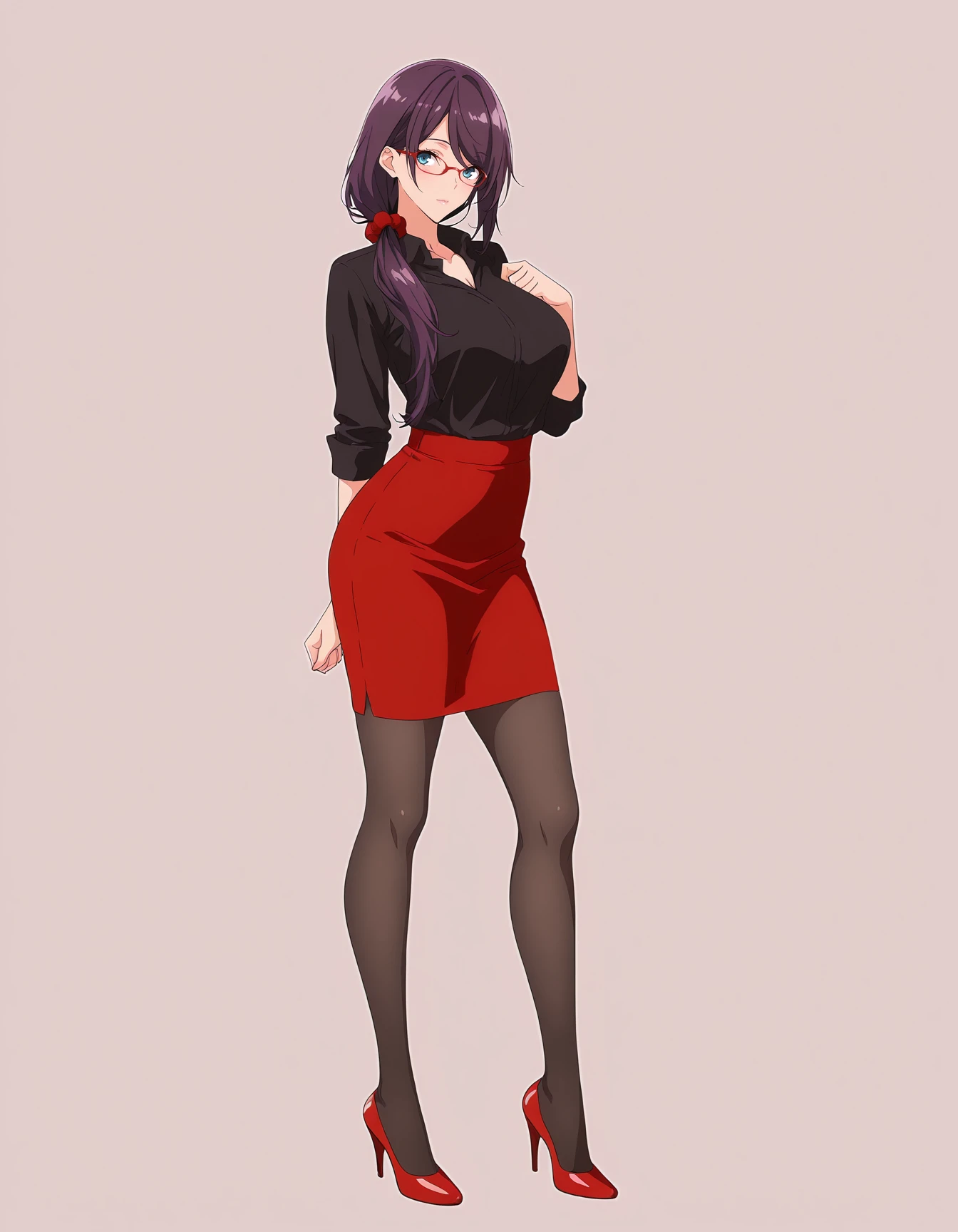 mai_fleur2,mai_shinf,aged_up,long_hair,low_ponytail,swept_bangs,dark_purple_hair,blue_eyes,large_breasts,red-framed_eyewear,hair_over_shoulder,red_scrunchie,collared_shirt,black_shirt,pencil_skirt,red_skirt,black_pantyhose,red_high_heelsSatsuki Nanri 南里 皐月