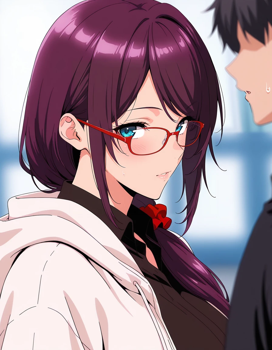 mai_fleur2,mai_shinf,aged_up,long_hair,low_ponytail,swept_bangs,dark_purple_hair,blue_eyes,large_breasts,red-framed_eyewear,hair_over_shoulder,red_scrunchie,collared_shirt,black_shirt,pencil_skirt,red_skirt,black_pantyhose,red_high_heels