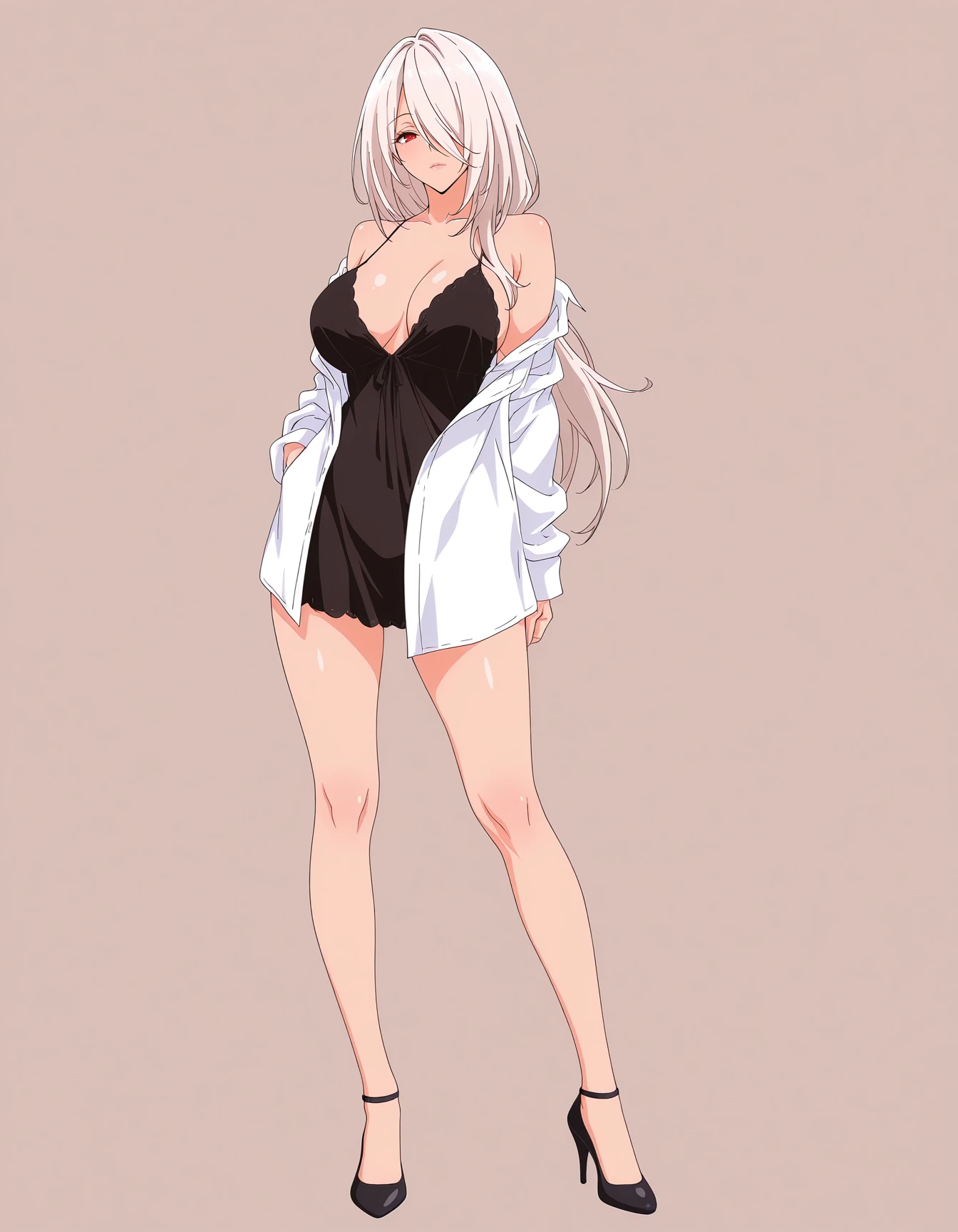 mai_fleur2,mai_satsukif,aged_up,long_hair,white_hair,red_eyes,hair_over_one_eye,large_breasts,black_camisole,white_shirt,black_high_heels,bare_shoulders,open_shirt
