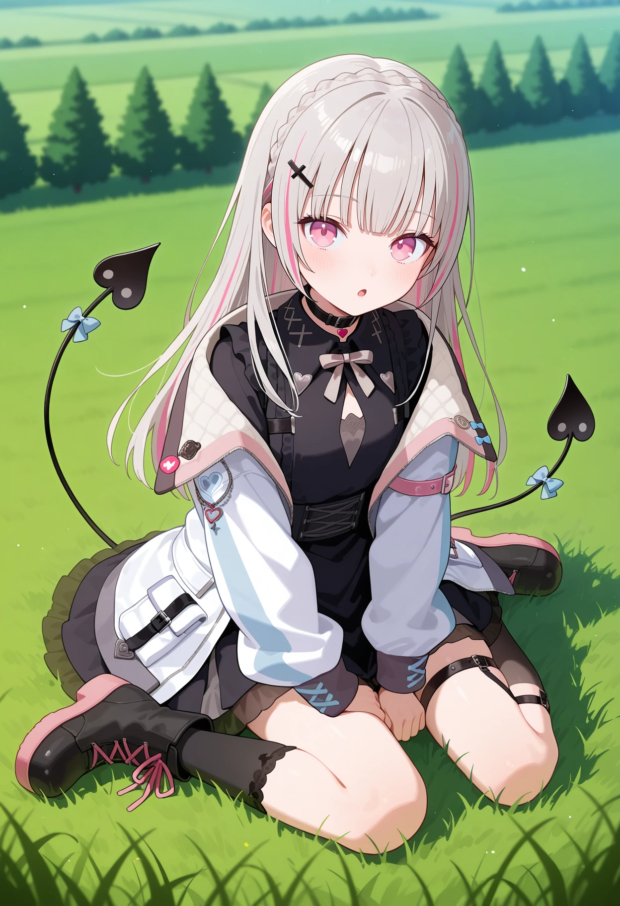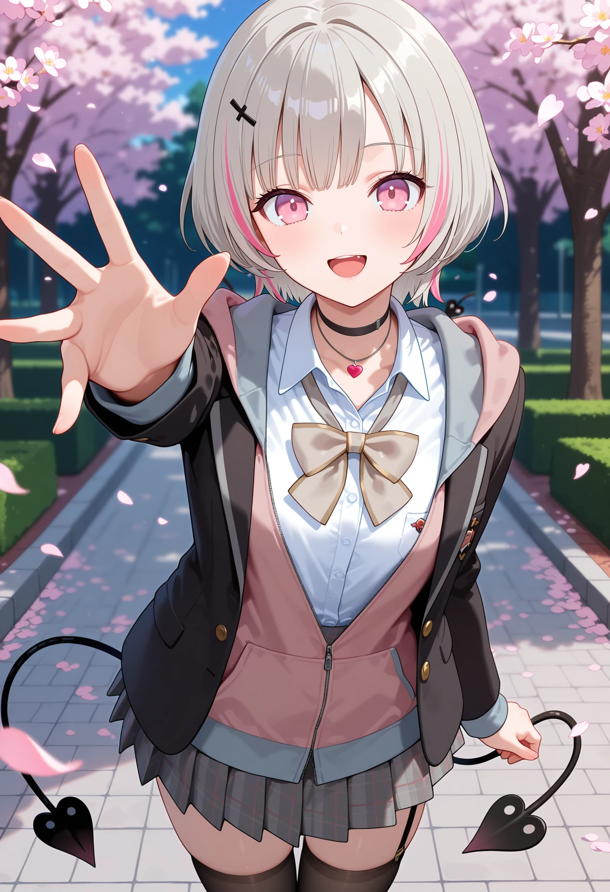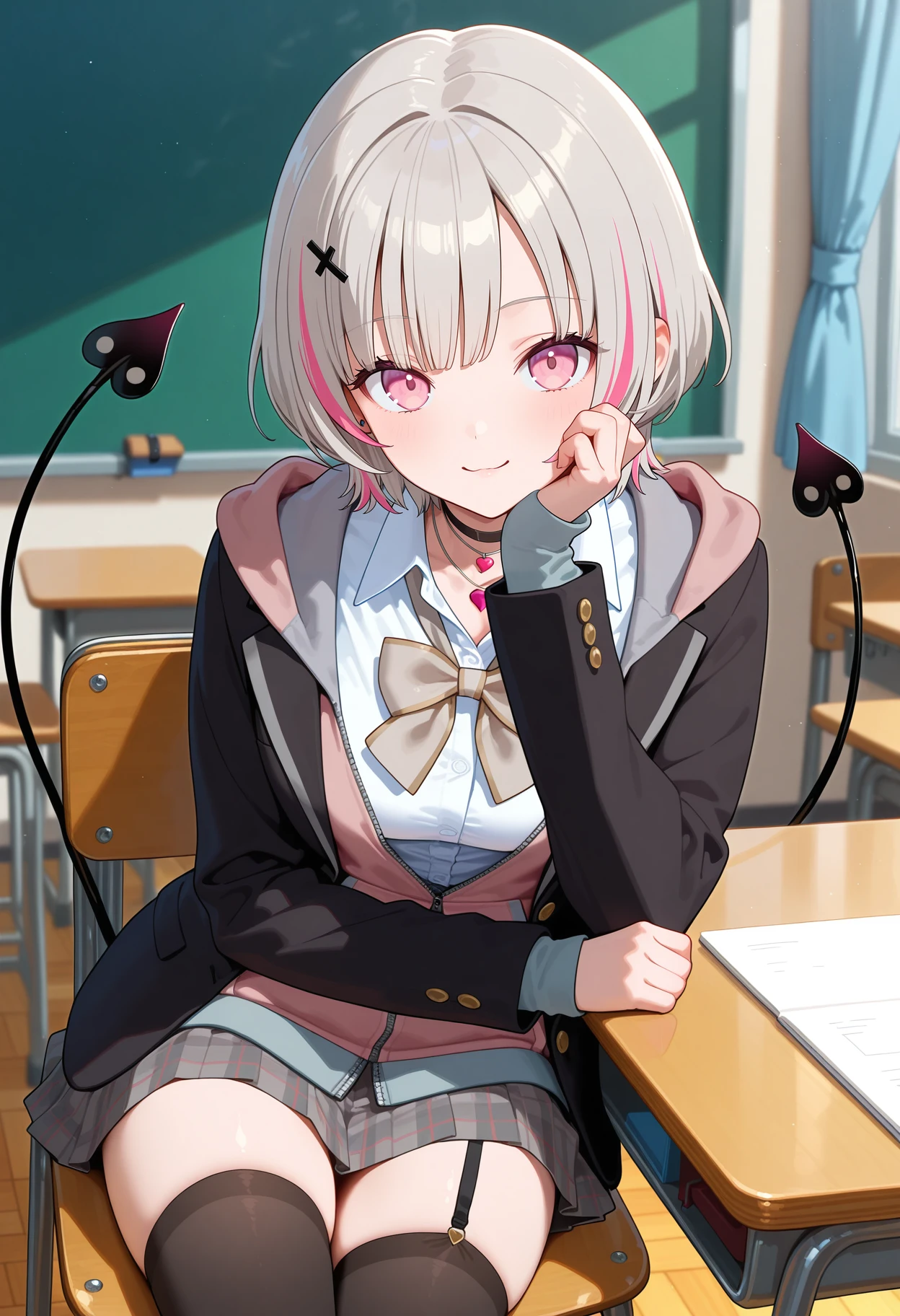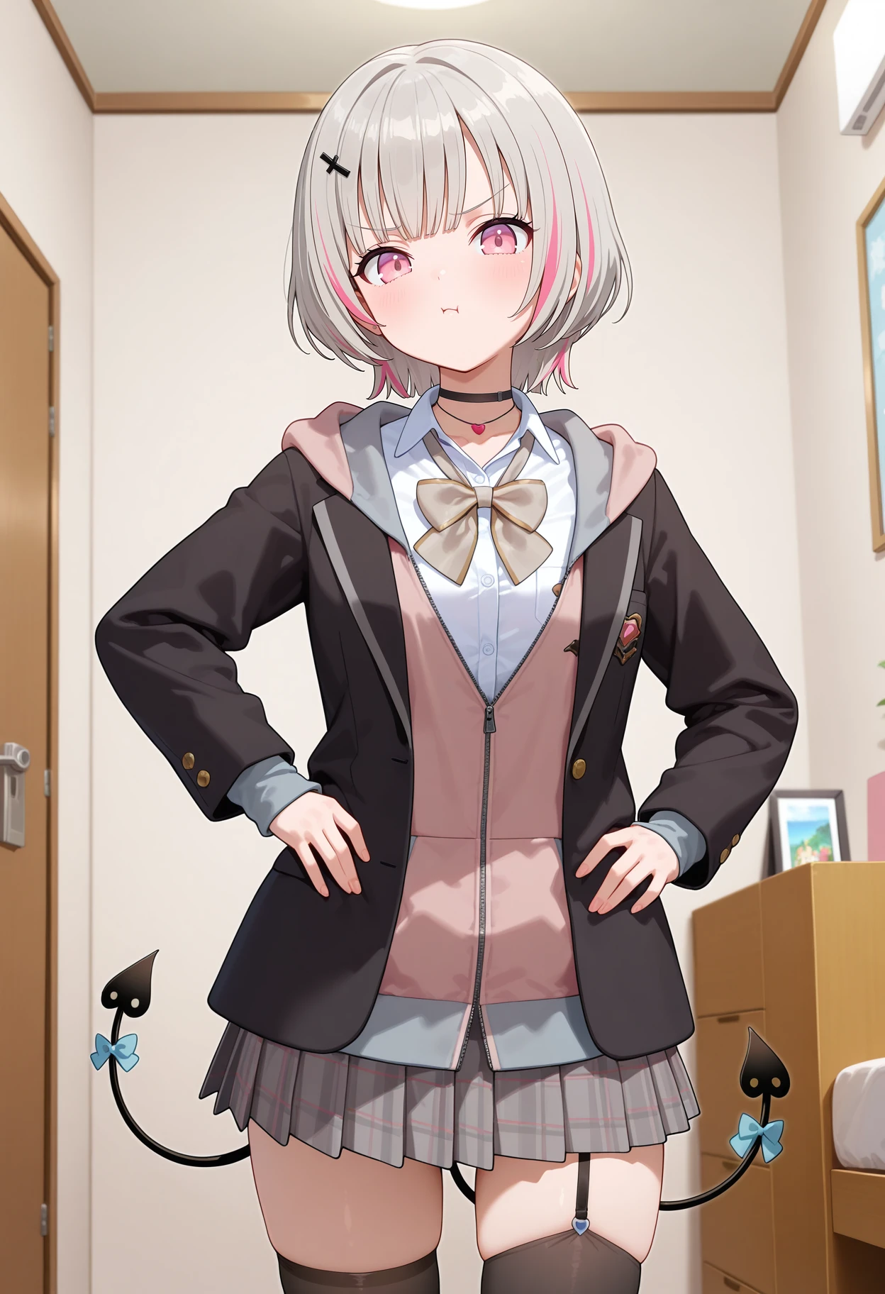 outfit2ccsena, short hair, streaked hair, grey hair, cross hair ornament, pink eyes, two tails, demon tail, black choker, necklace, grey bowtie, white shirt, pink hoodie, black jacket, long sleeves, plaid skirt, grey skirt, single garter strap, black thighhighs