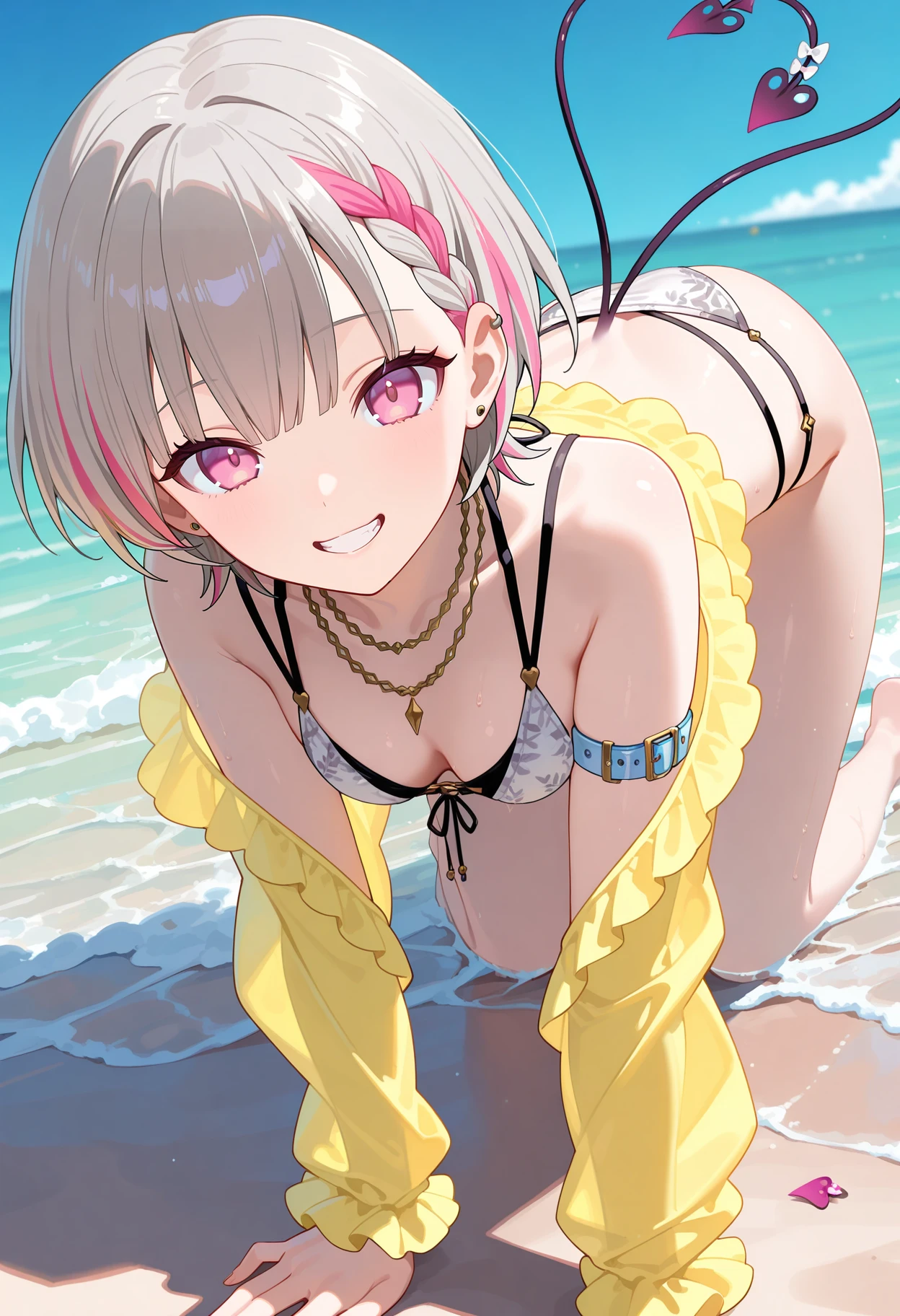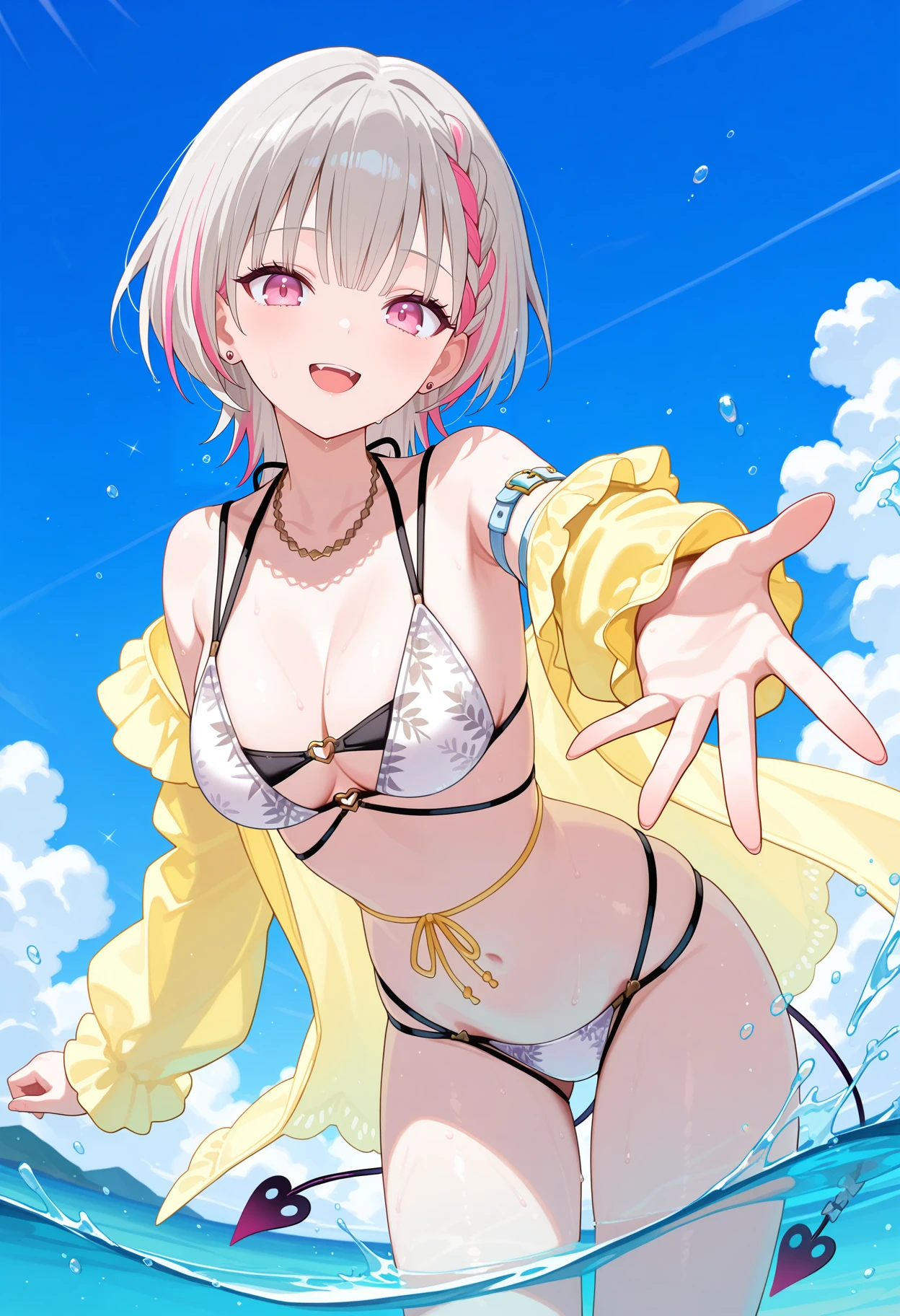 outfit4eesena, short hair, streaked hair, grey hair, braided bangs, earrings, pink eyes, two tails, demon tail, necklace, layered bikini, multi-strapped bikini, string bikini, off shoulder, yellow jacket, long sleeves, arm belt