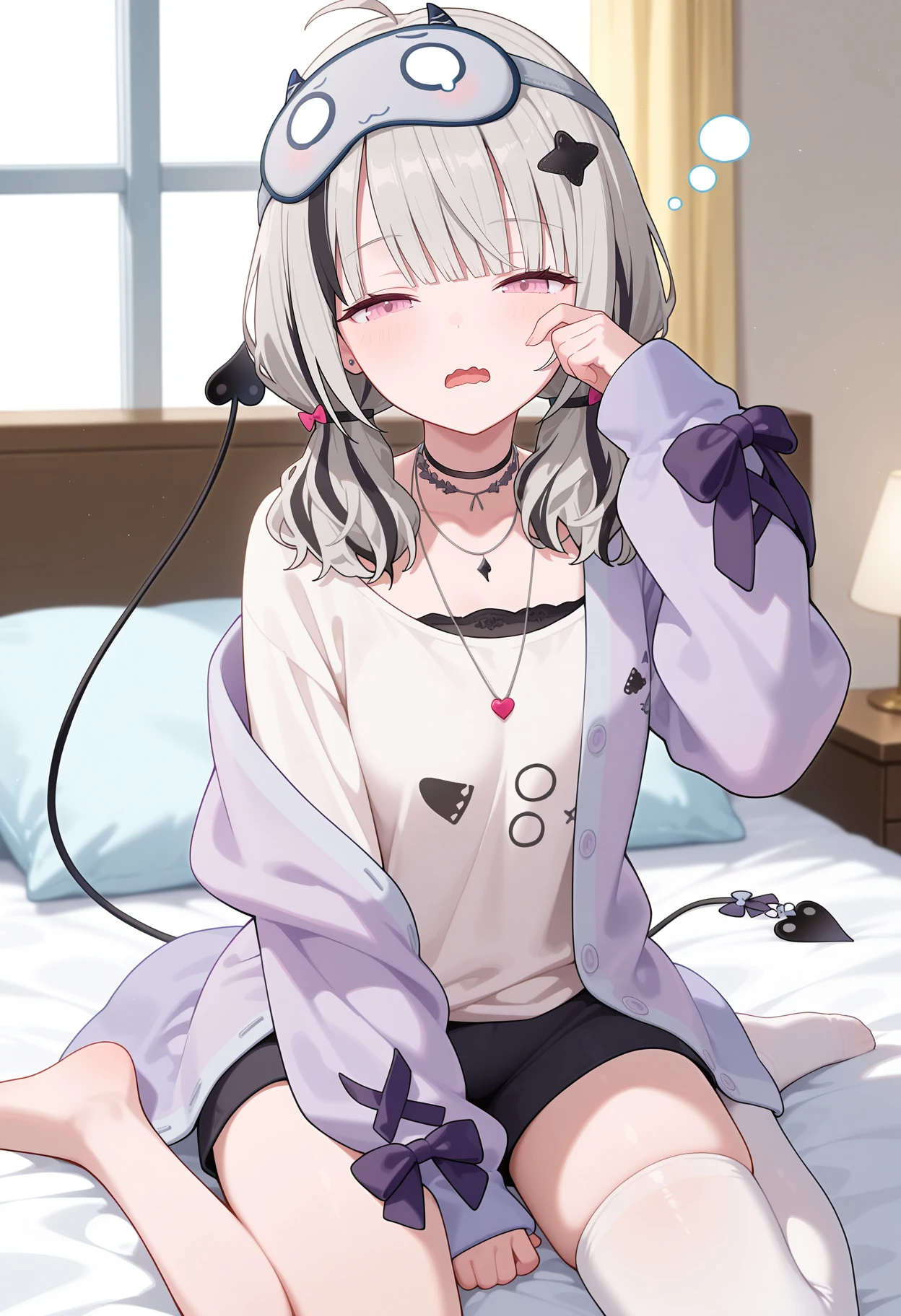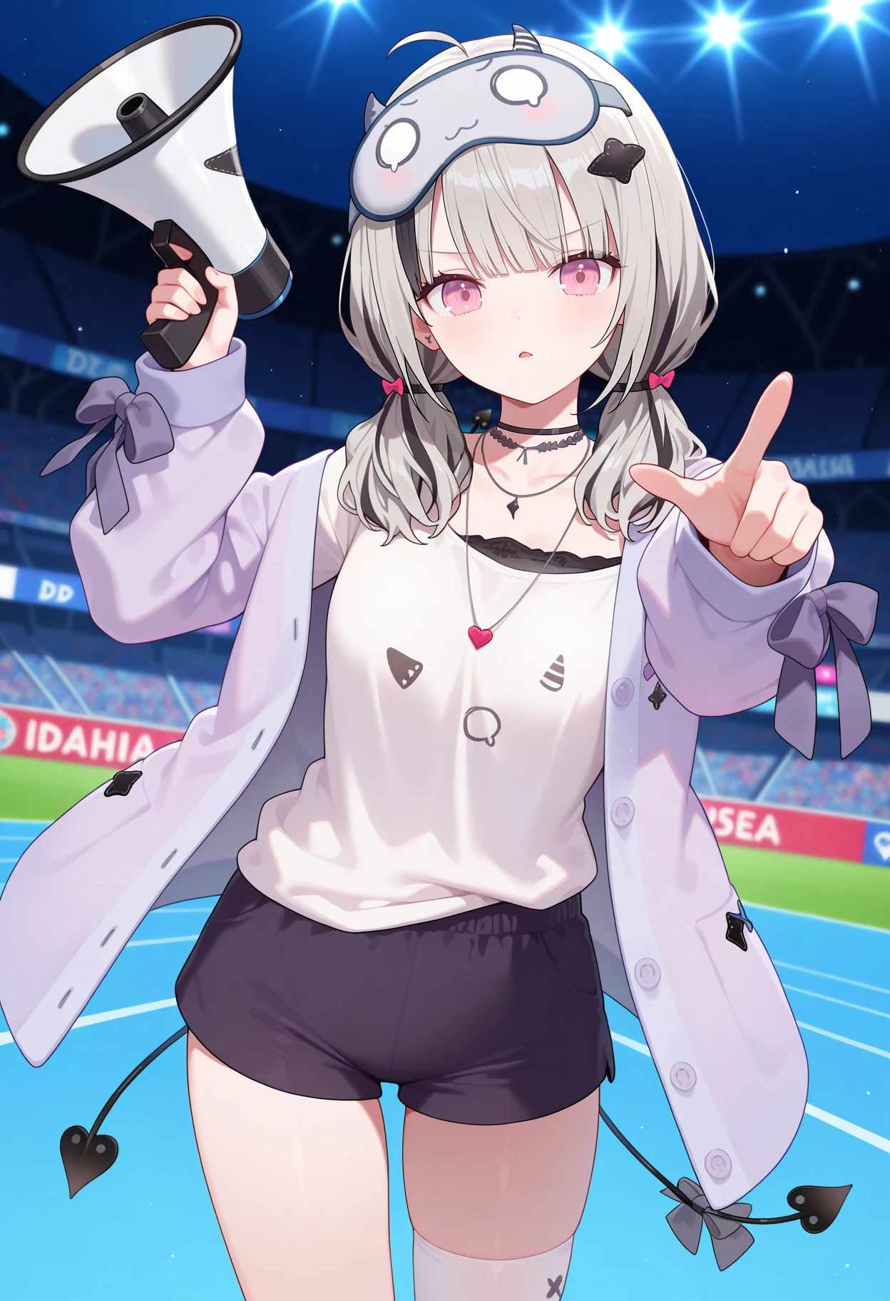 outfit3-1ddsena, streaked hair, grey hair, low twintails, mask on head, sleep mask, hair ornament, blunt bangs, pink eyes, two tails, demon tail, black choker, necklace, white shirt, light purple jacket, long sleeves, short shorts, black shorts, single thighhigh, white thighhighs