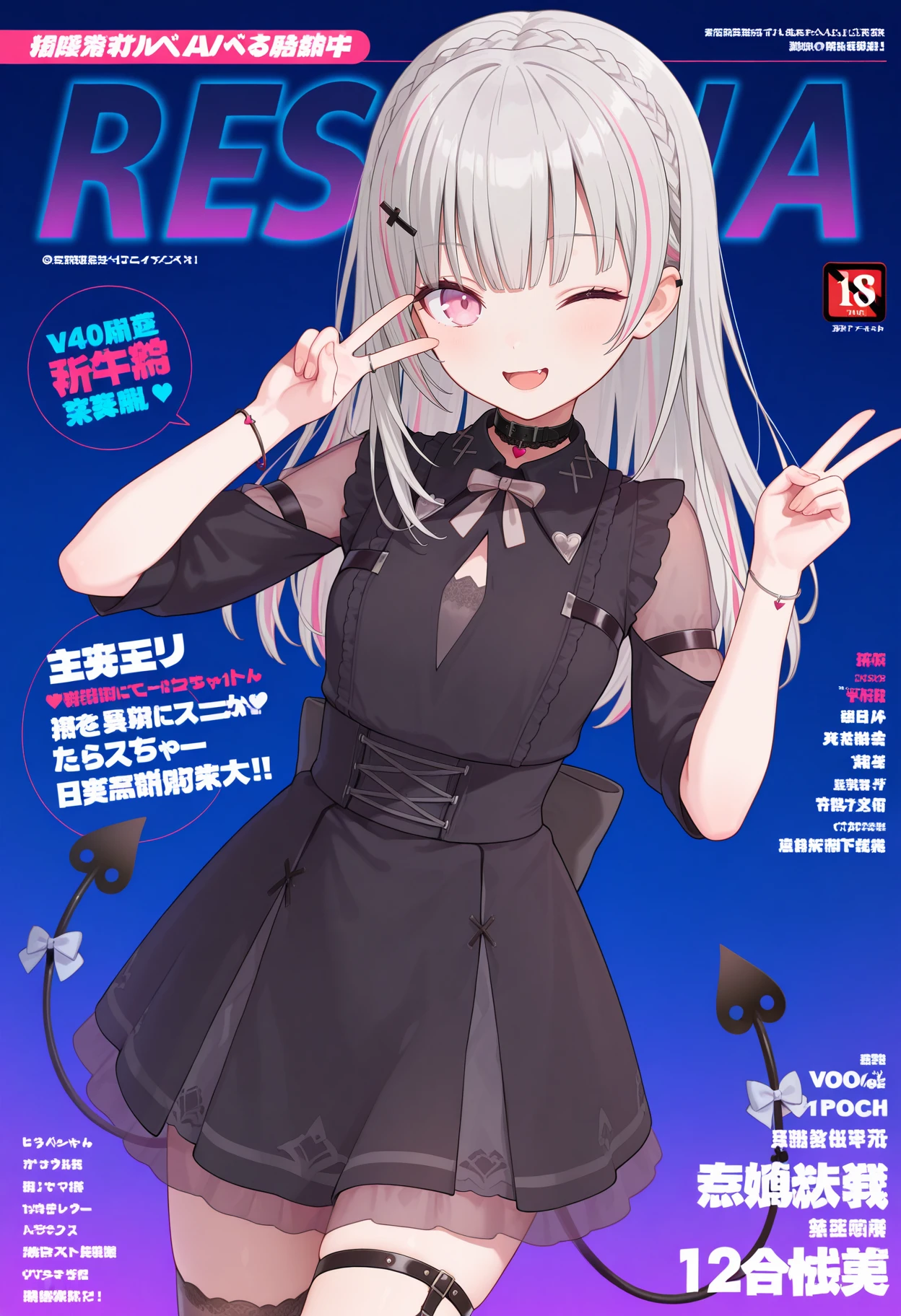 outfit1-1aasena, long hair, streaked hair, grey hair, twintails, head wings, beret, black headwear, x hair ornament, pink eyes, two tails, demon tail, black collar, grey bowtie, clothing cutout, black dress, white jacket, long sleeves, single legwear garter