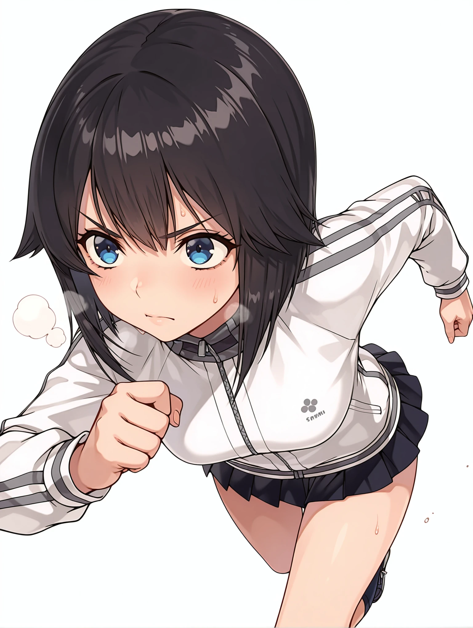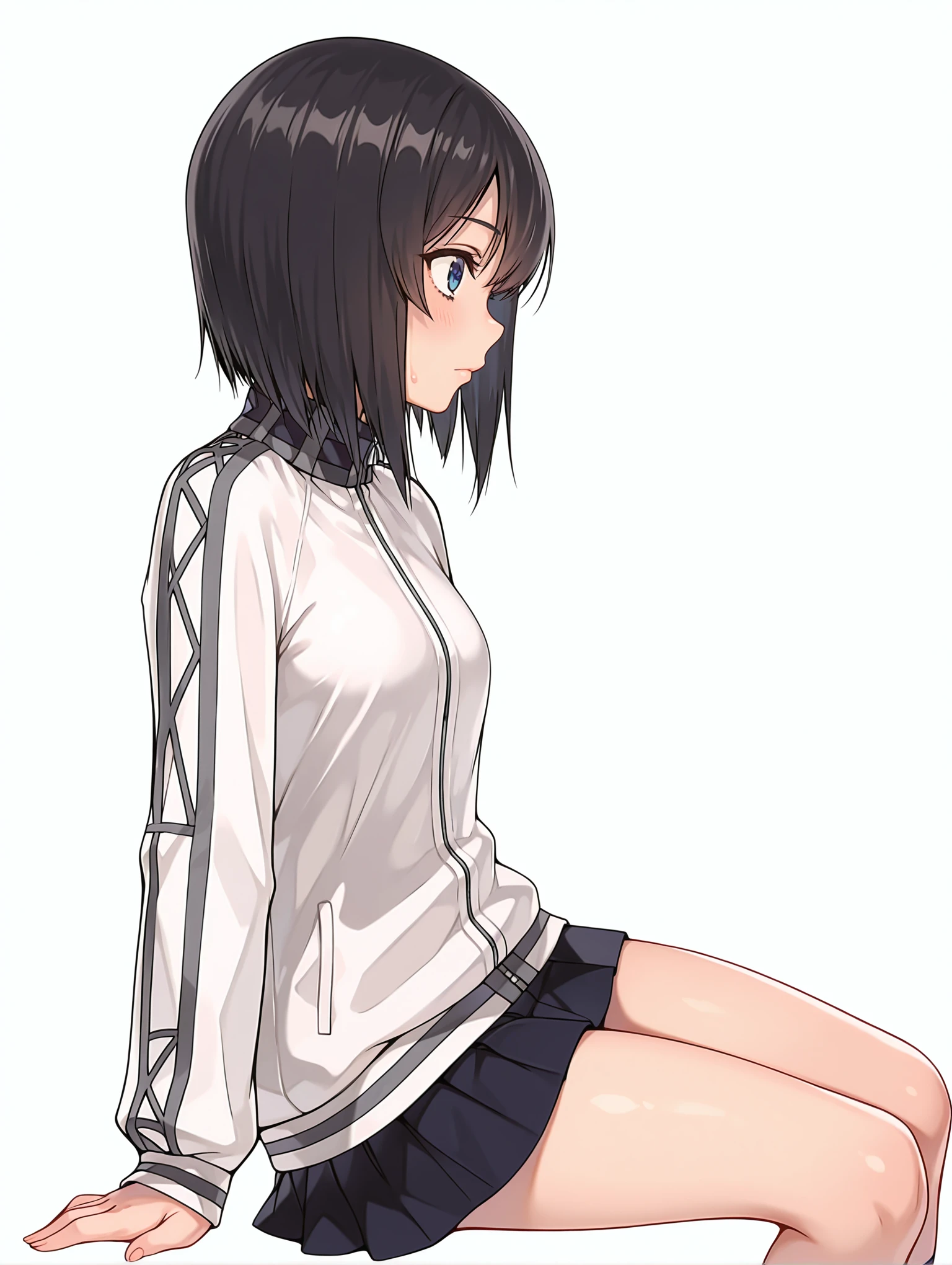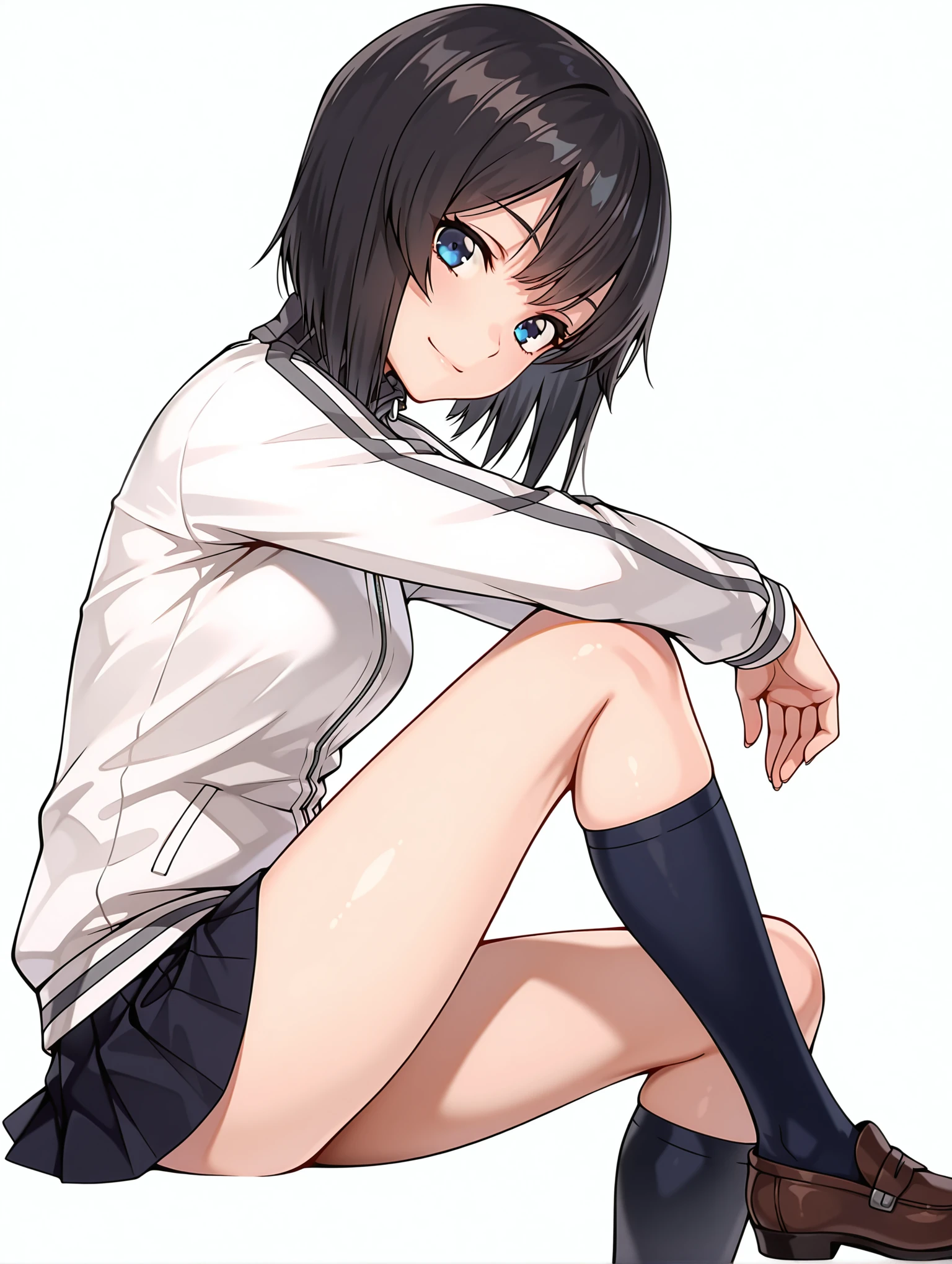 h_clothes,turtleneck,white track jacket,long sleeves,black mini skirt,kneehighs,loafers,