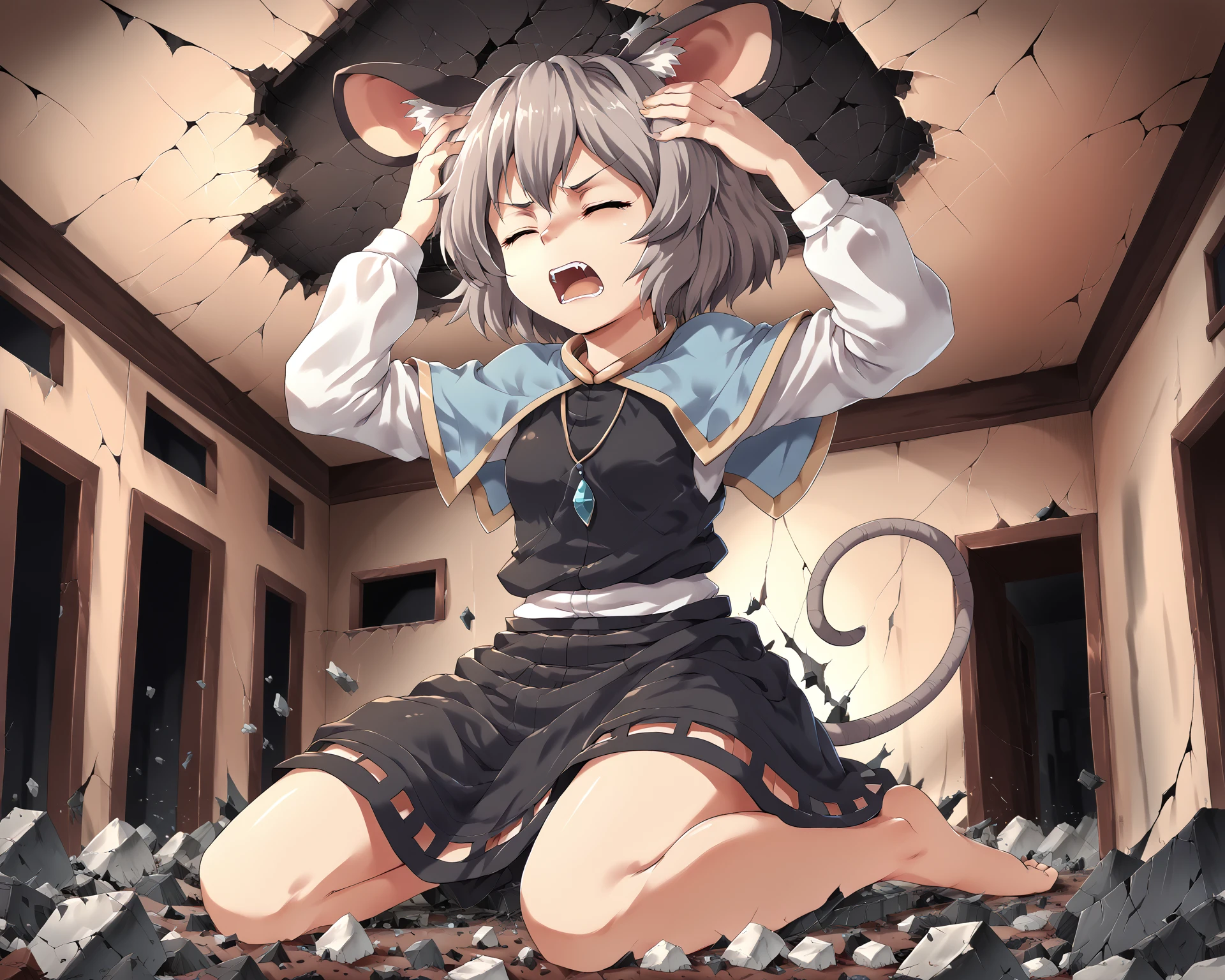 I attempted to train in several subtrigger words, but your mileage will vary on their effectiveness. Head against ceiling, back against wall, and hand against wall/ceiling seem to work a decent amount of the time. Cracked ceiling and cracked wall usually work as expected. The most common issue will be that if the head goes to the ceiling, the hands like to try and follow. Due to extremely little training data with feet on walls/ceilings, feet are a crapshoot. I have managed to generate a foot causing damage to a ceiling a couple times, but neither time was I actually prompting for it.