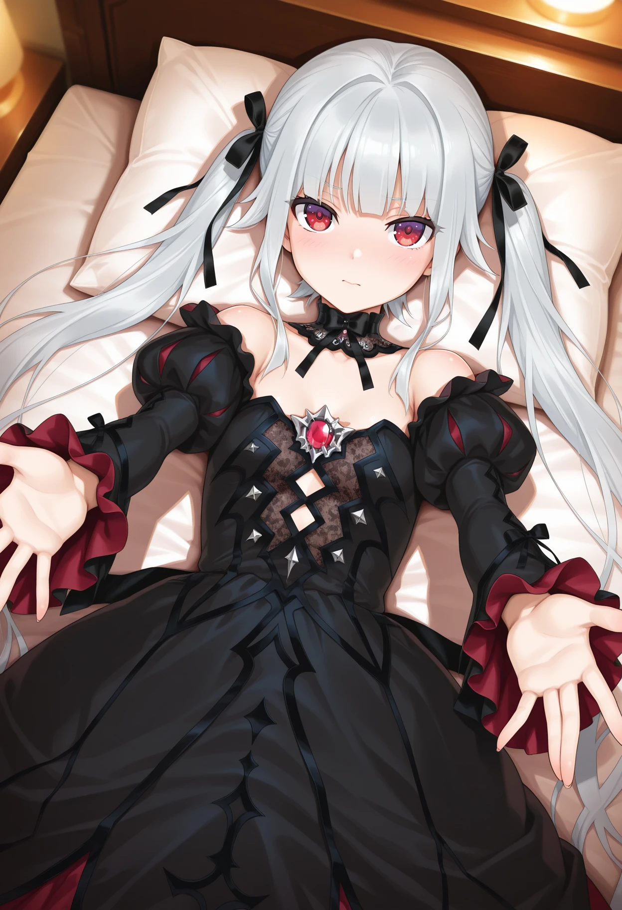 twintails, blunt bangs, very long hair, grey hair, multicolored eyes, purple eyes, red eyes, hair ribbon, black ribbon