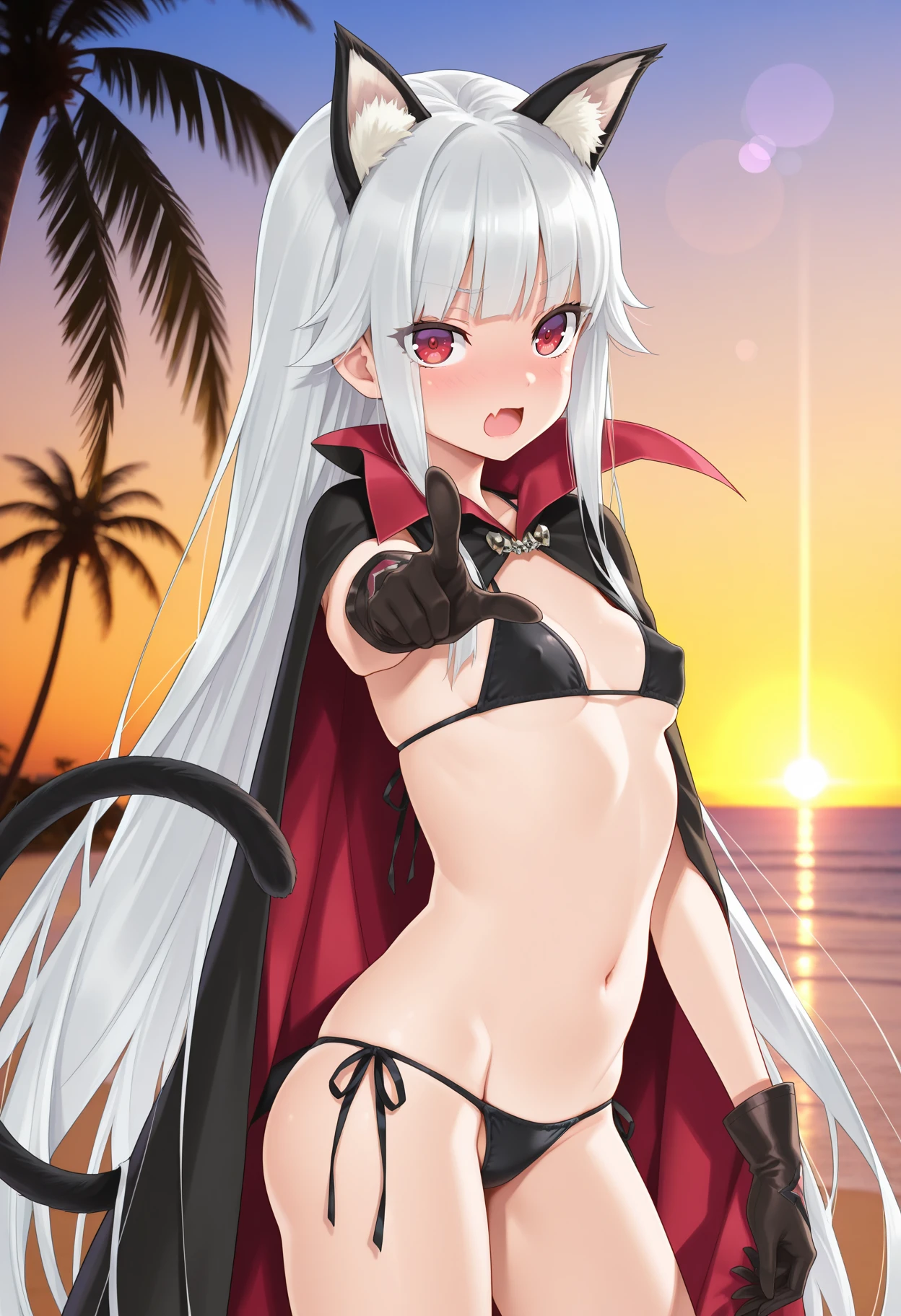 cat ears, cat tail, covered nipples, two-sided cape, black cape, red cape, string bikini, black bikini, small breasts, black gloves, side-tie bikini bottom