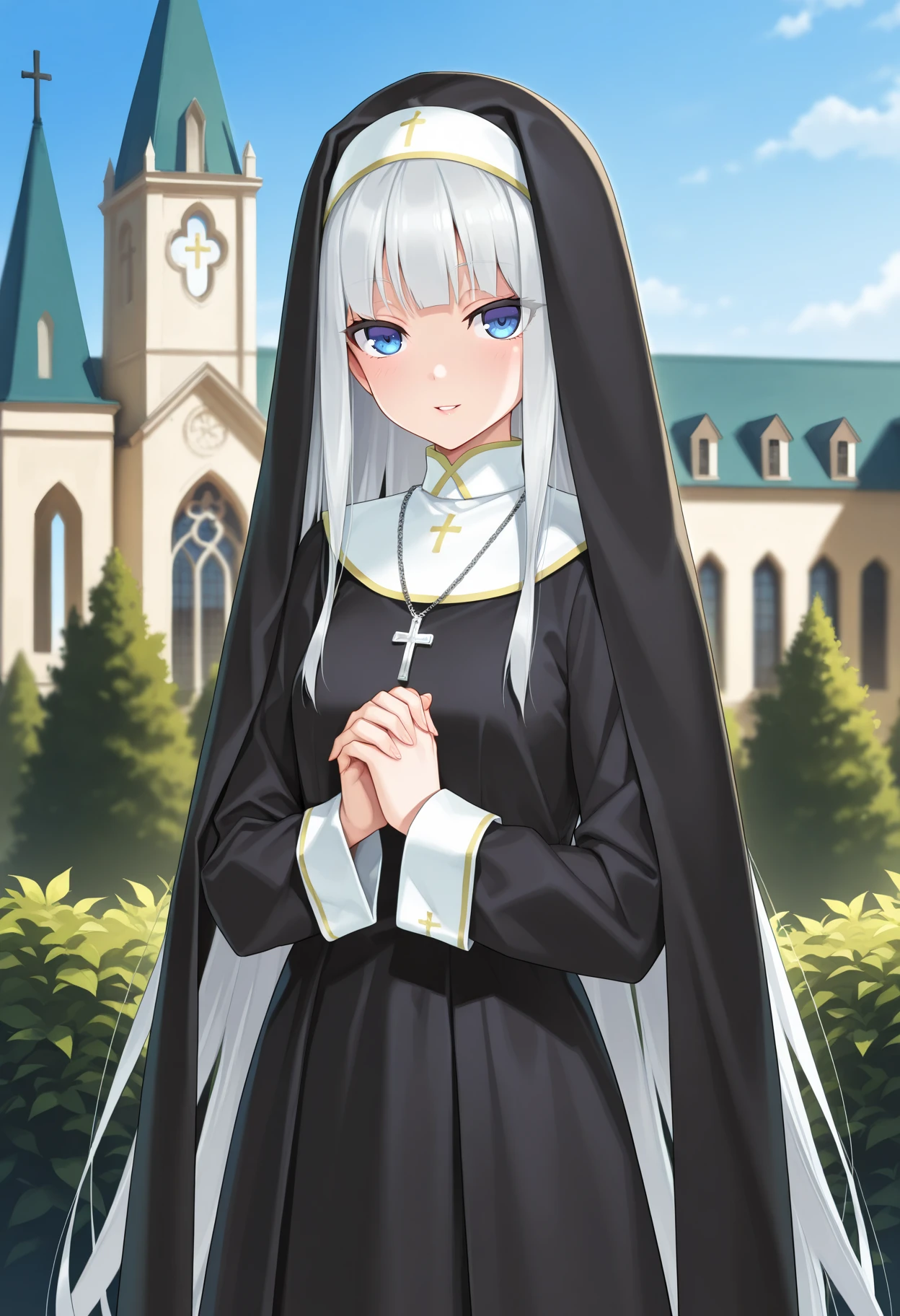 traditional nun, black veil, white collar, black robe, cross necklace, sleeves past wrists