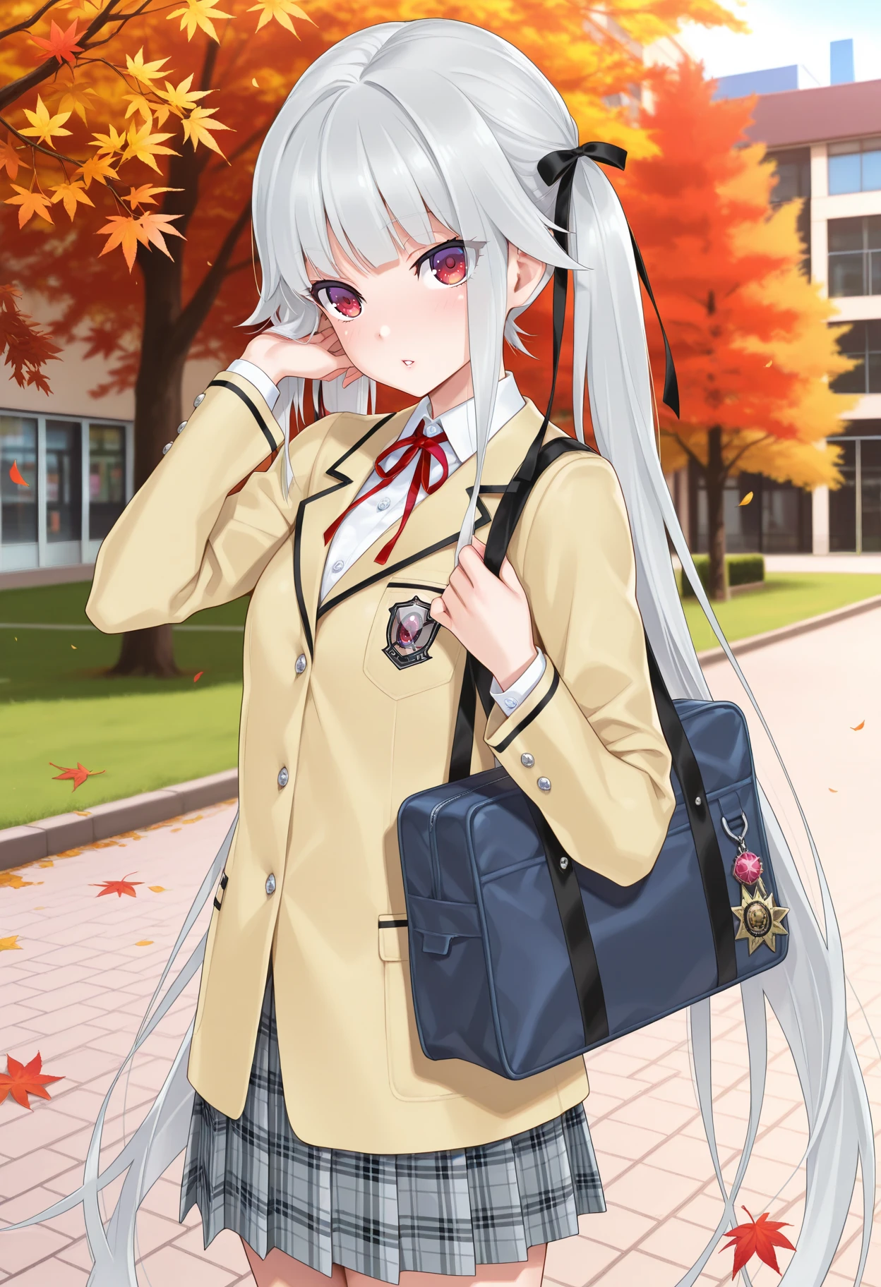 blazer, yellow jacket, collared shirt, neck ribbon, red ribbon, white shirt, plaid skirt, pleated skirt, grey skirt