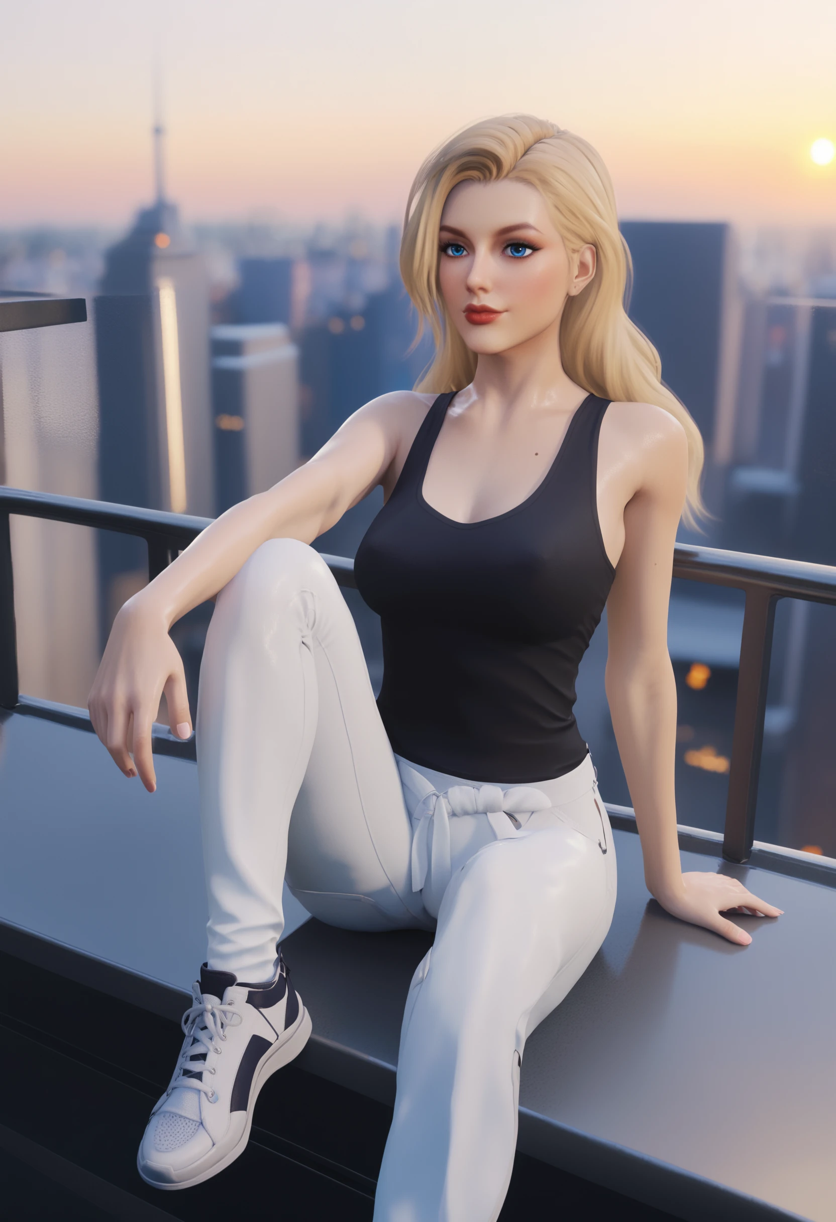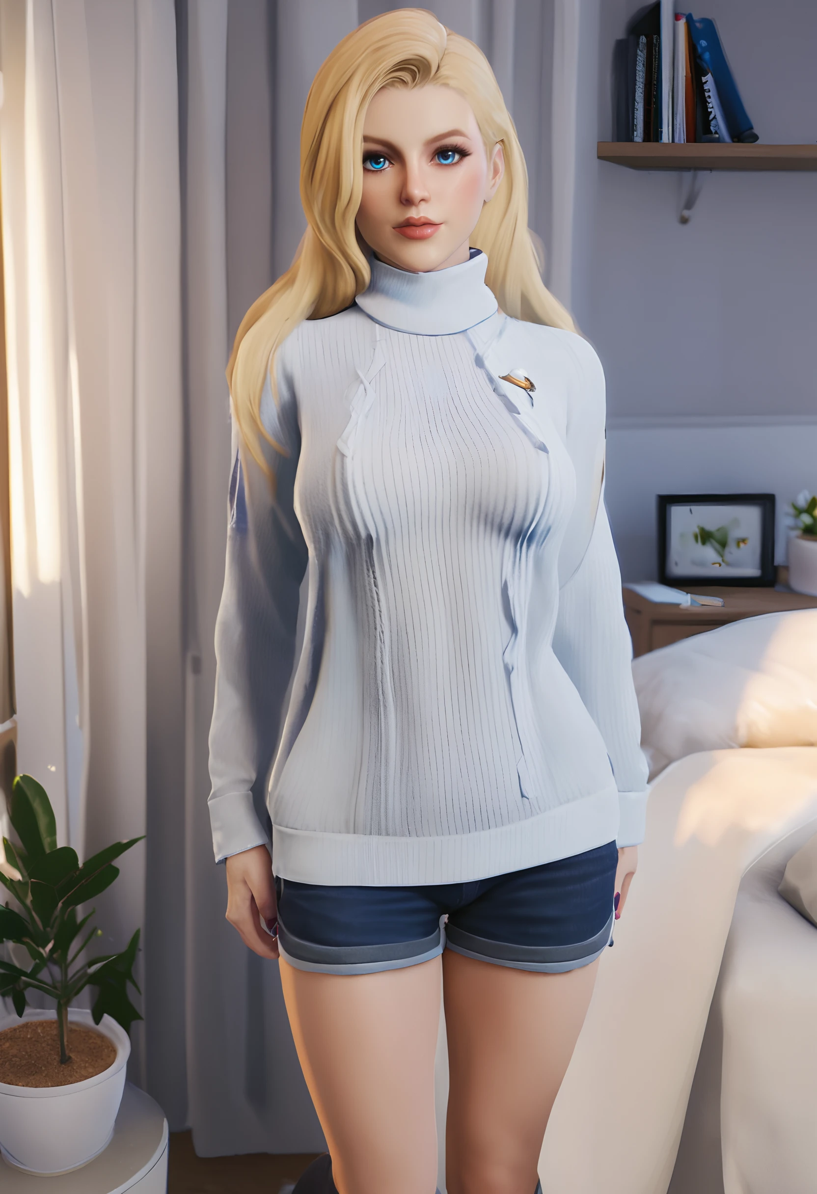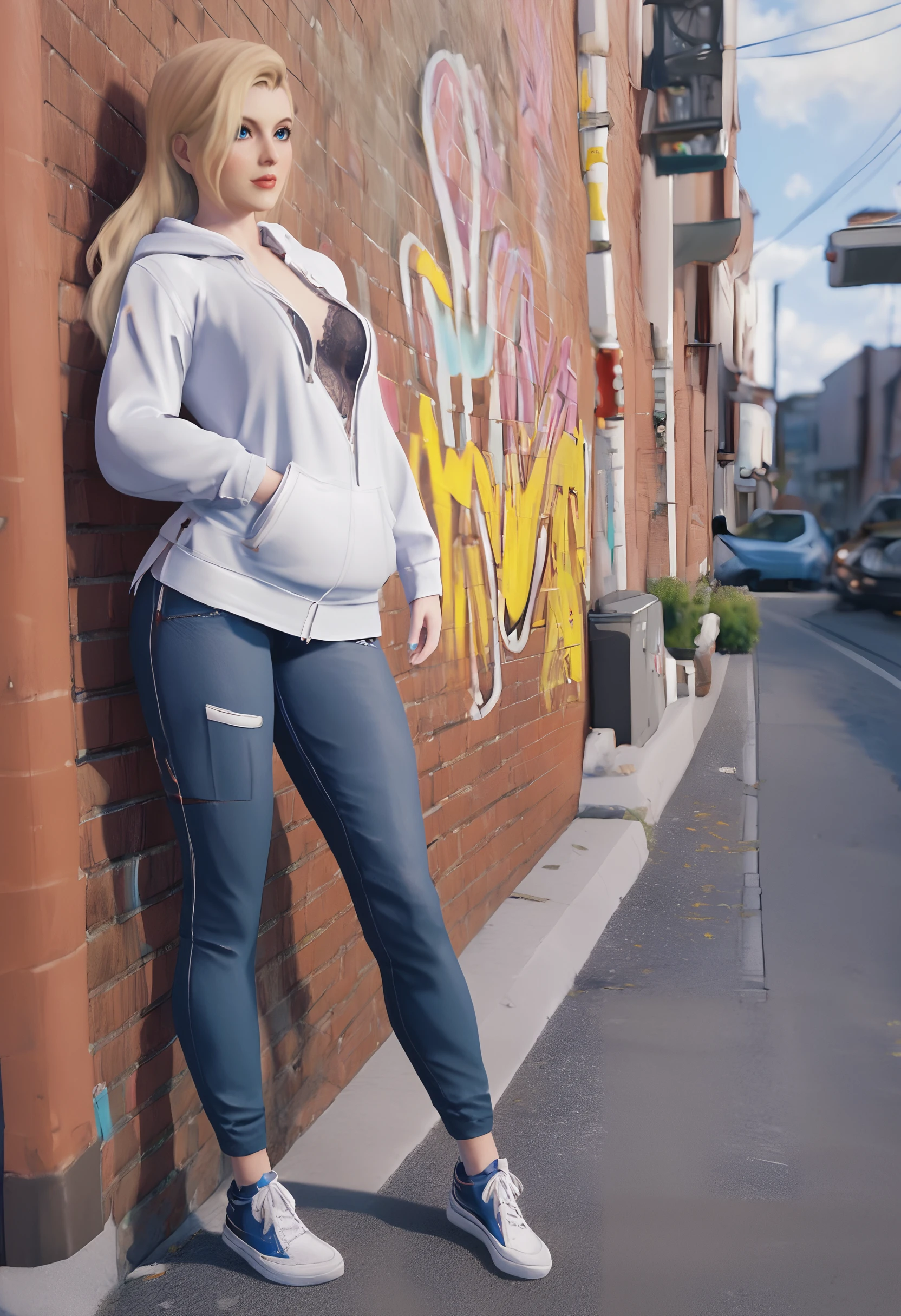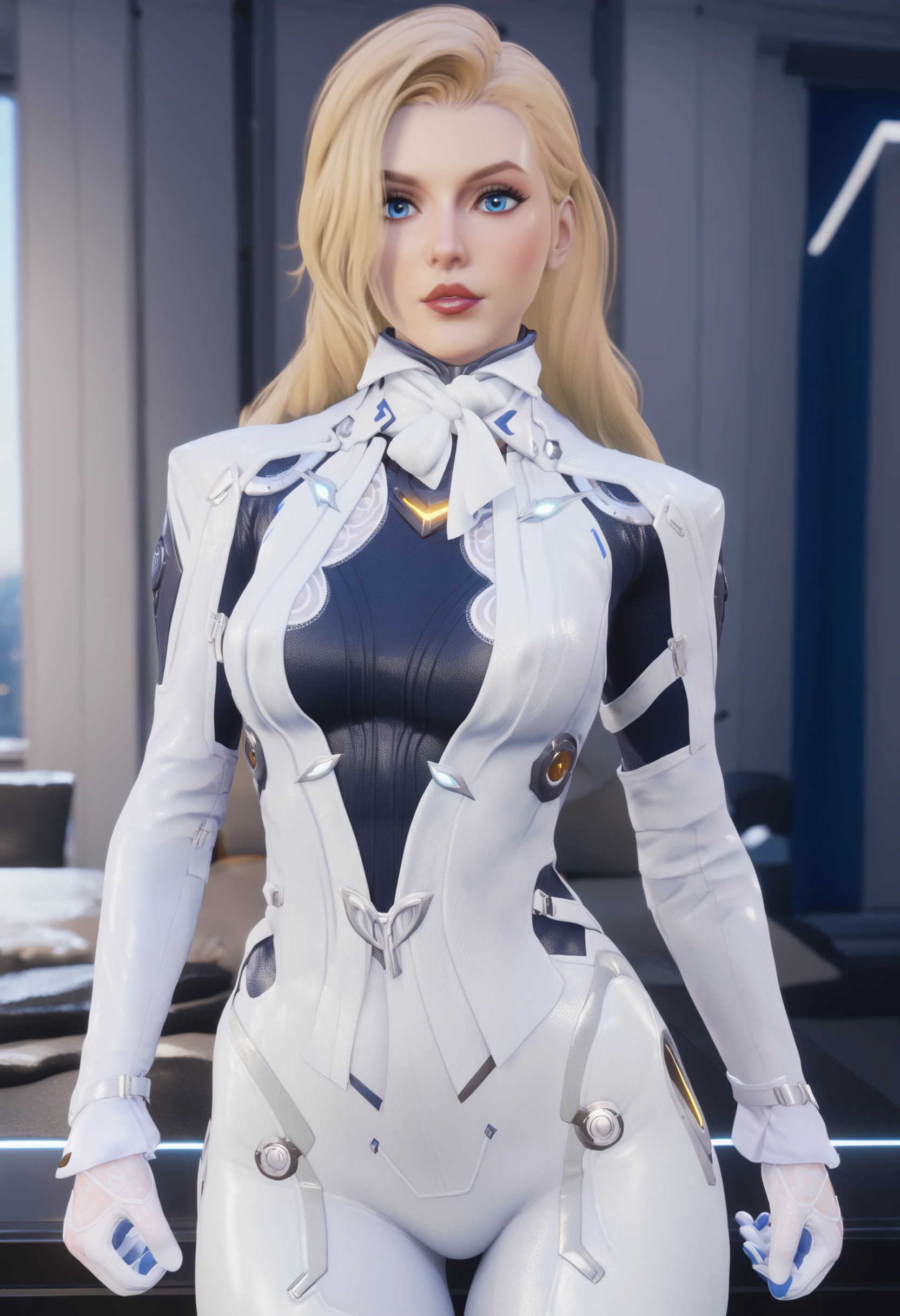 blonde hair, long hair, wavy hair, hair over one eye, hair behind ear, blue eyes, freckles, natural makeup, soft lipstick, thigh gap, white gloves, long sleeves, white bodysuit, white jacket, jacket, white pants