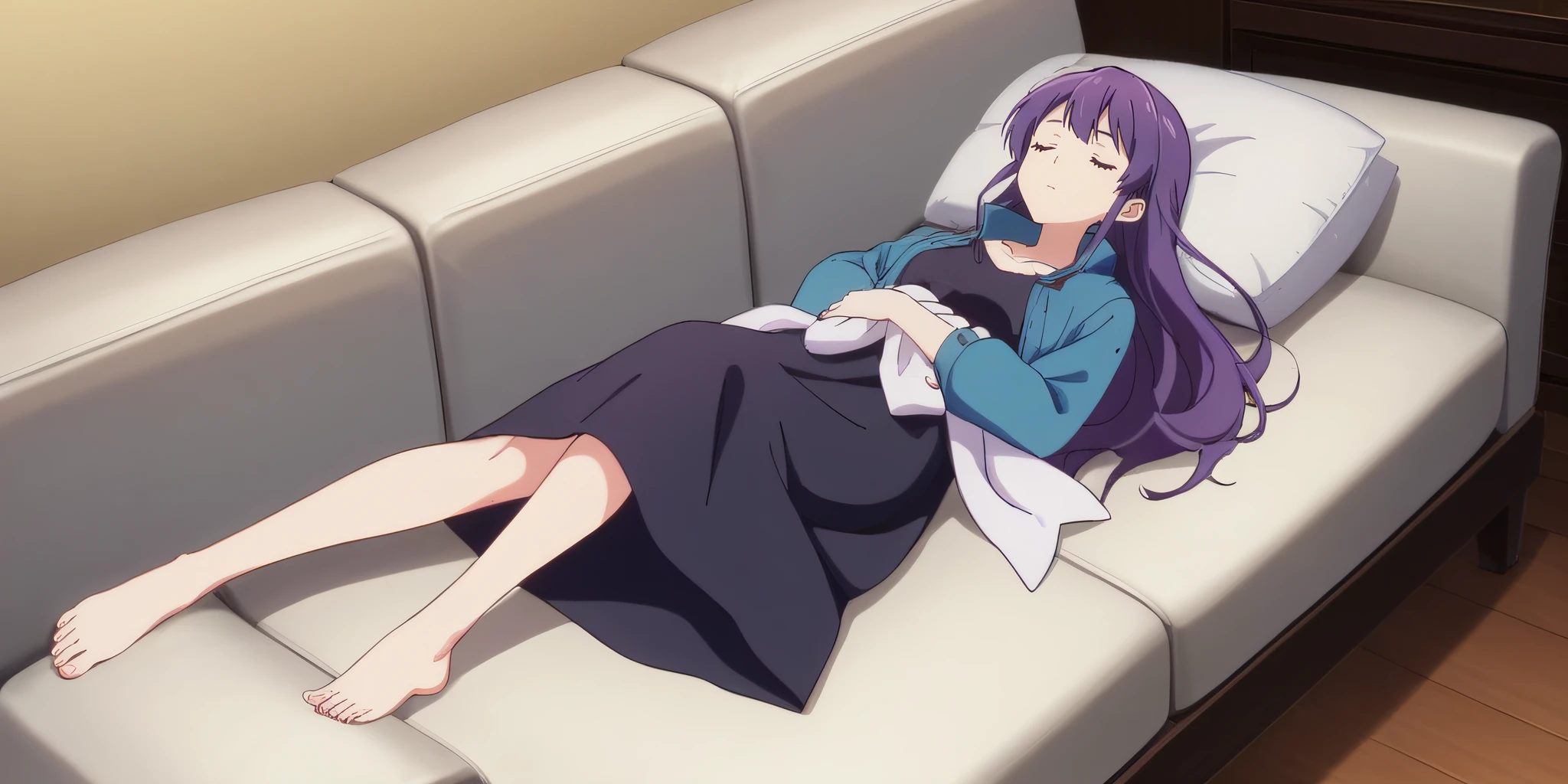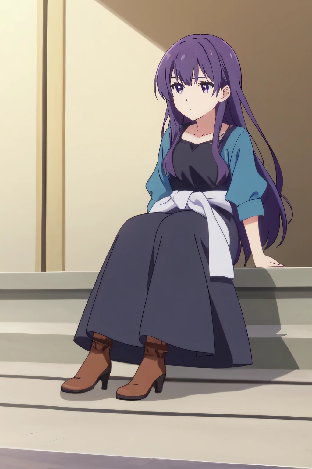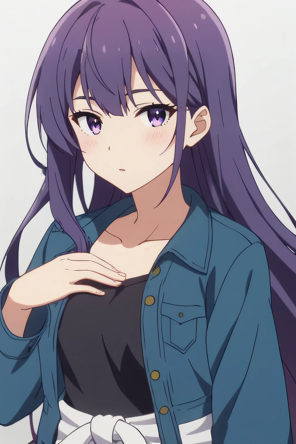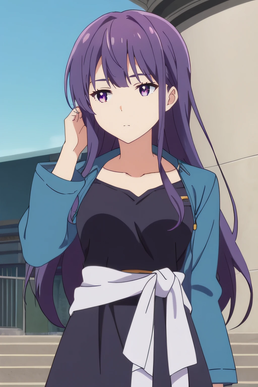 collarbone, black dress, blue jacket, long sleeves, white knot, white knot around waist