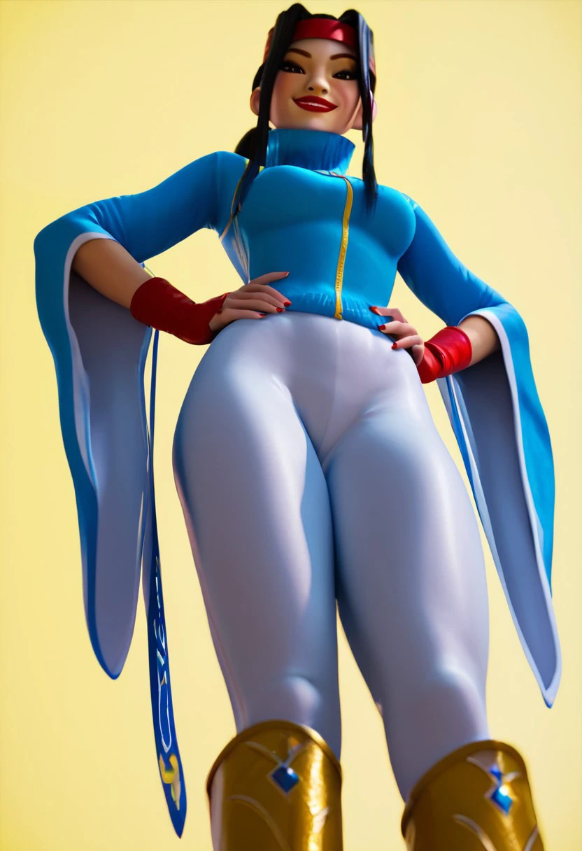 chang'e_tt, 1girl, asian, high ponytail (black hair, red headband), big eyelashes, brown eyes, makeup, red eyeshadow, red lipstick, red nails, red wristbands, blue track jacket (turtleneck, wide sleeves), light blue spandex, yellow boots,