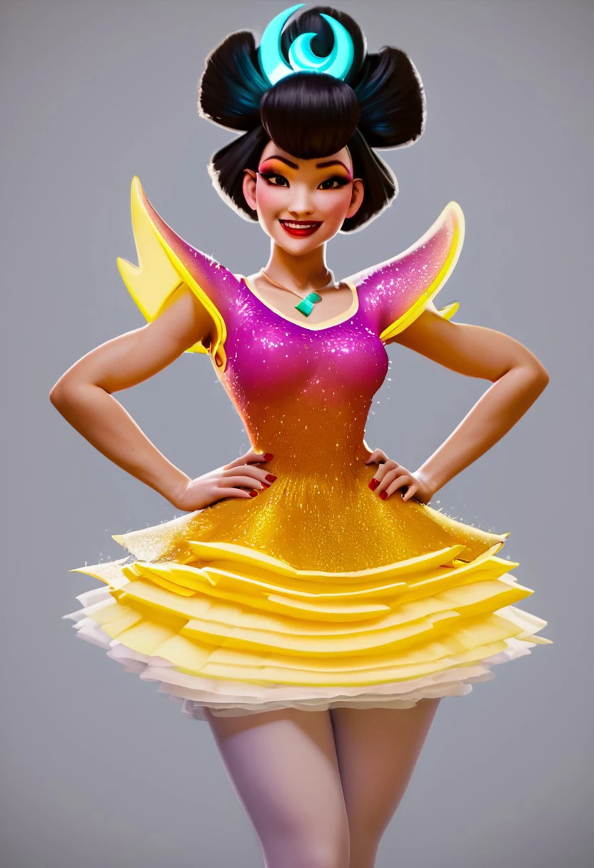 chang'e_show, 1girl, asian, geisha hair (black hair, multiple hair buns), hair ornament (moon shape), big eyelashes, brown eyes, makeup, red eyeshadow, red lipstick, red nails, necklace, pink and yellow tutu (glitter), white pantyhose, light blue high heels,