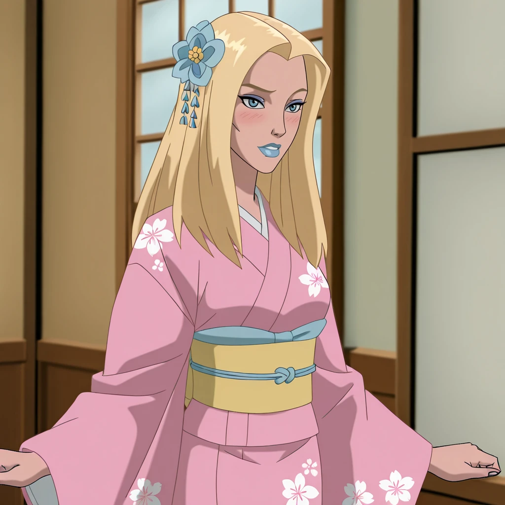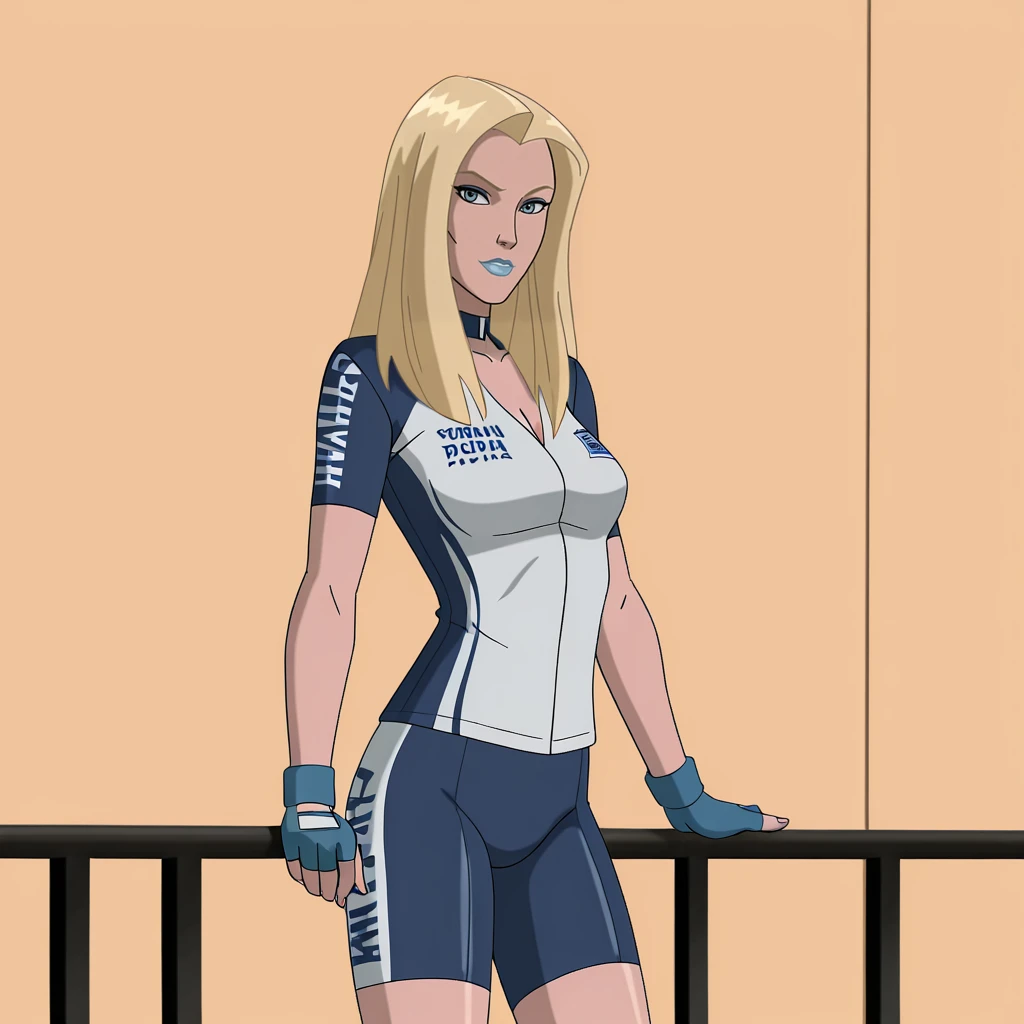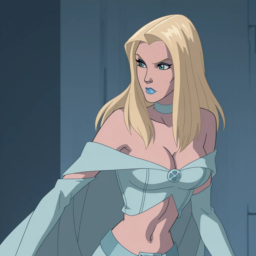 Trigger with costume: EmmaFrostWolverineXmenCostume, 1girl,blonde hair, navel, midriff, cape, medium breasts, lipstick, long hair, makeup, cleavage, blue lips, bare shoulders, crop top, off shoulder, belt