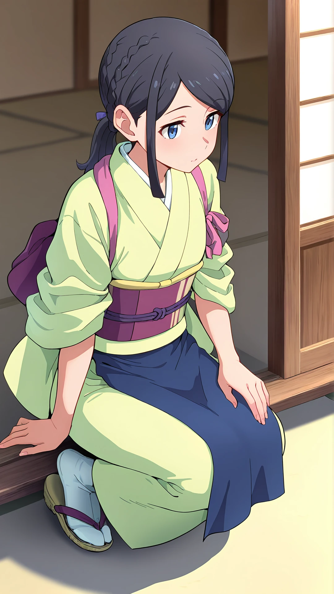 gbfmisaki, 1girl, black hair, ponytail, braid, sidelocks, blue eyes, japanese clothes, kimono, green kimono, sash, obi, tasuki, apron, blue apron, sandals, tabi