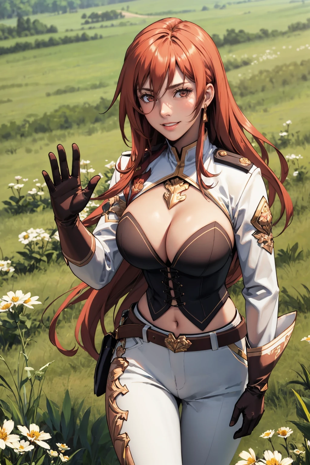 Add "hair between eyes, white jacket, long sleeves, cleavage cutout, bodice, white pants, black belt, brown gloves" for her Lord outfit.