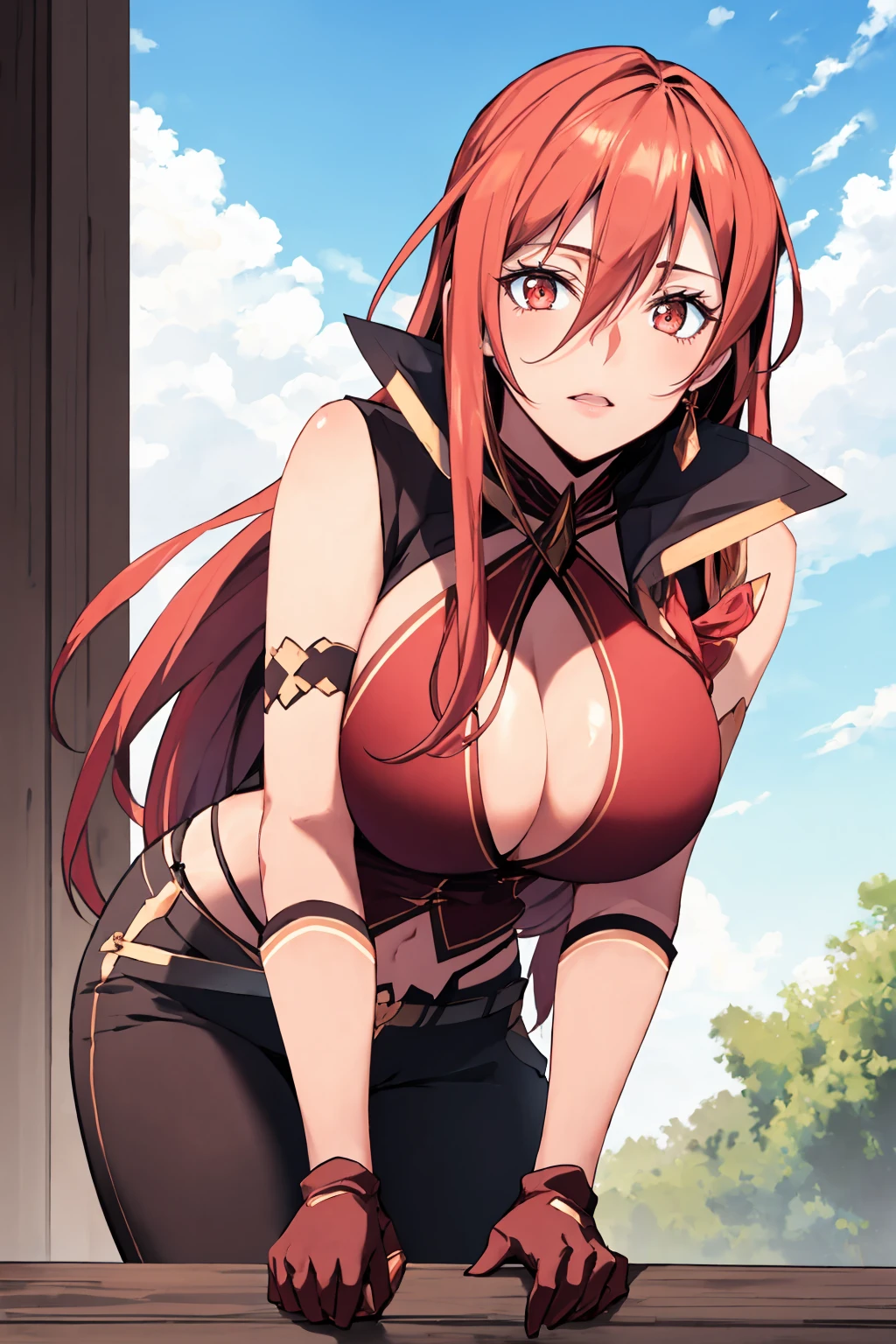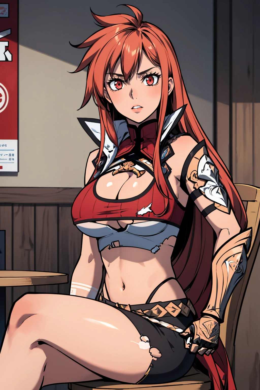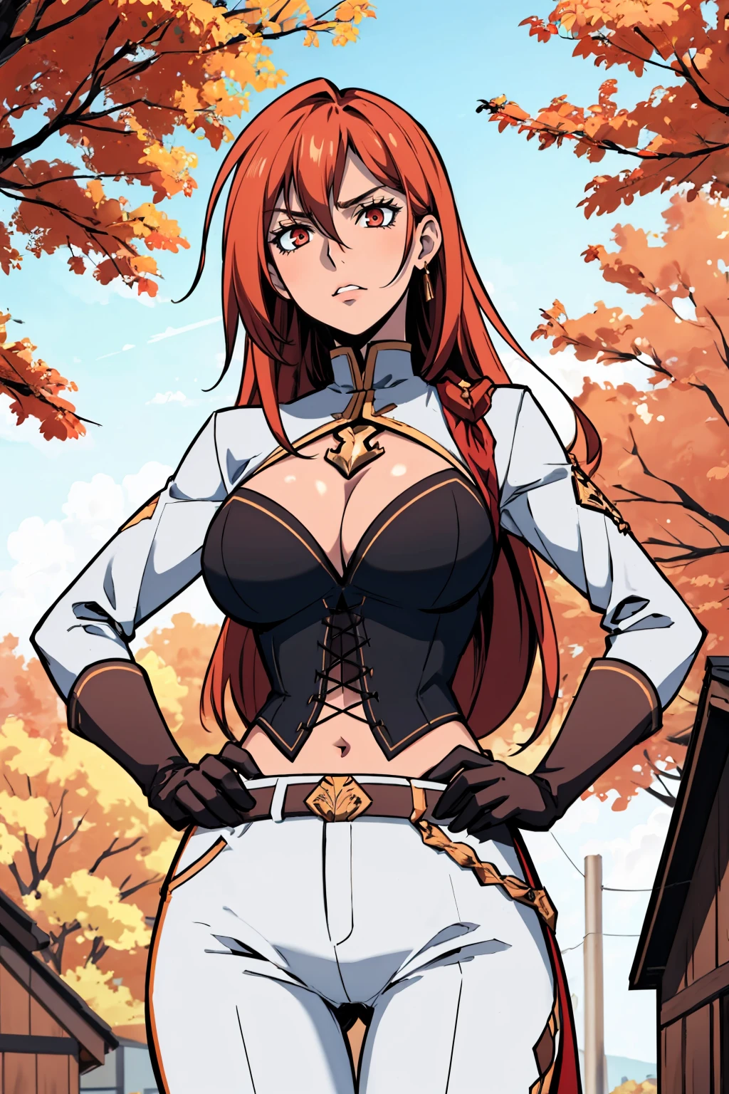 Add "sidelocks, braid, popped collar, red crop top, cleavage cutout, underboob, torn pants, single gauntlet, asymmetrical legwear" for her first default outfit.