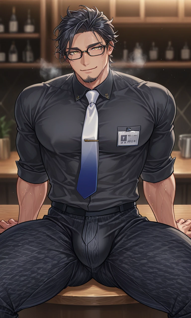 Naoakira,male,mature,thick body,glasses,goatee,big pectorals,black hair,yellow eyes,manly