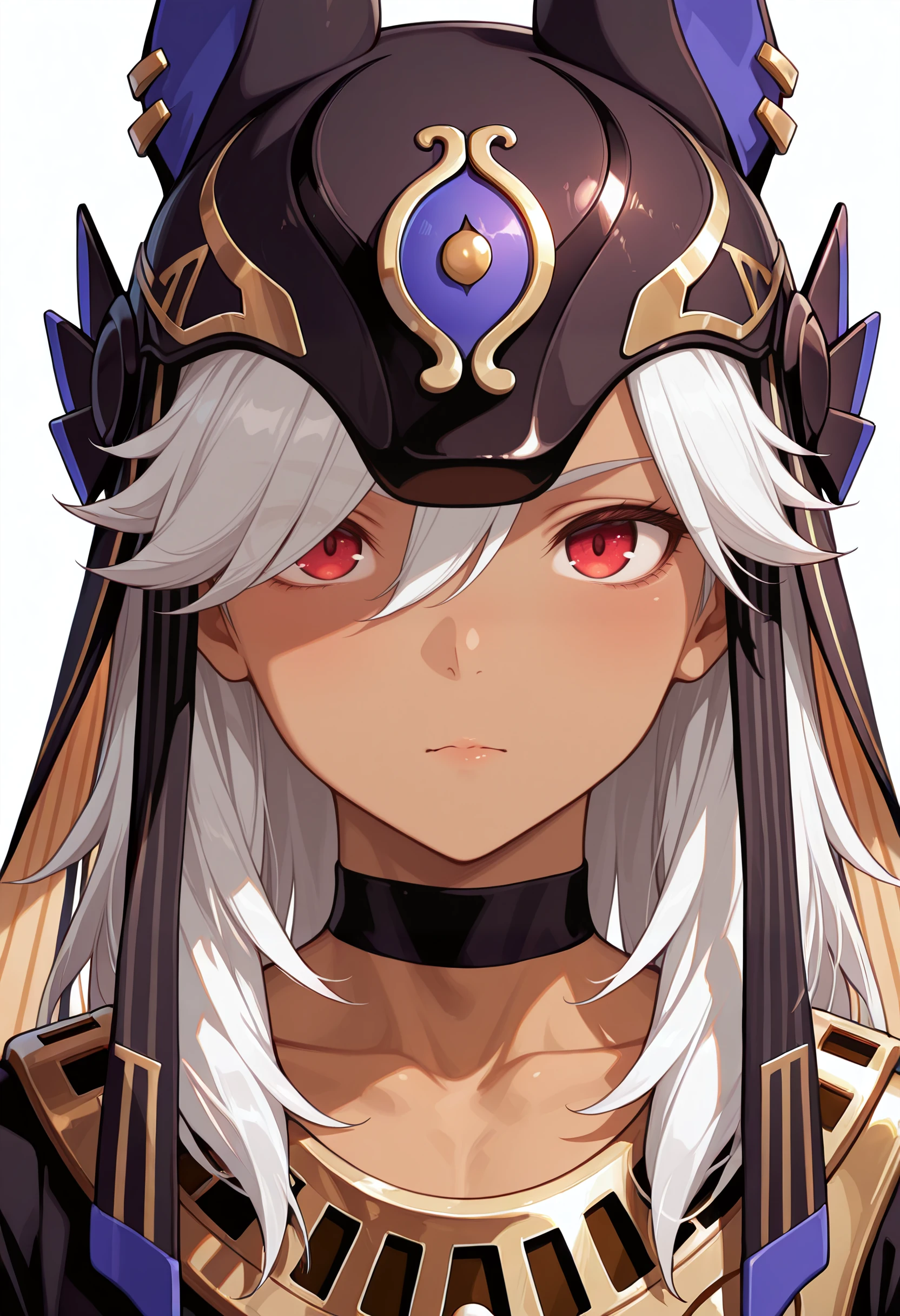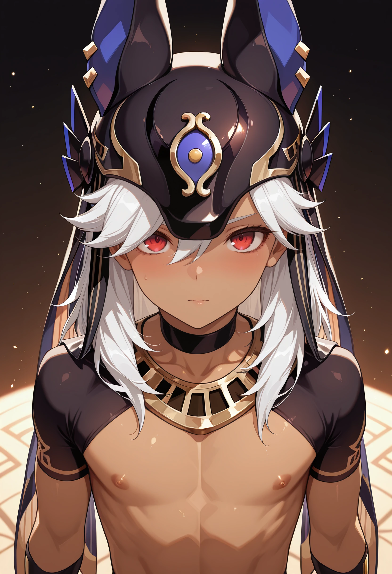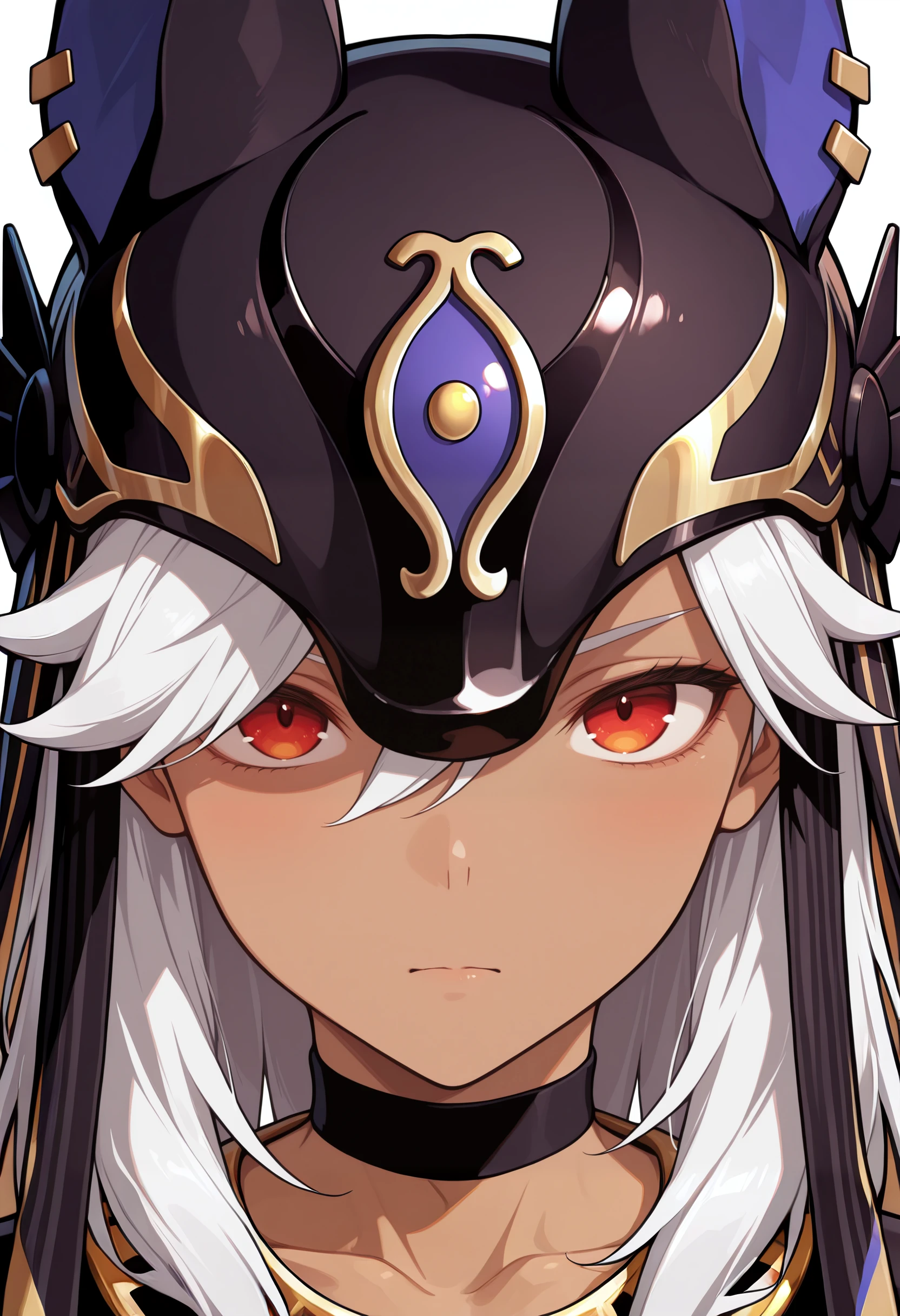 cyno, black choker, long hair, male focus, holding, hair over one eye, animal hat, choker, 1boy, solo focus, closed mouth, animal ears, artist name, jackal ears, hat, black headwear, bangs, short sleeves, looking at viewer, standing, holding polearm,