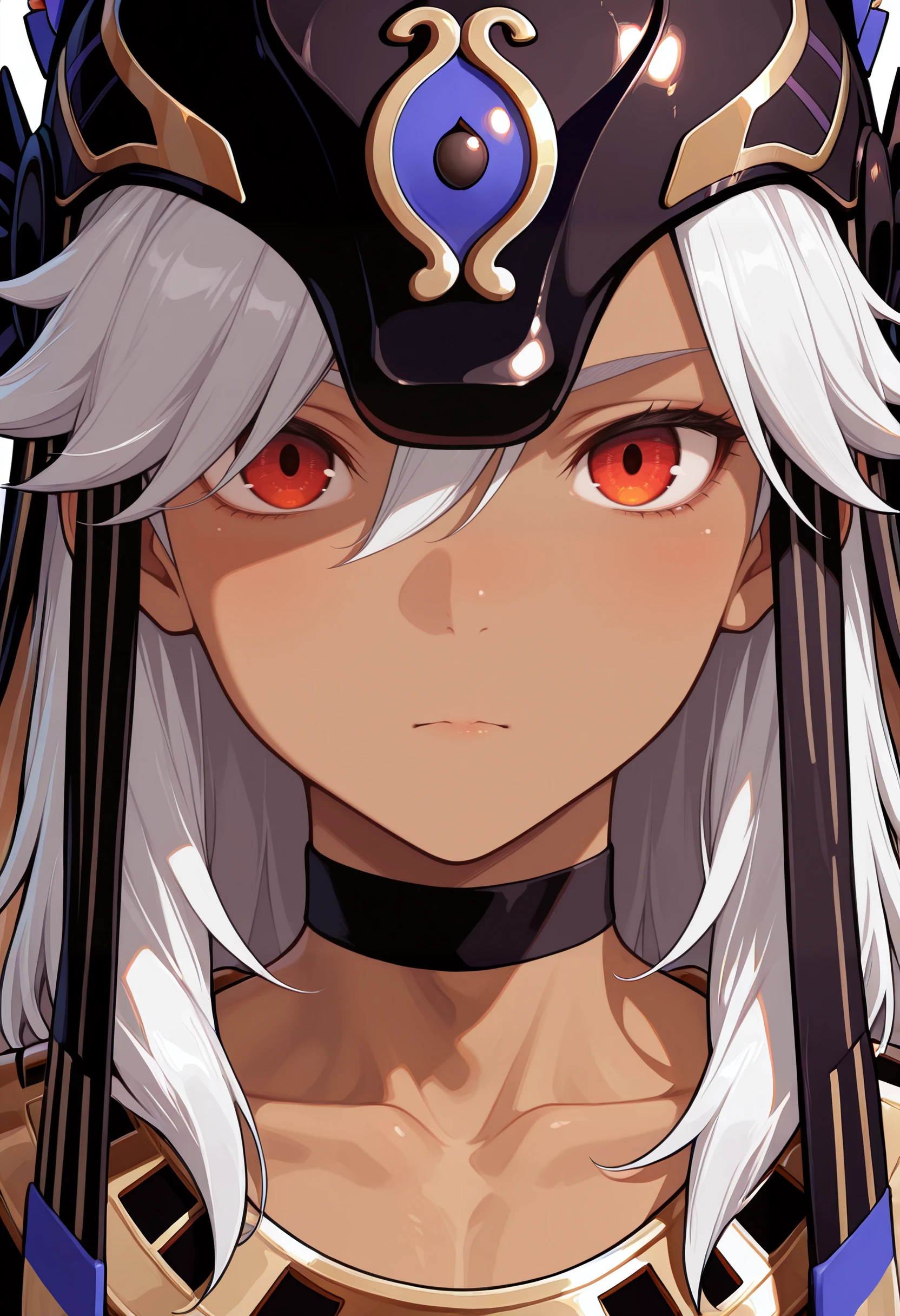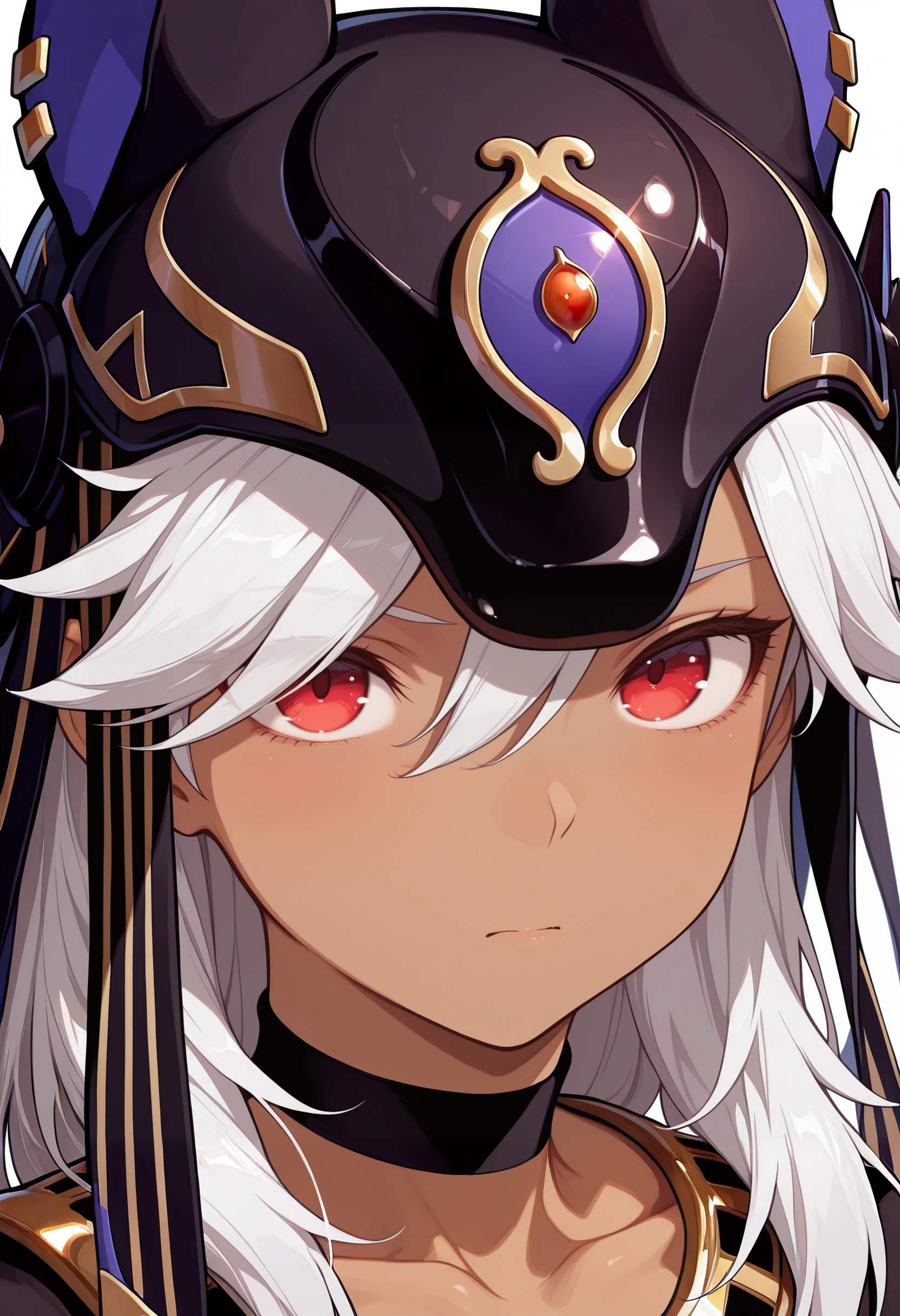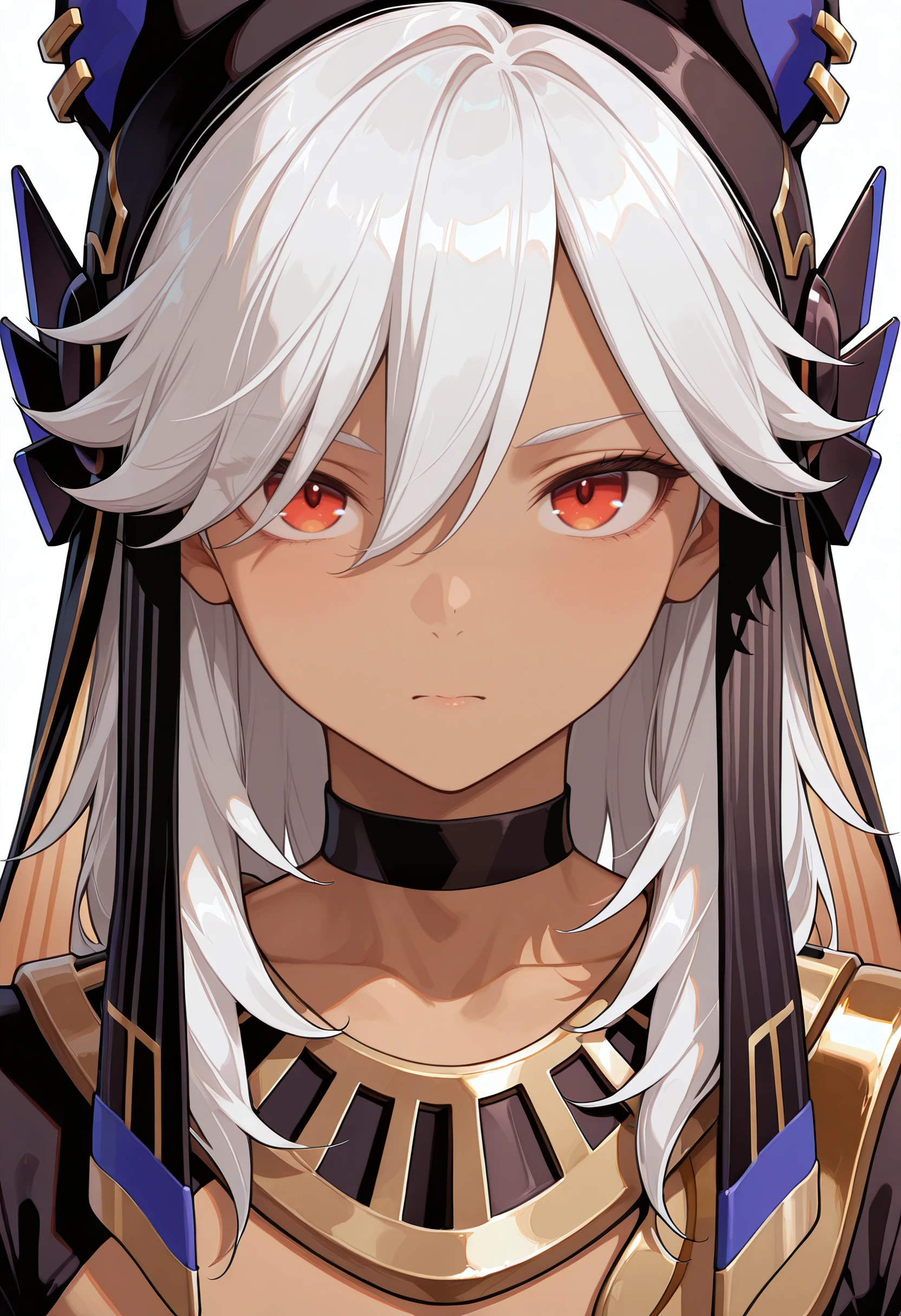 cyno, black choker, long hair, male focus, holding, hair over one eye, animal hat, choker, 1boy, solo focus, closed mouth, animal ears, artist name, jackal ears, hat, black headwear, bangs, short sleeves, looking at viewer, standing, holding polearm,