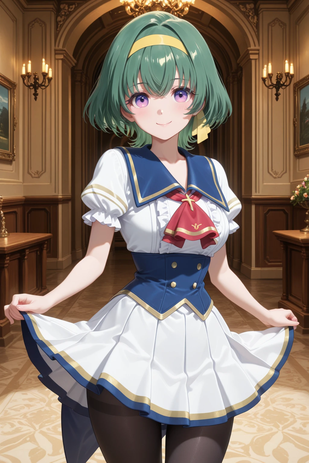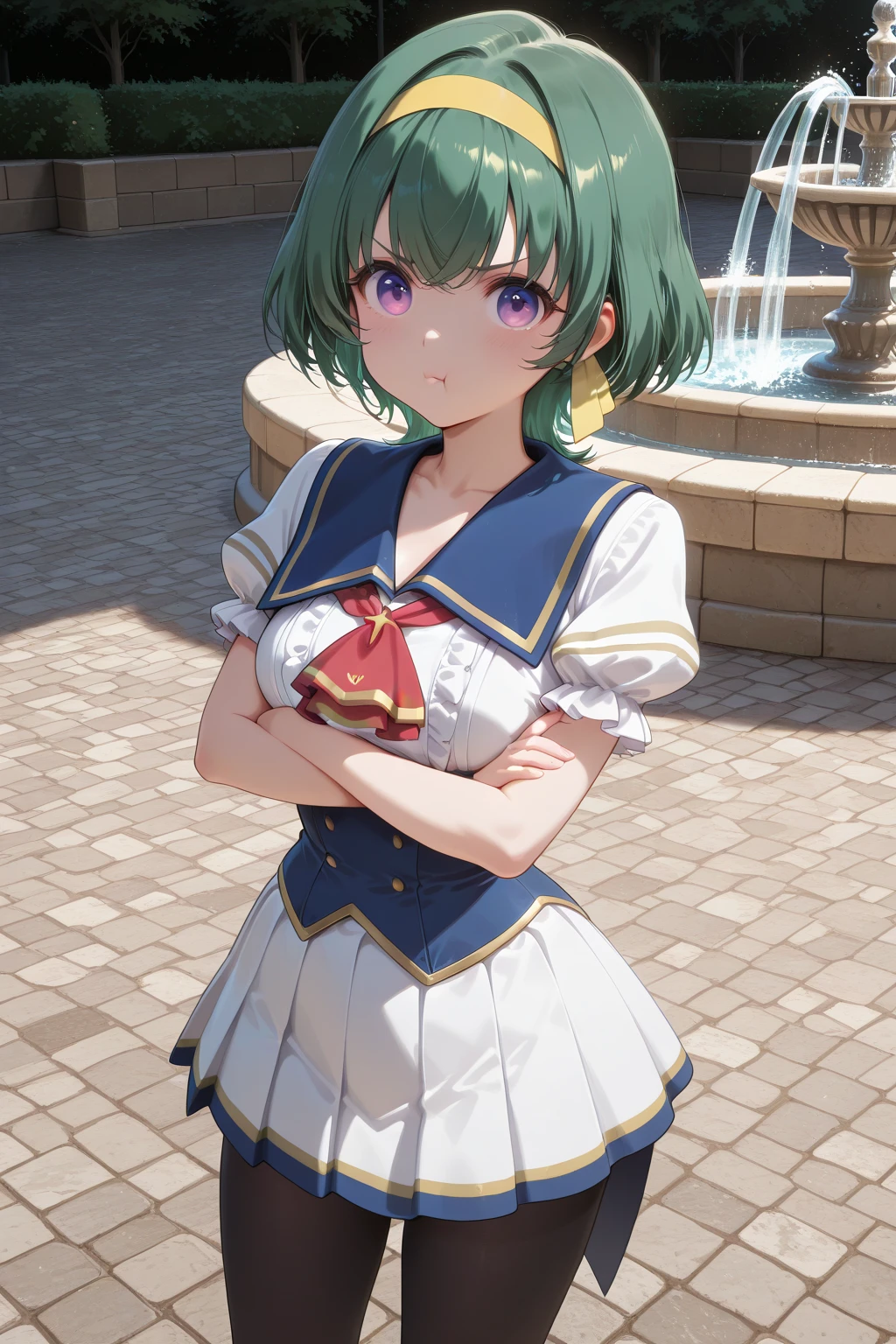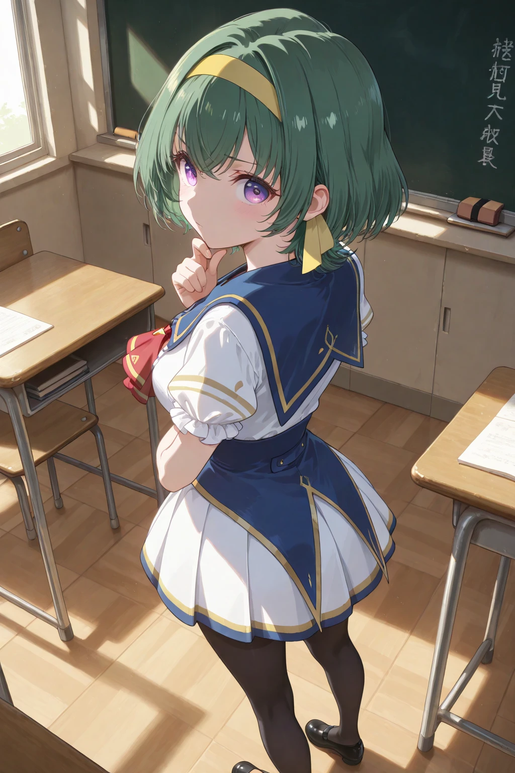 LRL_Lynette, green hair, short hair, yellow hairband, yellow hair ribbon, bangs, purple eyes, school uniform, white shirt, blue sailor collar, red ascot, blue corset, puffy short sleeves, frilled sleeves, white skirt, pleated skirt, black pantyhose
