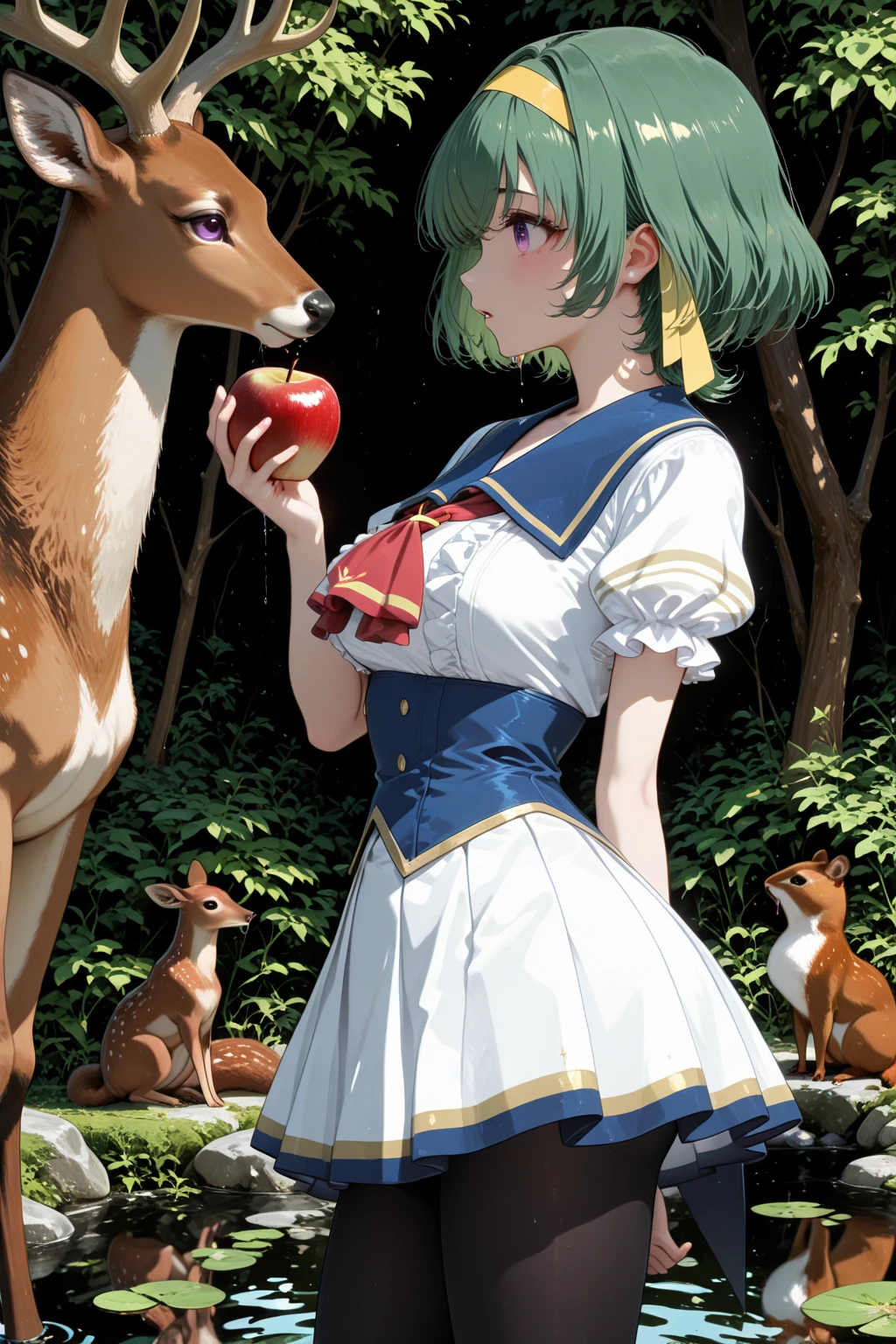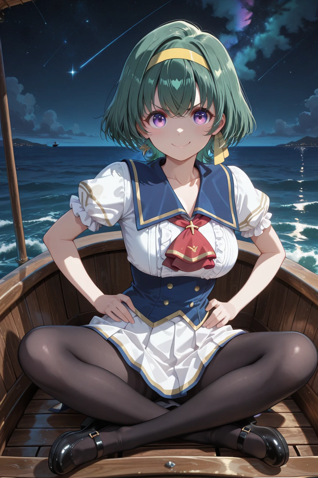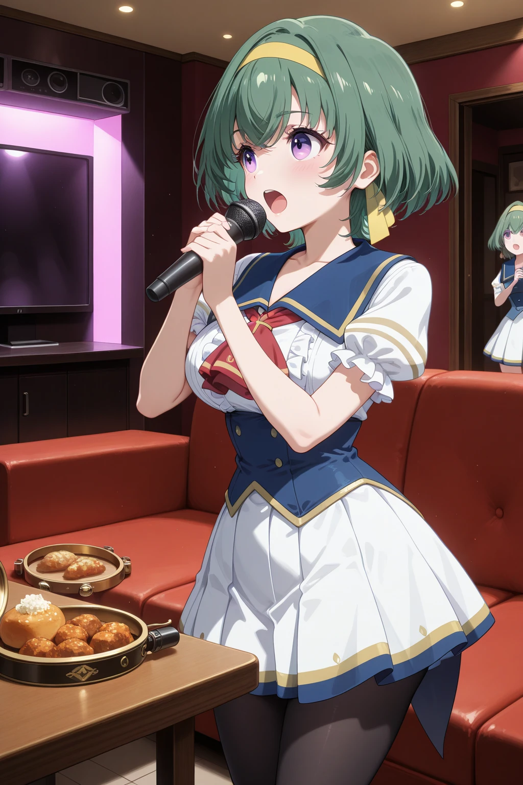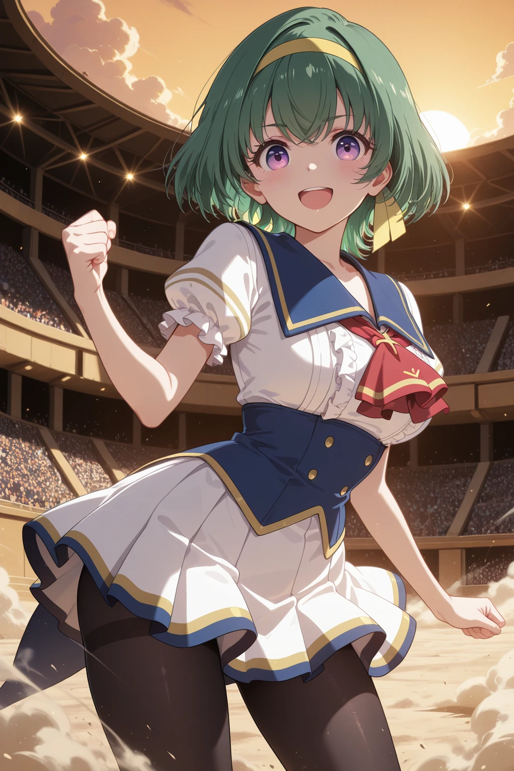 LRL_Lynette, green hair, short hair, yellow hairband, yellow hair ribbon, bangs, purple eyes, school uniform, white shirt, blue sailor collar, red ascot, blue corset, puffy short sleeves, frilled sleeves, white skirt, pleated skirt, black pantyhose