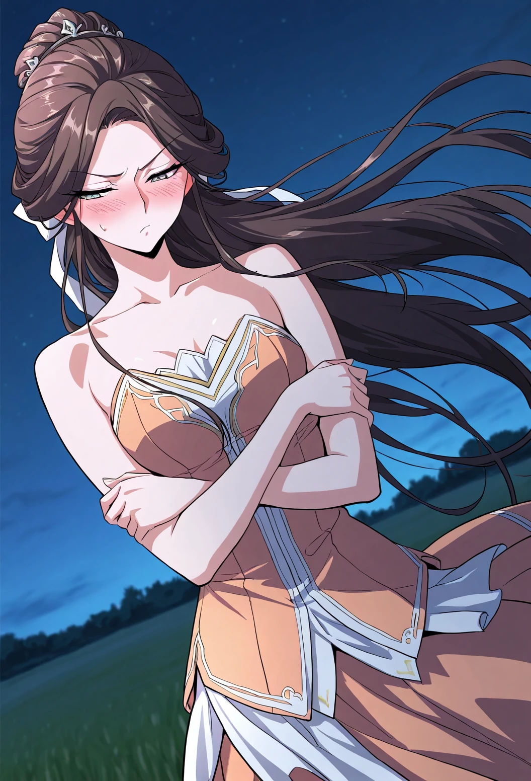 light orange dress, asymmetrical dress, sleeveless, strapless, high slit, white trim, layered skirt, open front skirt, fitted bodice, bare shoulders,