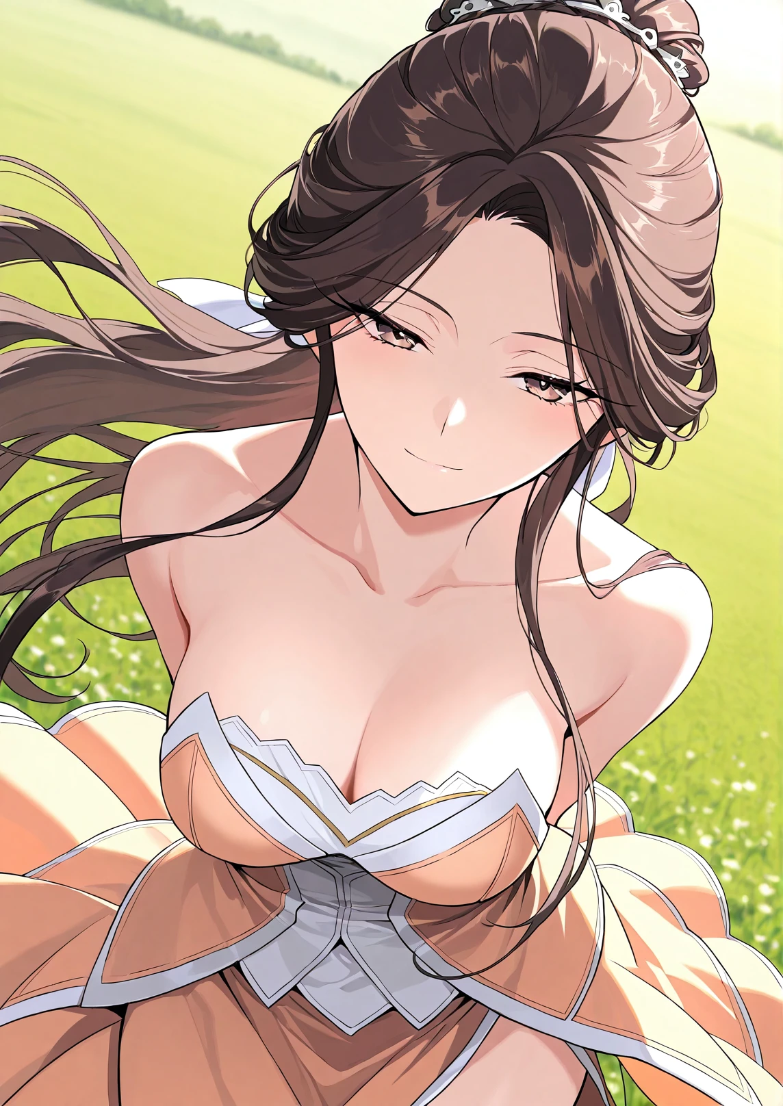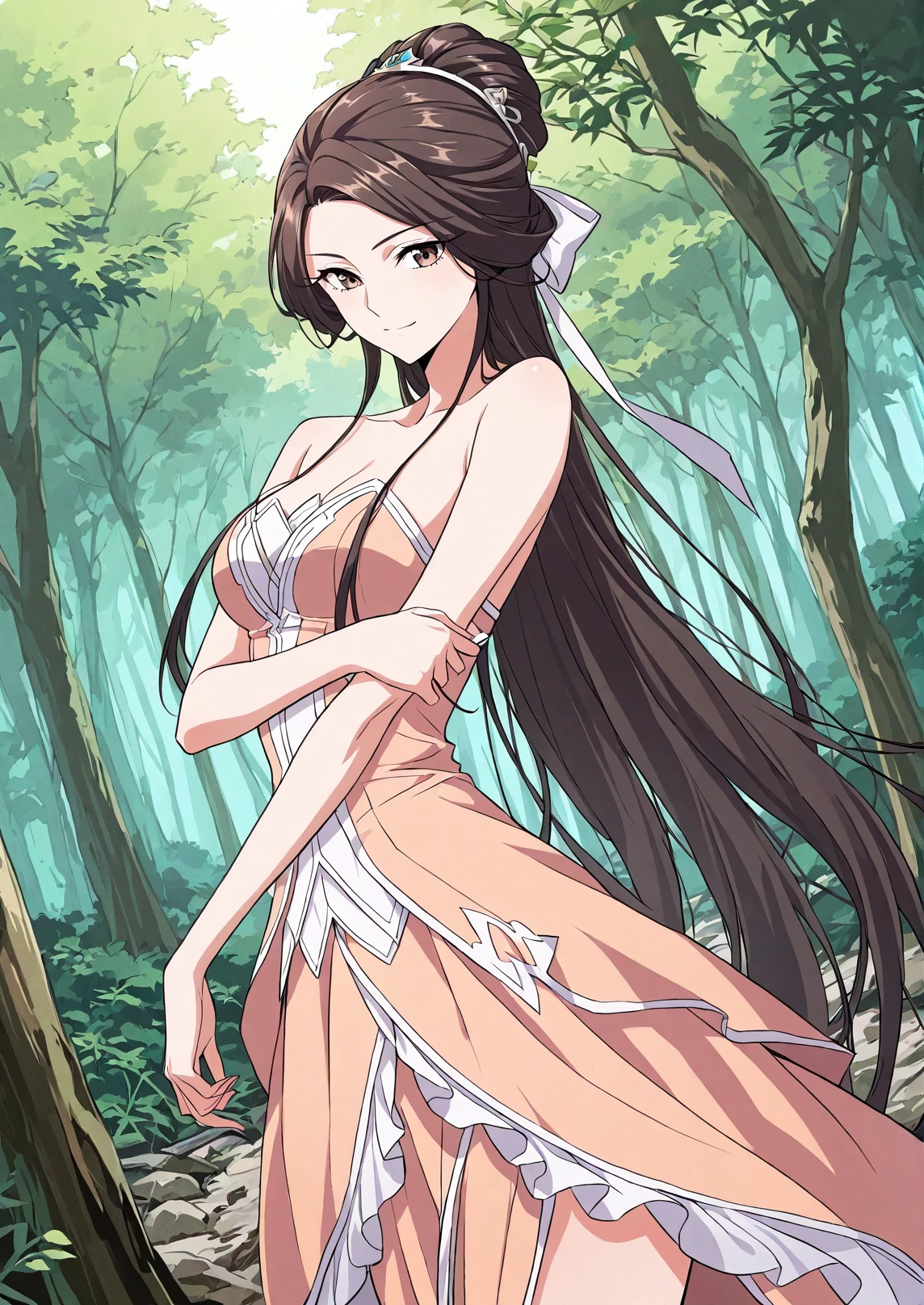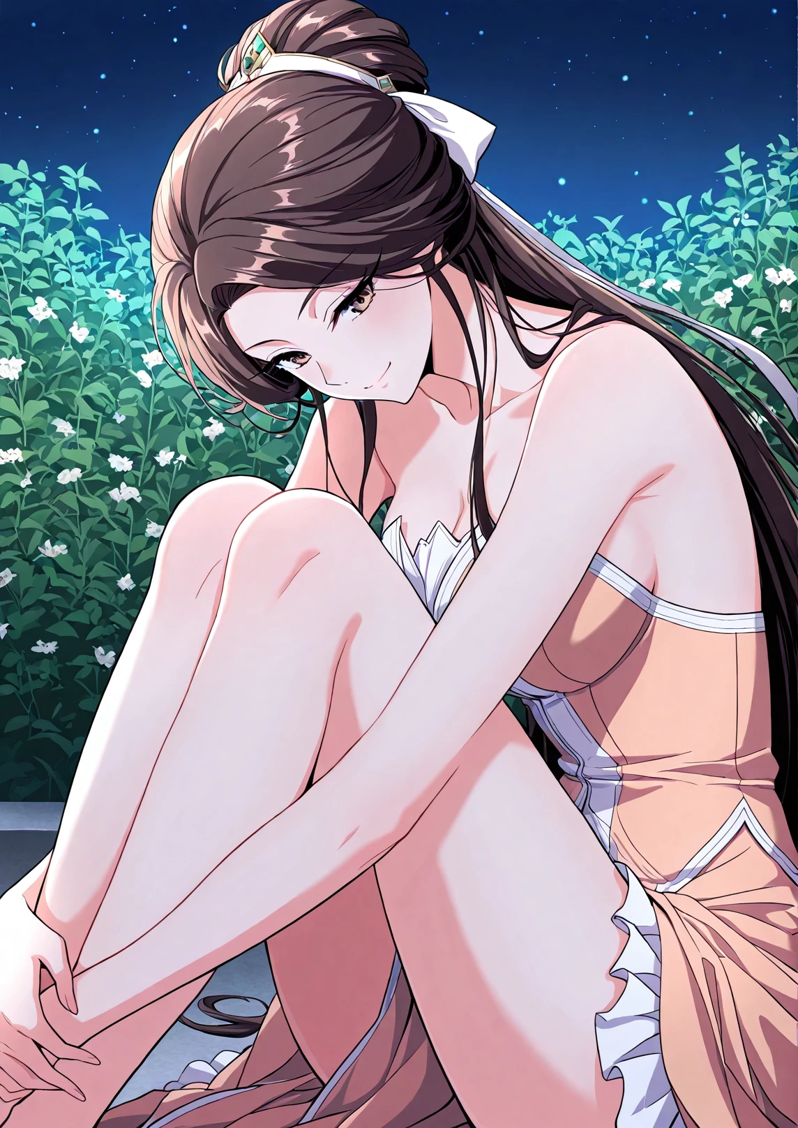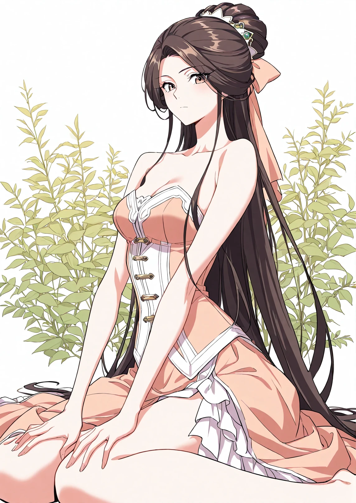 1 girl, solo, brown eyes, very long hair, dark brown hair, braided bun, long side strands, hair bow, long eyelashes,